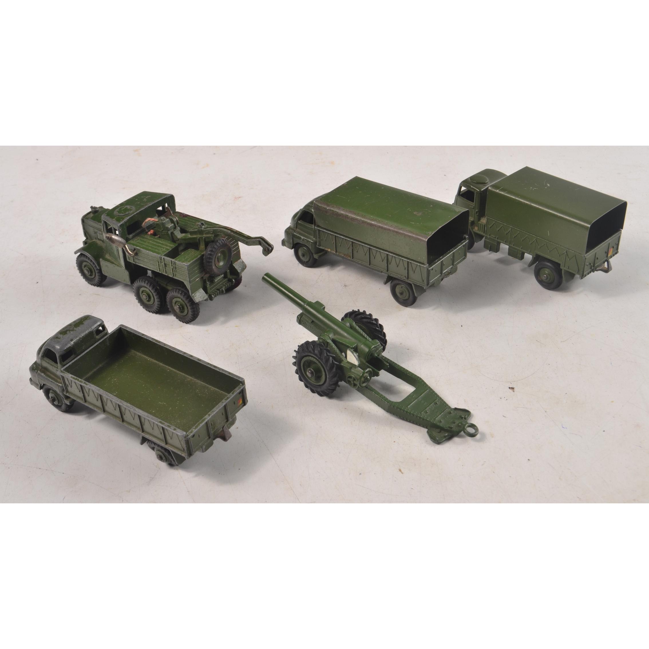 DINKY toys 1 x model 621 3-ton army wagon, 1 x model 623 army wagon, 1 x model 661 recovery tractor, 1 other army wagon with no Dinky label, 1 x model 693 field gun. All unboxed, and are in play-worn condition