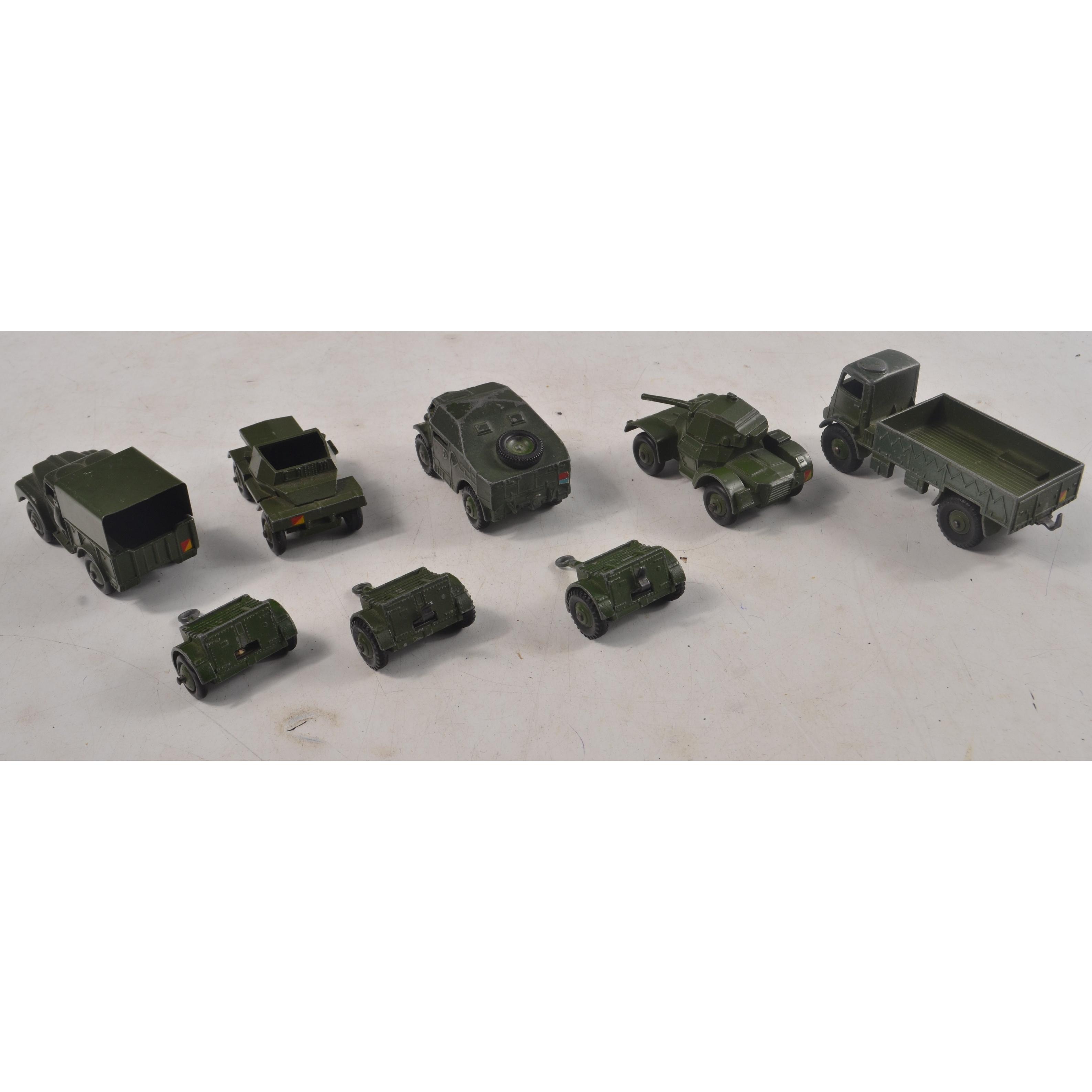 DINKY toys 1 x model 623 army wagon, 1 x model 641 army 1-ton truck, 1 x model 673 scout car, 1 x model 670 armoured car, 1 x model 688 field artillery tractor, 1 x model 687 25-pound trailer, 2 x 25 pr trailers. All unboxed, all in a play-worn condition.