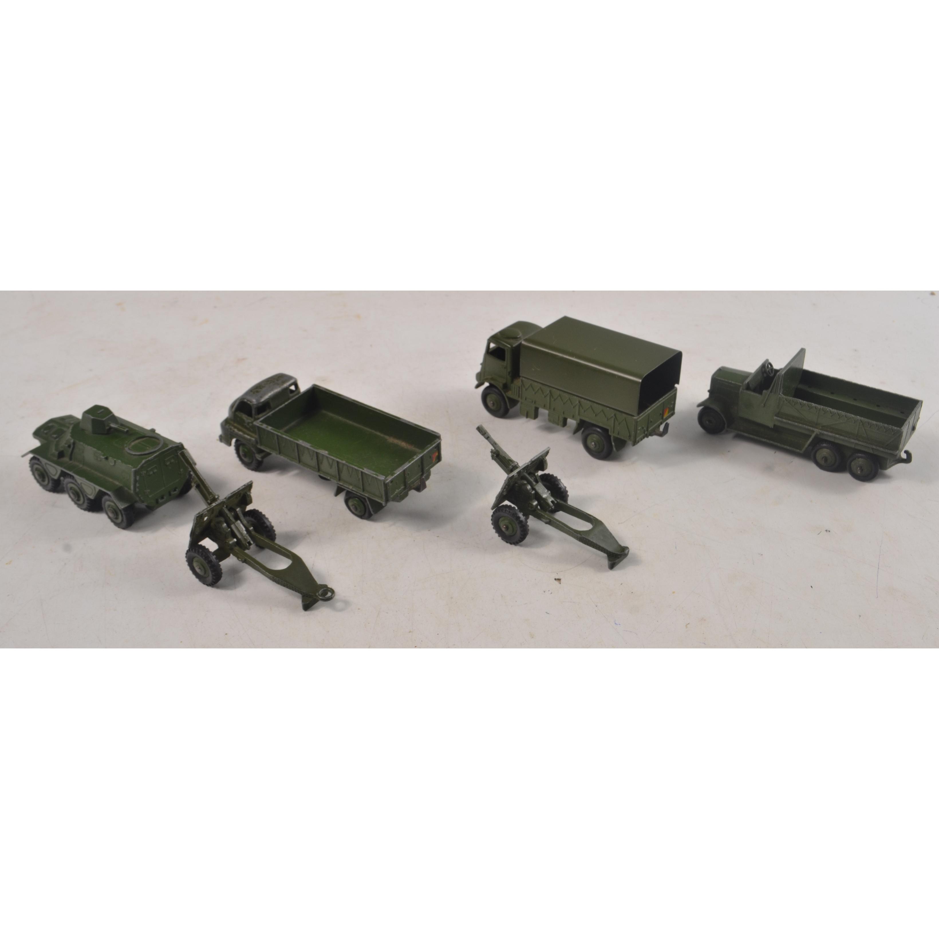 DINKY toys 1 x model 623, 1 x model 621 3-ton army wagon, 1 x army wagon (no model no.), 1 x armoured personnel carrier, 2 x 686 25 pounder field gun. All unboxed, and have been played with.