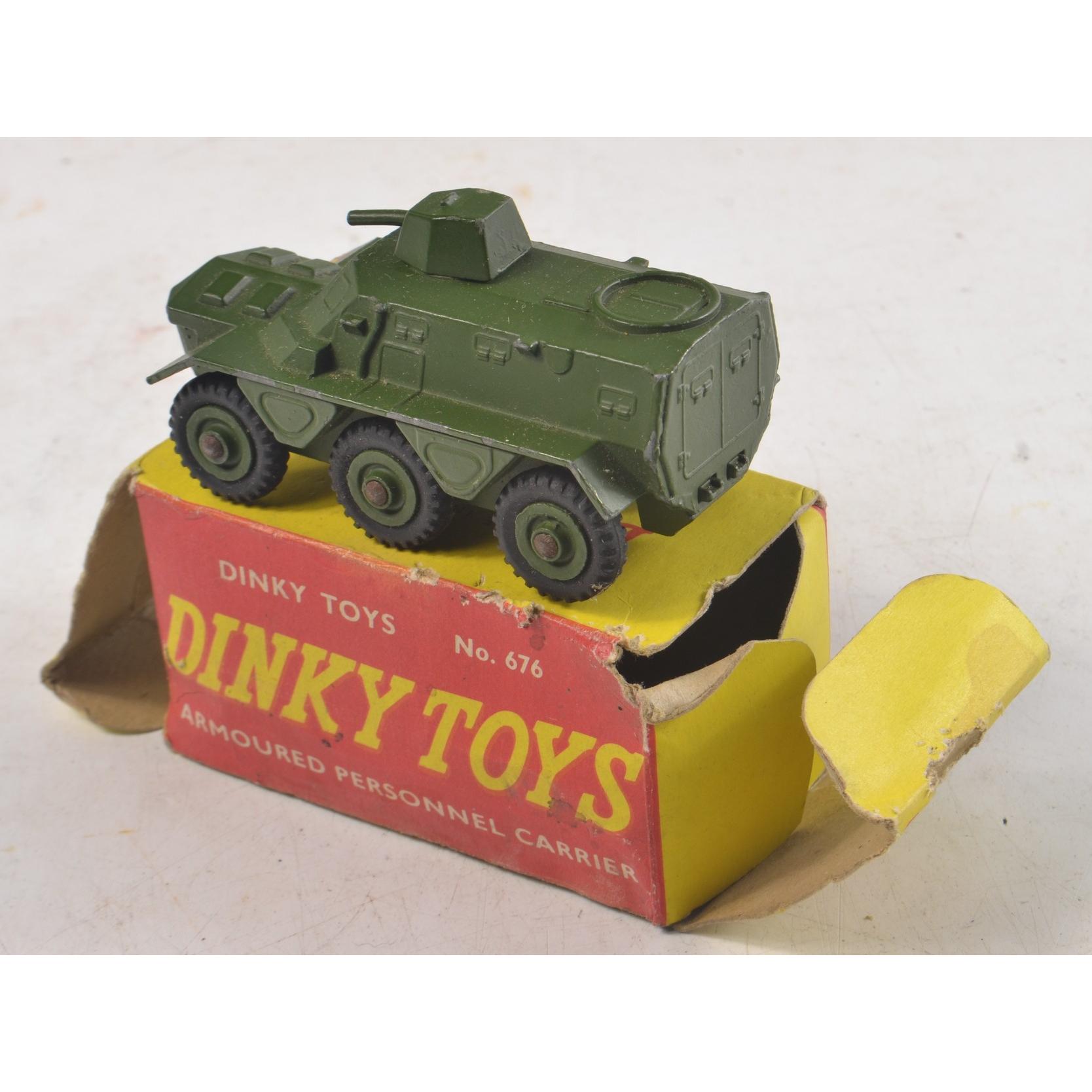 DINKY toy ARMOURED PERSONNEL CARRIER model 676. A few chips to the paintwork. Original box with some damage.