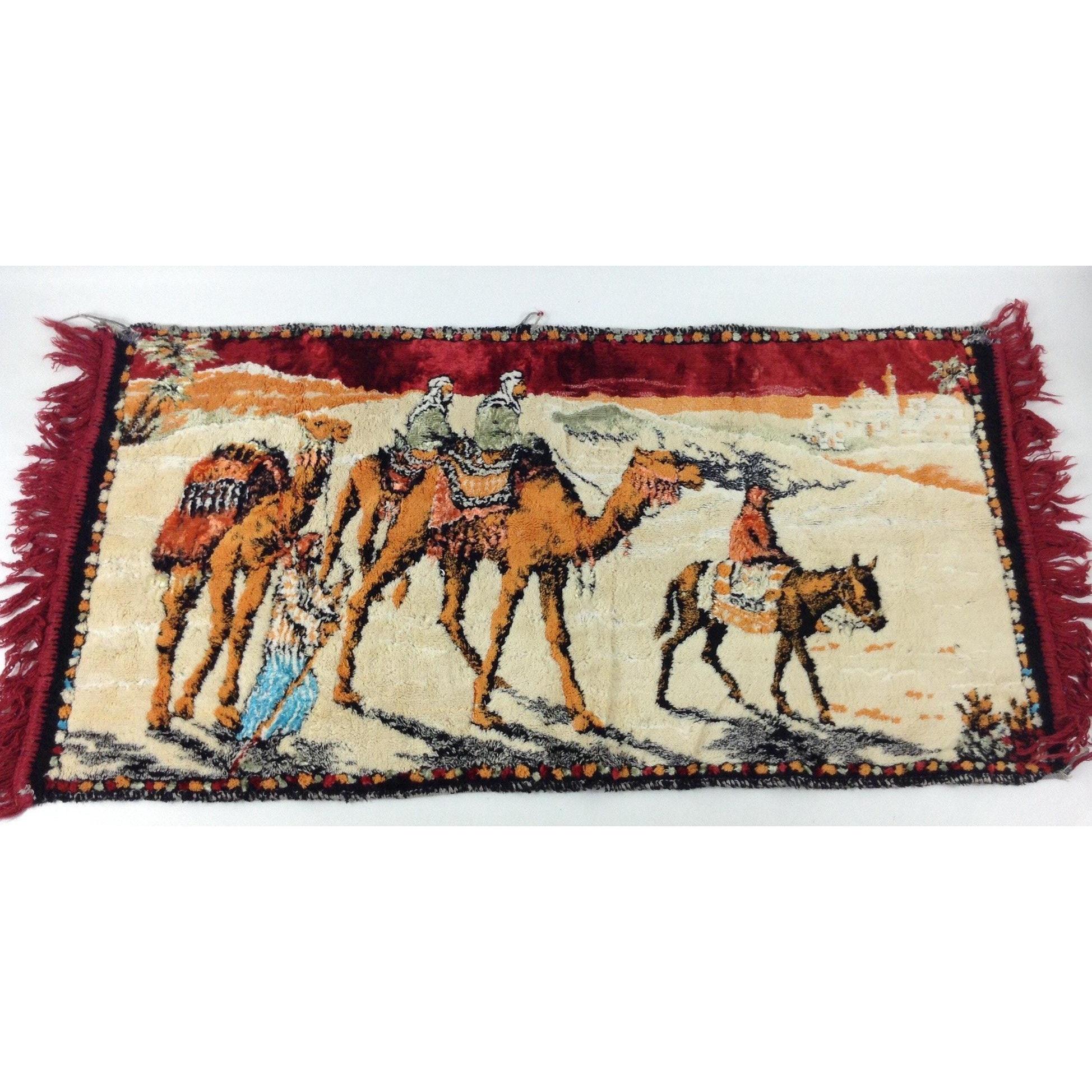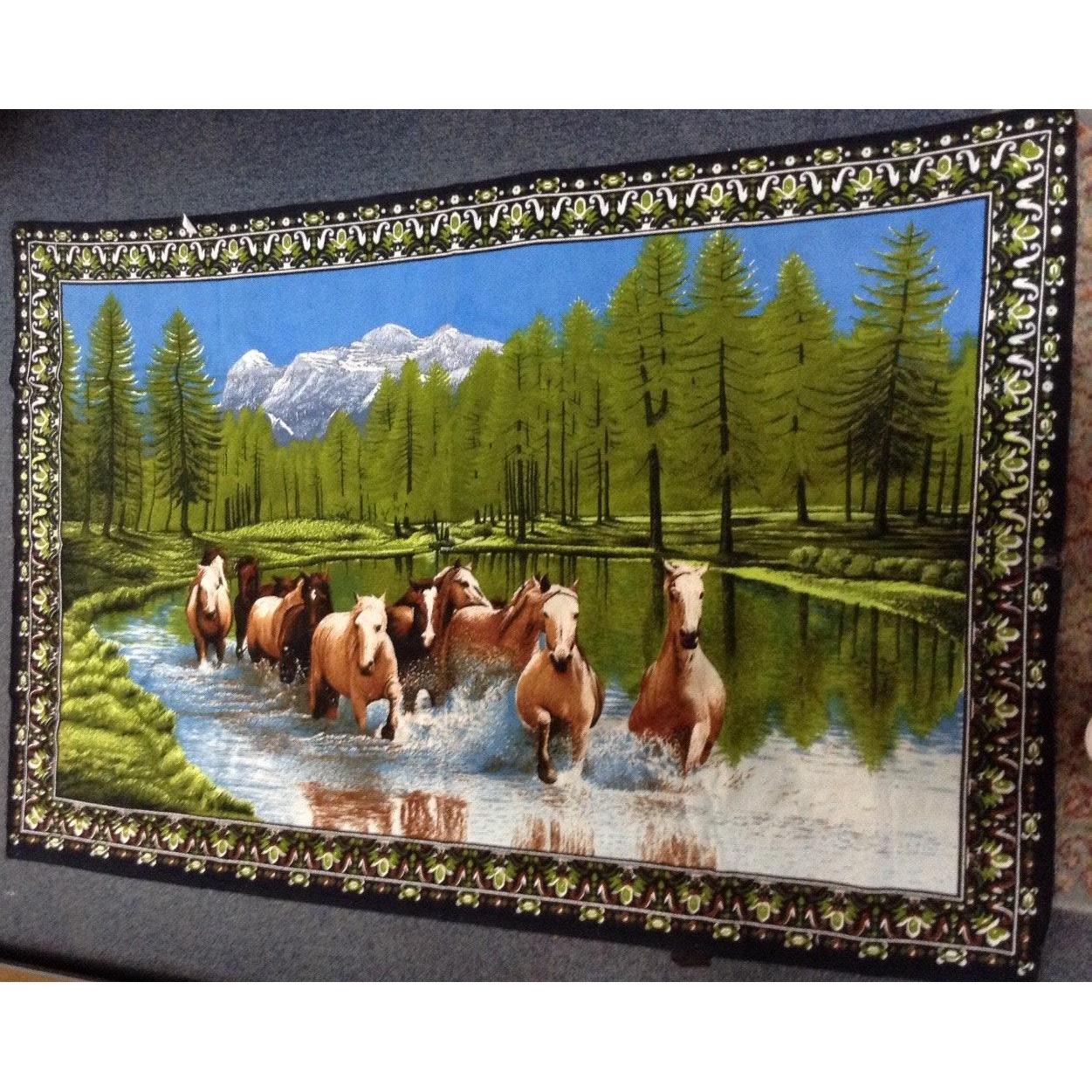 Two US made TAPESTRY AFGHANS 130x173cm one called 'Fillin' up on memories', the other is a winter scene of children ice-skating, plus a wall hanging of horses crossing a river 150x100cm and a prayer-mat size rug of riders with camels and a donkey