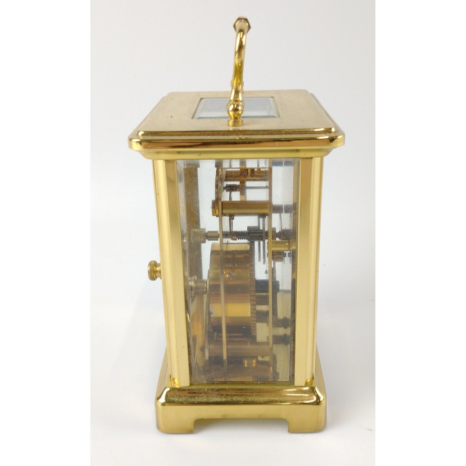 A quality BAYARD French gilt brass and glass 8 day carriage clock with a white surface with black painted roman numerals and painted hands. Inscribed 'Bayard', '8 Day' and 'Made in France' The clock back plate is inscribed 'DUVERDREY & BLOQUEL', French Makers. The clock movement has 7 jewels