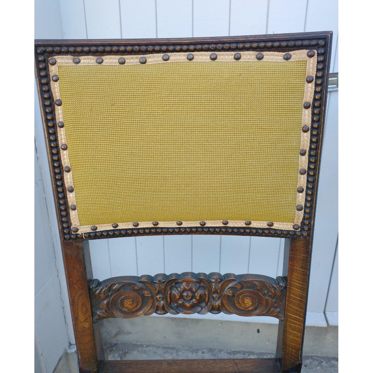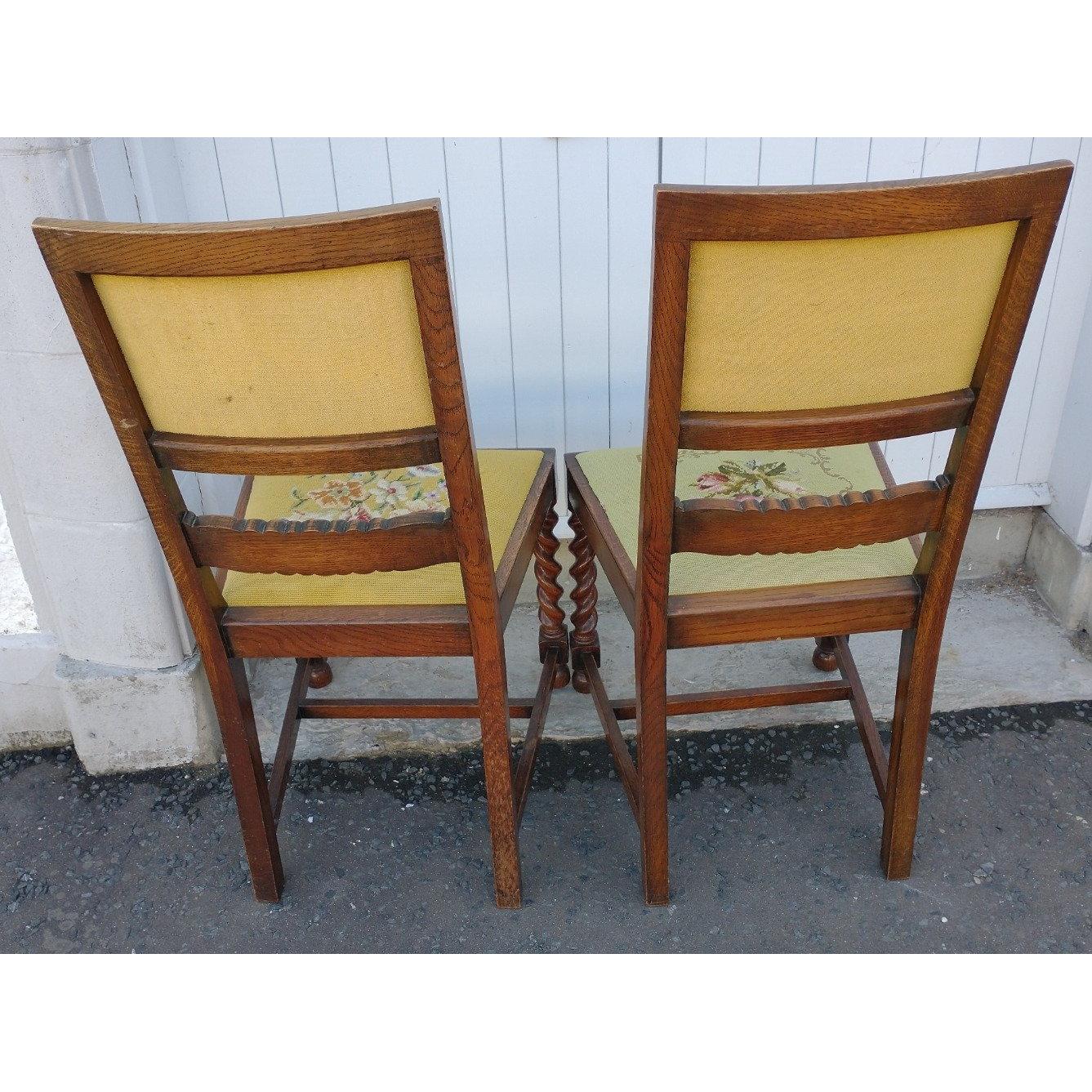 A pair of vintage wooden dining chairs with handworked tapestry back panels and seats with a floral pattern, further decorated with carved backs and barley twist legsApprox 2 pieces