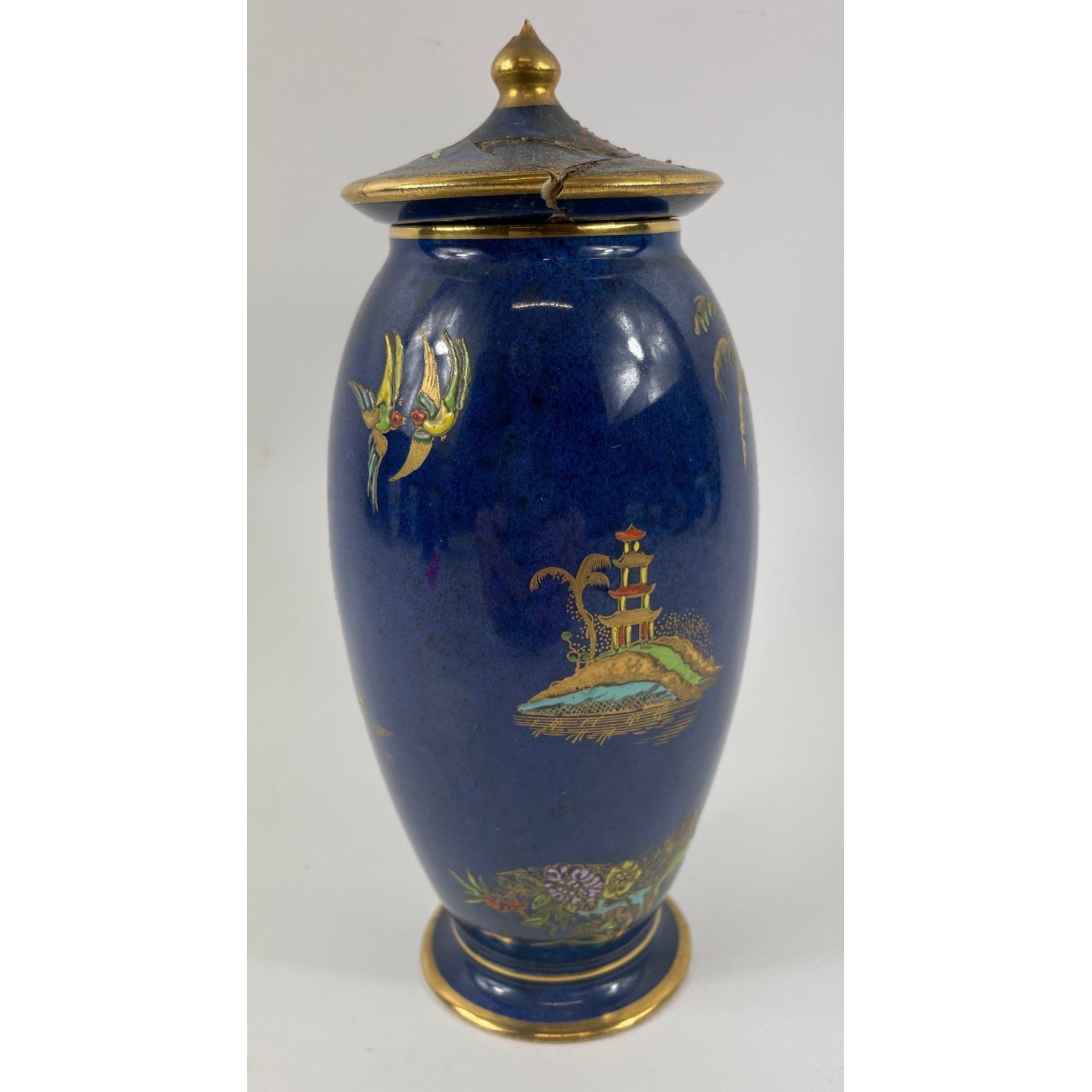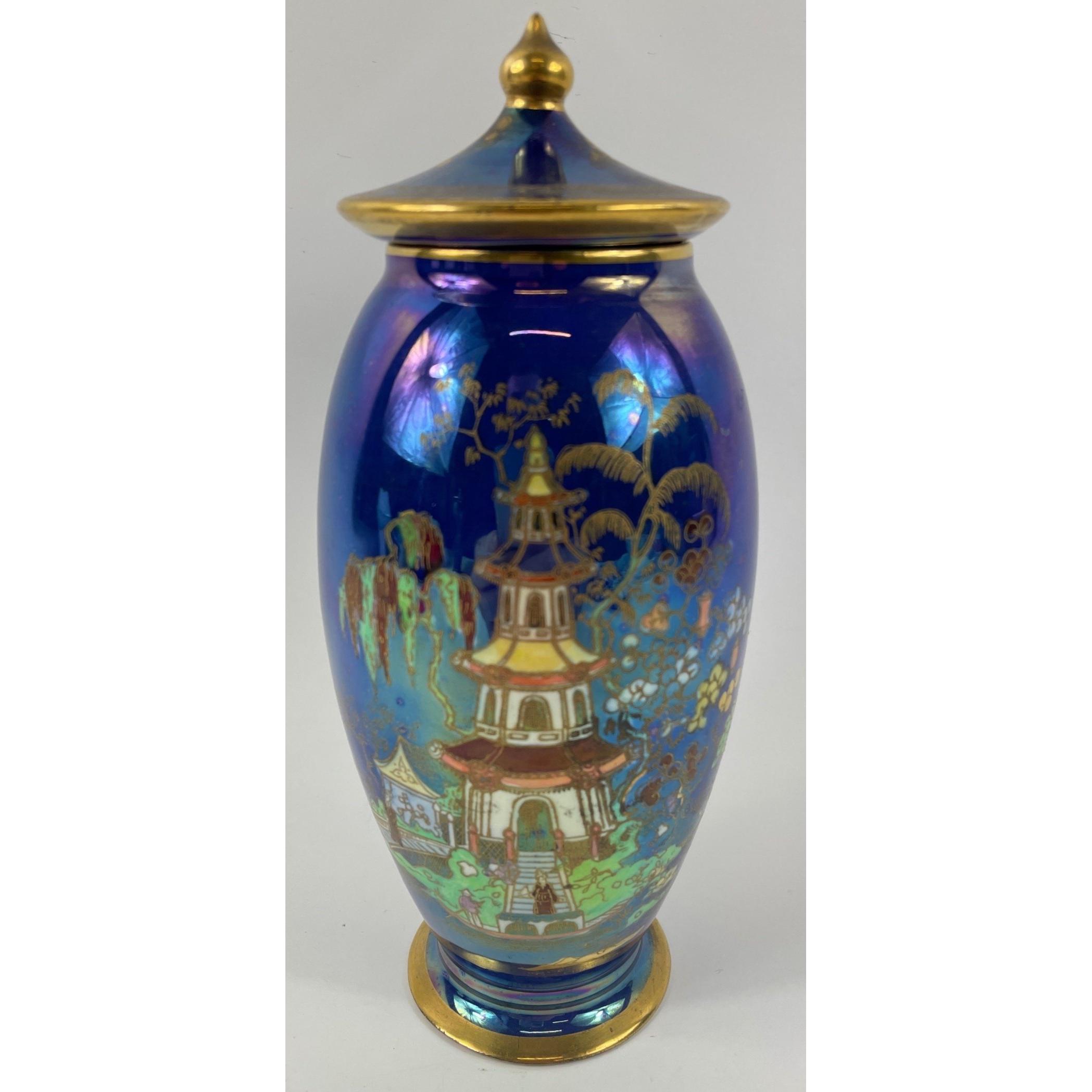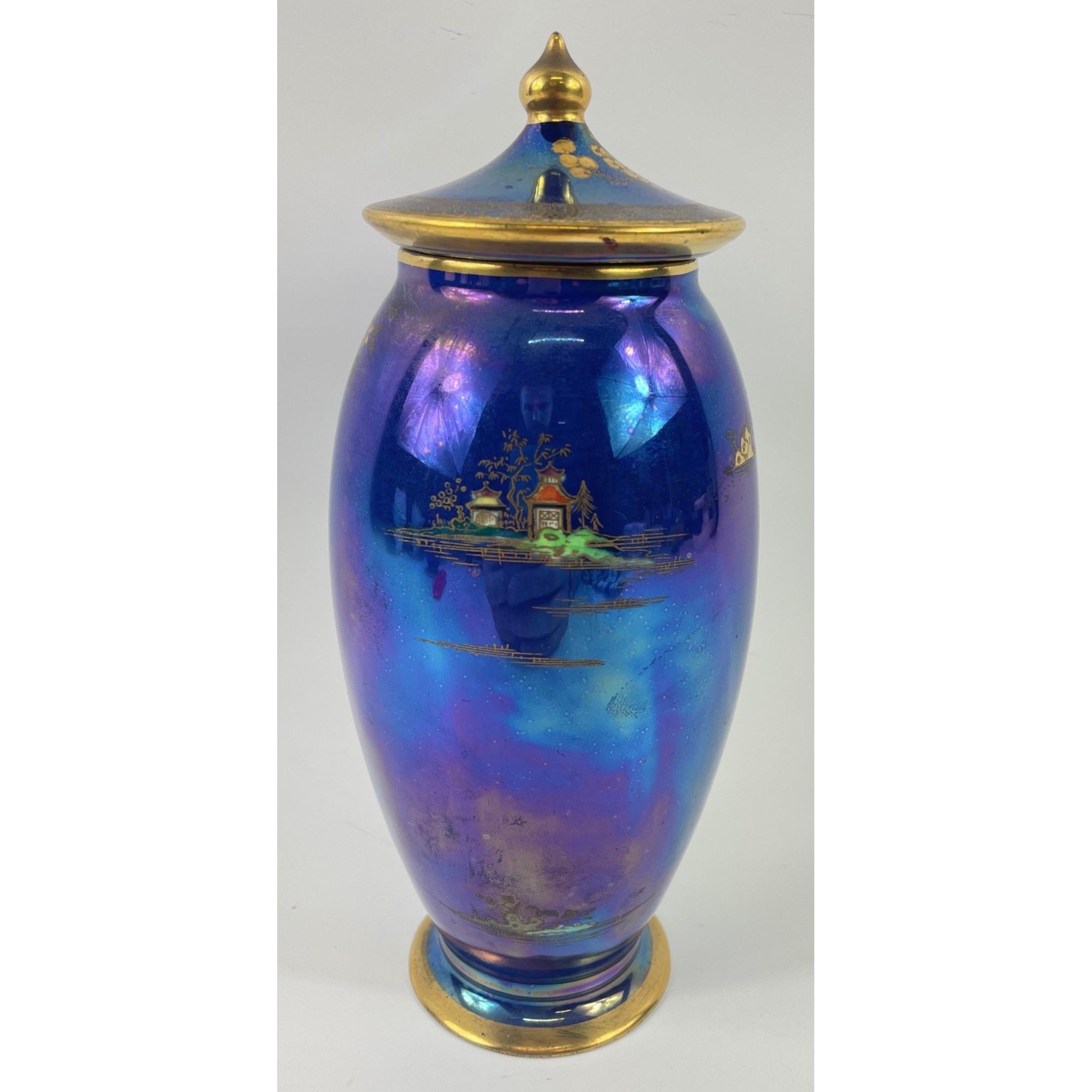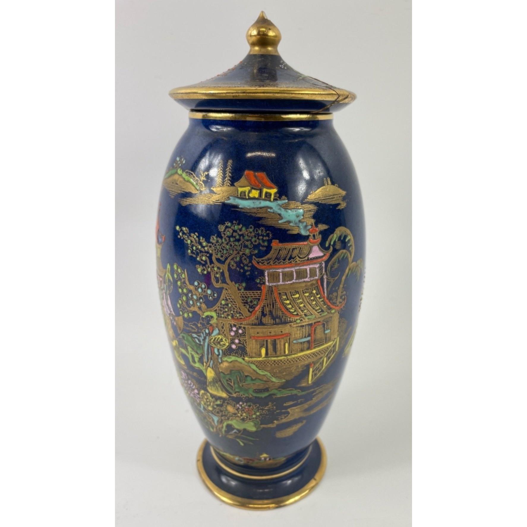 A pair of vintage CARLTON WARE lustre vases with lids (one has been damaged and repaired), height 19cm with a pattern of a pagoda and boats, plus a milk glass posy vase in blue with a raised gilt pattern and flowers 19cm high
