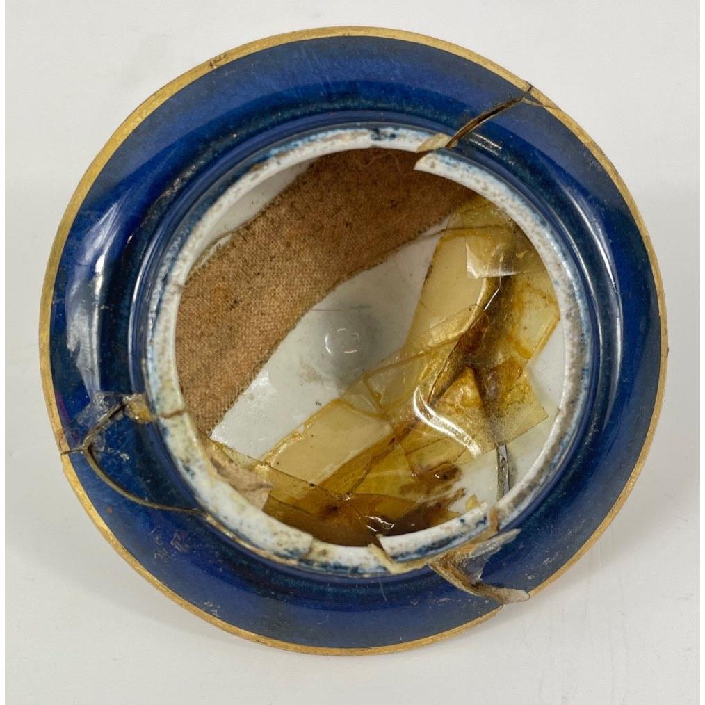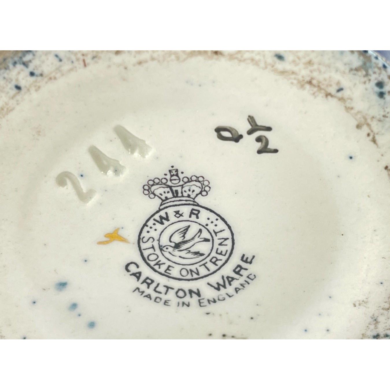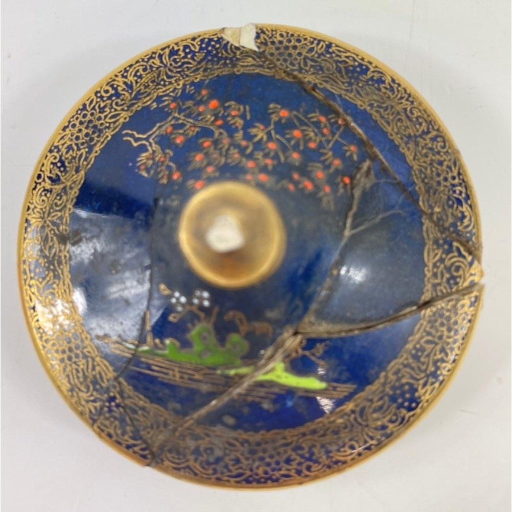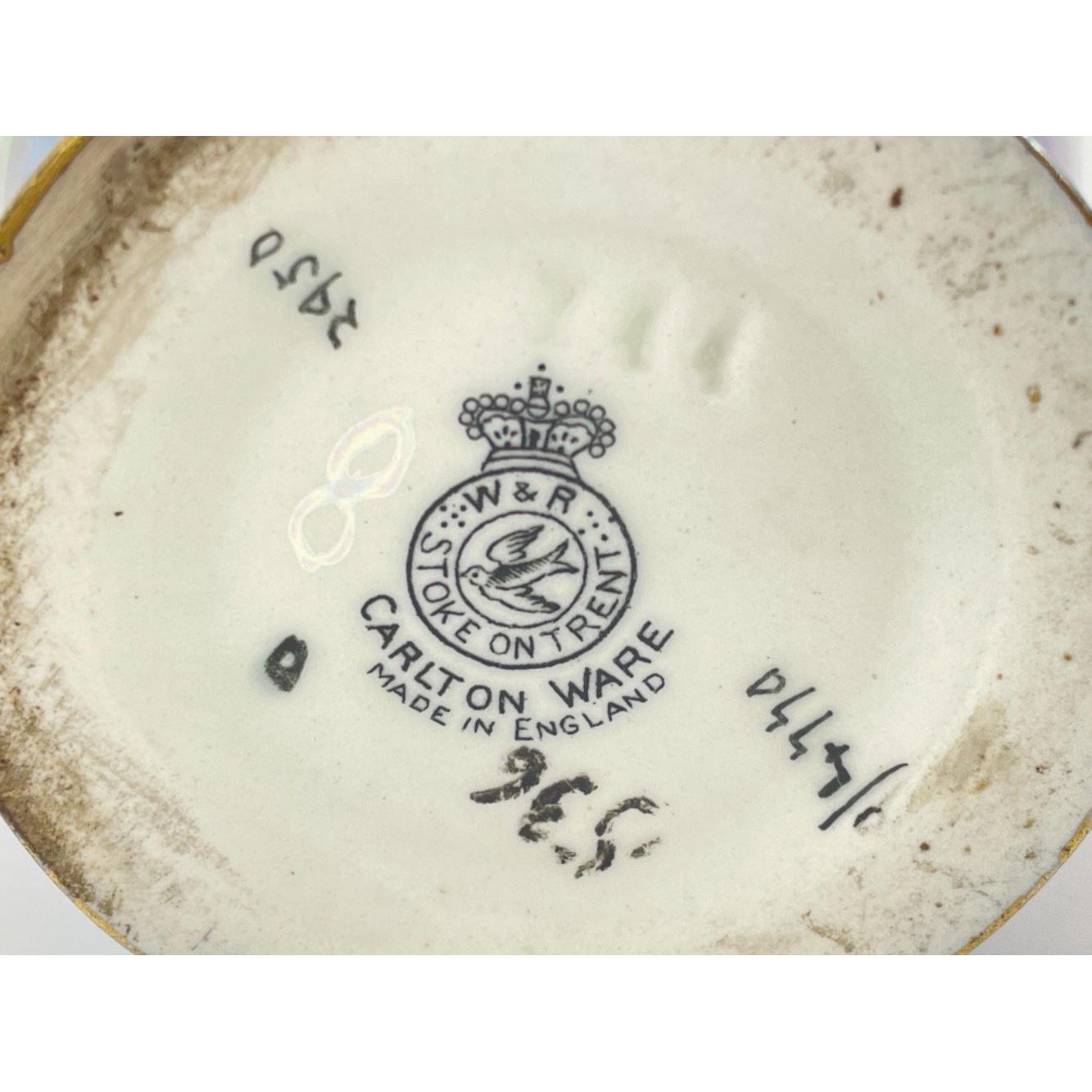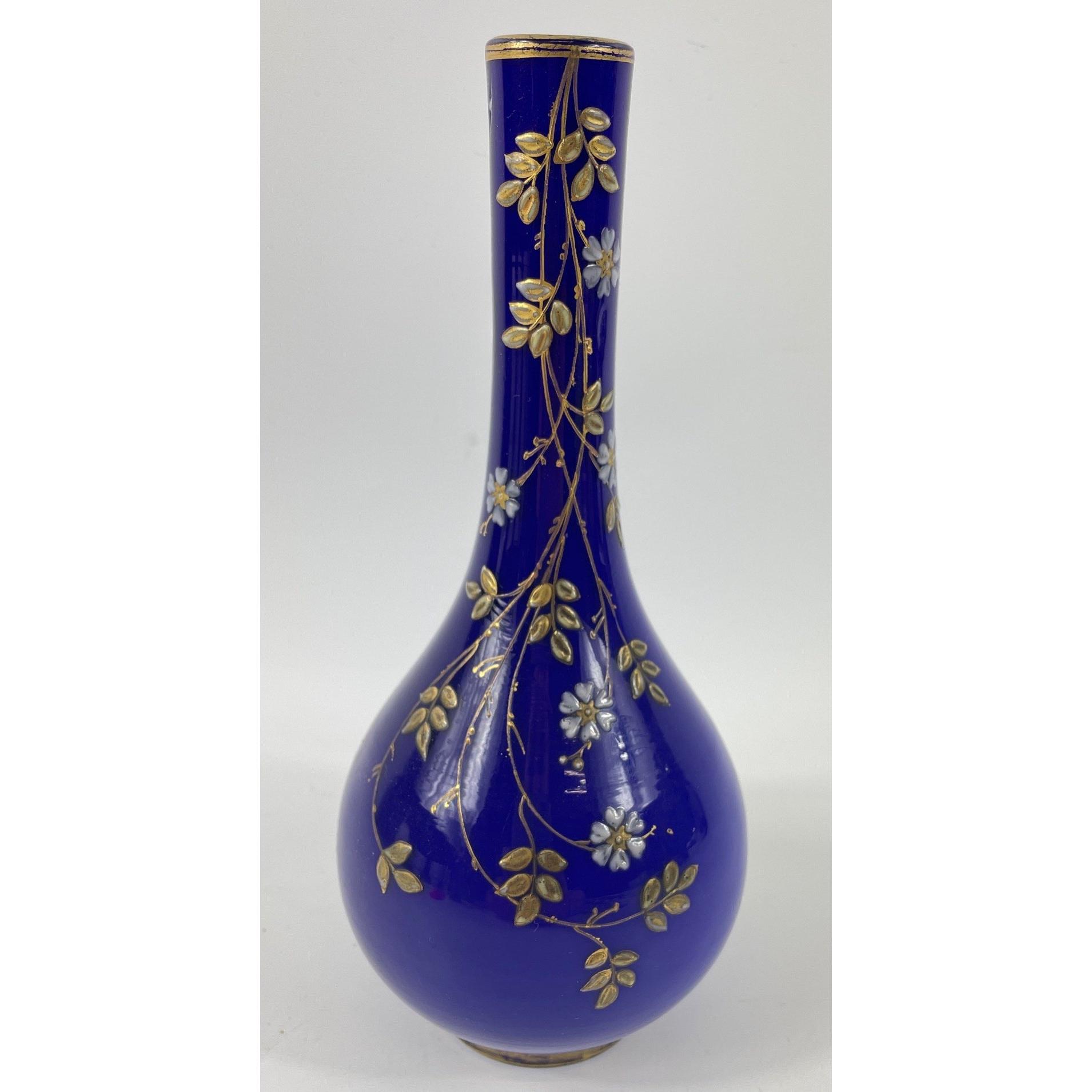 A pair of vintage CARLTON WARE lustre vases with lids (one has been damaged and repaired), height 19cm with a pattern of a pagoda and boats, plus a milk glass posy vase in blue with a raised gilt pattern and flowers 19cm high
