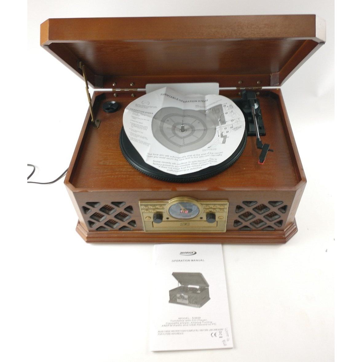 A ZENNOX music centre model D3939 comprising a turntable with CD player, cassette player, analog tuning AM/FM radio and USB record to PC with operation manual, measures 46x32x20cmApprox 1 pieces