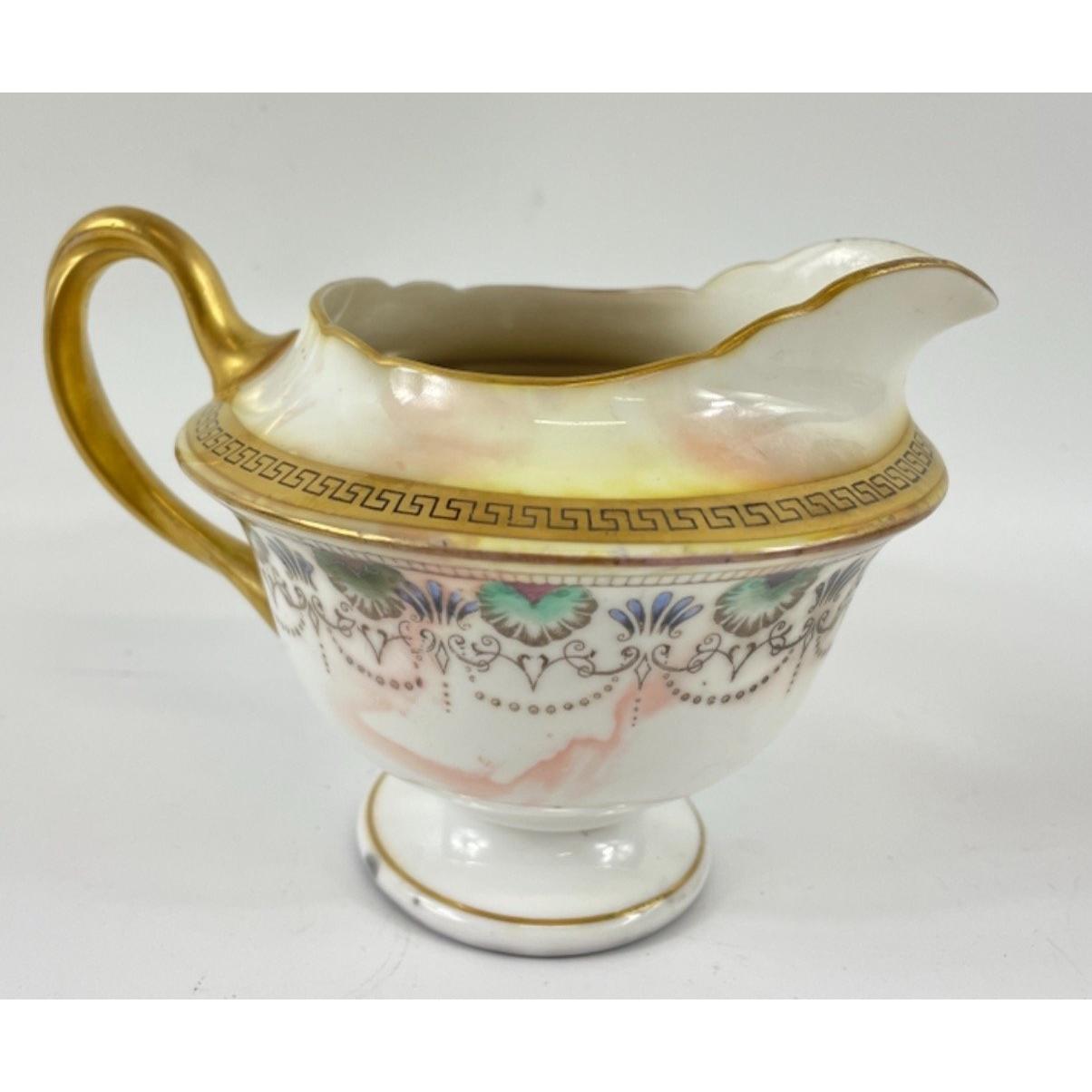 A VINTAGE SHELLEY china tea service with a gilt Greek key trim to include 9 teacups with a pedestal base, 12 saucers, 12 side plates, 2 sandwich plates, 1 sugar bowl, 1 milk jug (with crack and damage to pattern) and a teapot with 3 cracks to rim