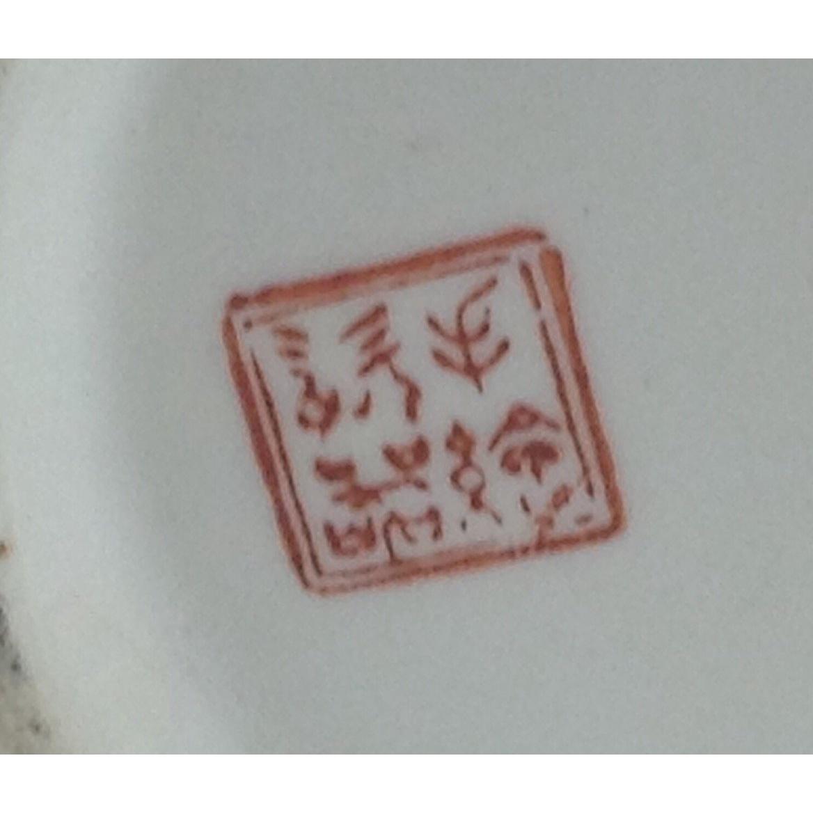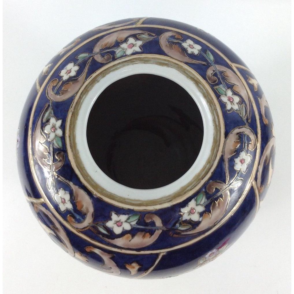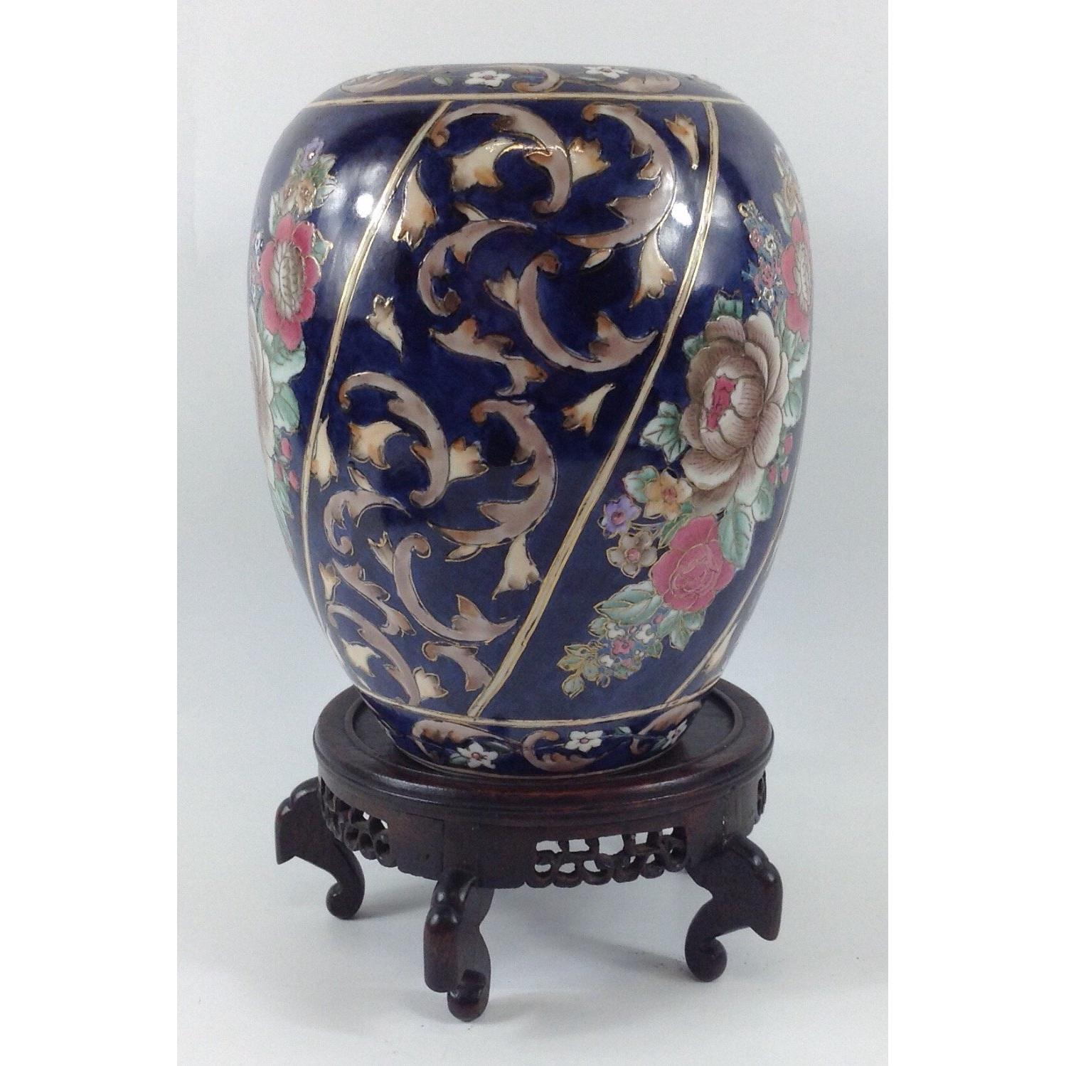A large Chinese blue floral vase on a wooden stand, vase measures 22cmH, 18cm W, stand measures 8cmH and 16.5cm DiaApprox 2 pieces