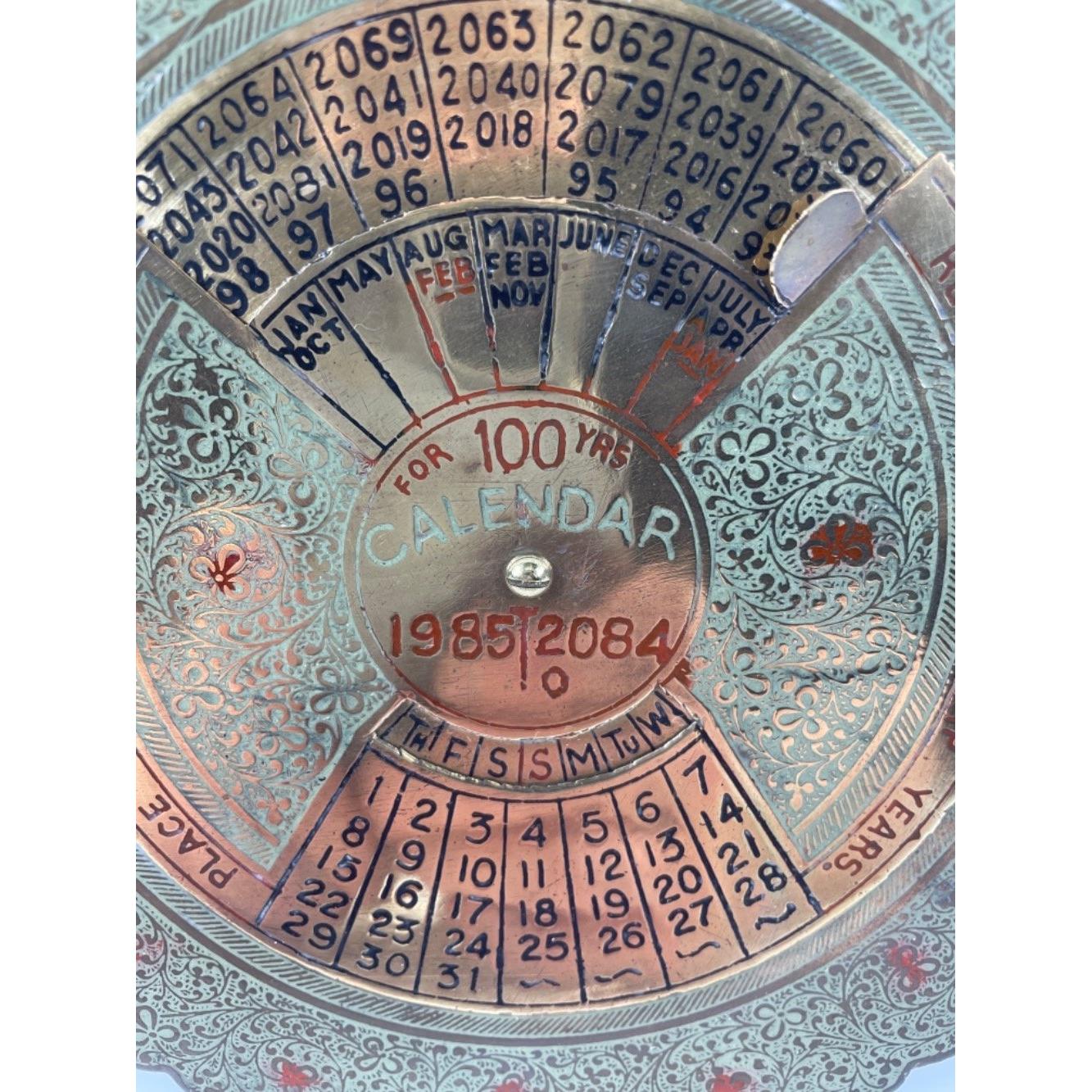 A brass perpetual calendar for 100 years 1985-2084, 17cm dia.