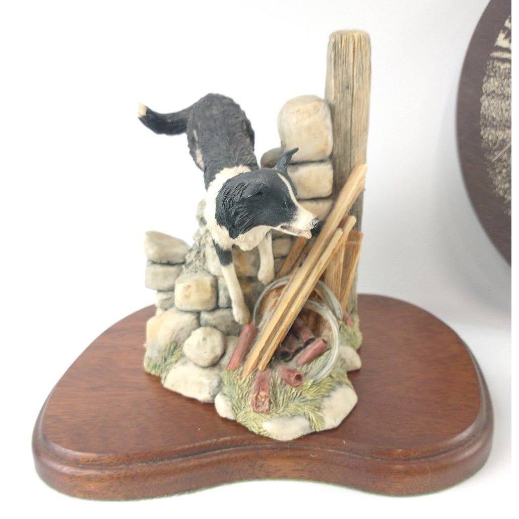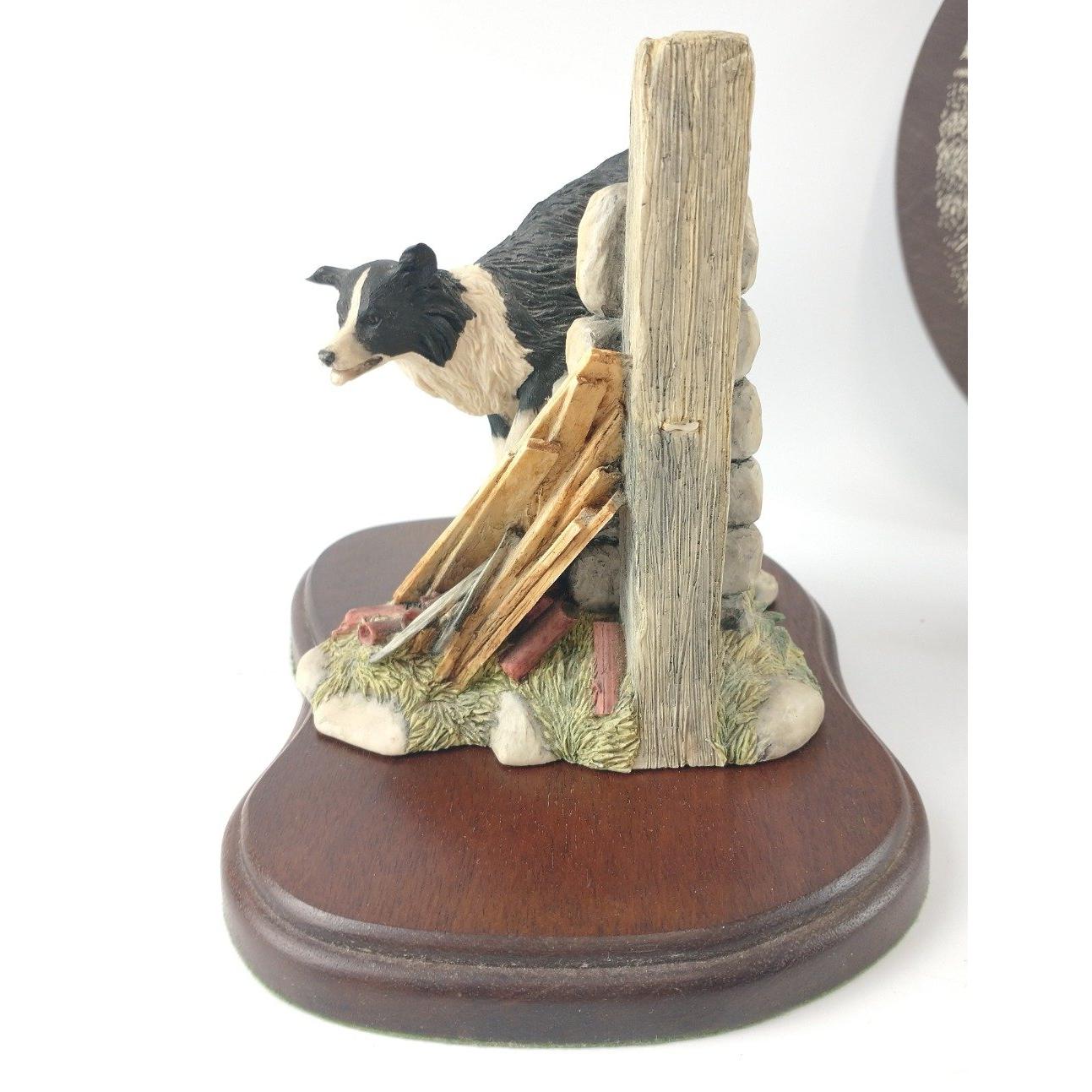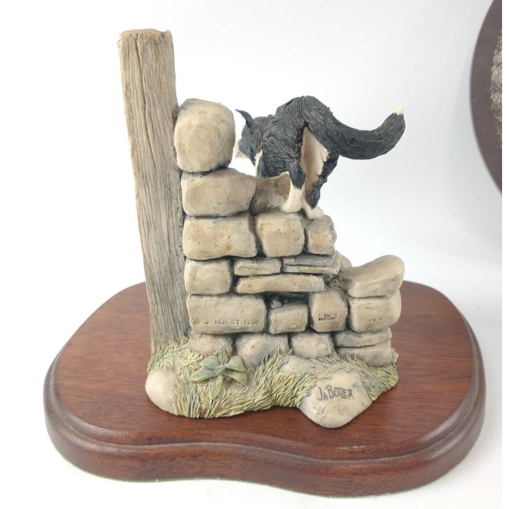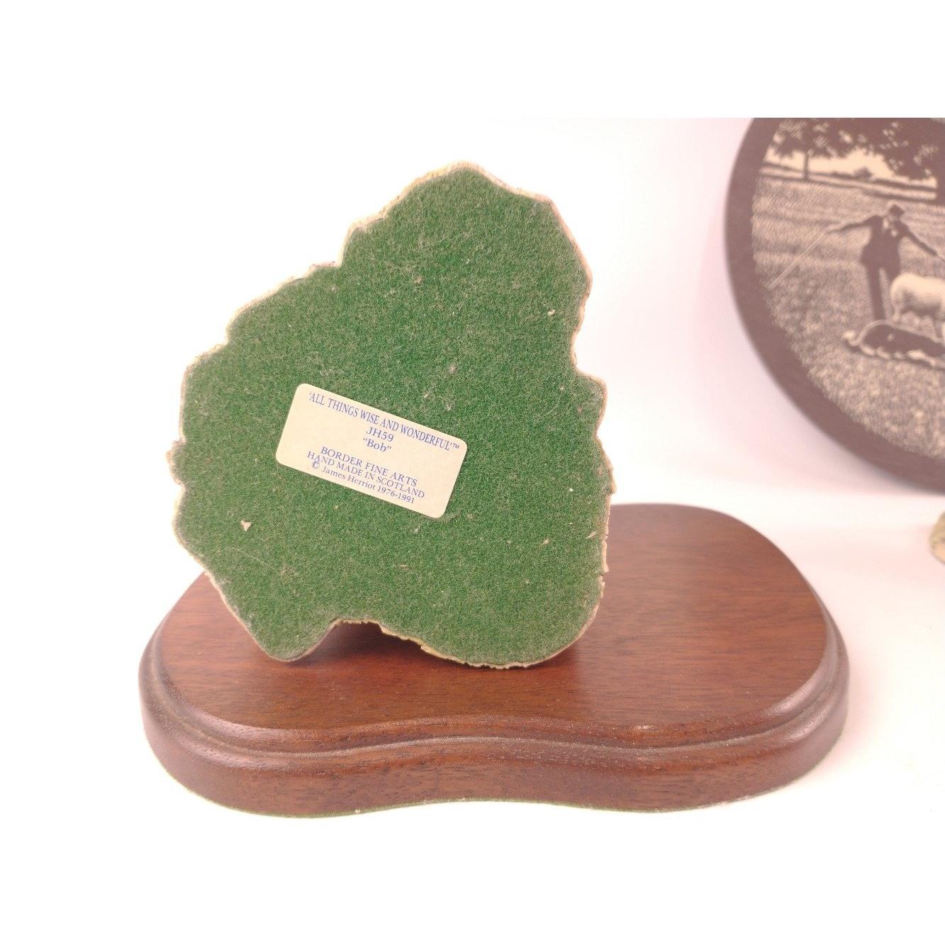 A Border Fine arts collie dog figurine by JA BUTLER from the James Herriot Collection copyright 1990, 'All things wise and wonderful' JH59 "Bob" one figure standing approx 15cm high, the other standing 7cm plus a slate wall plaque of a farmer in the field with sheep and collie 23cm dia