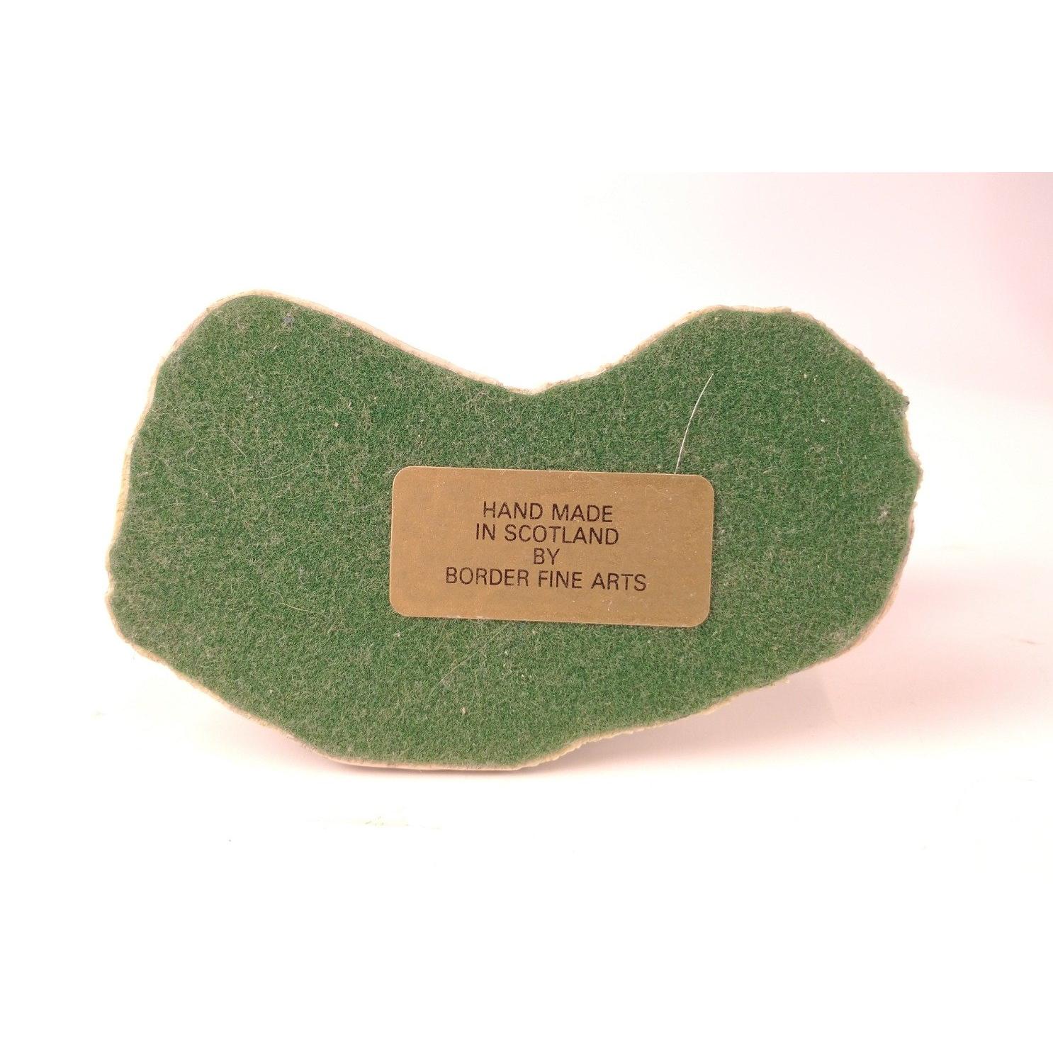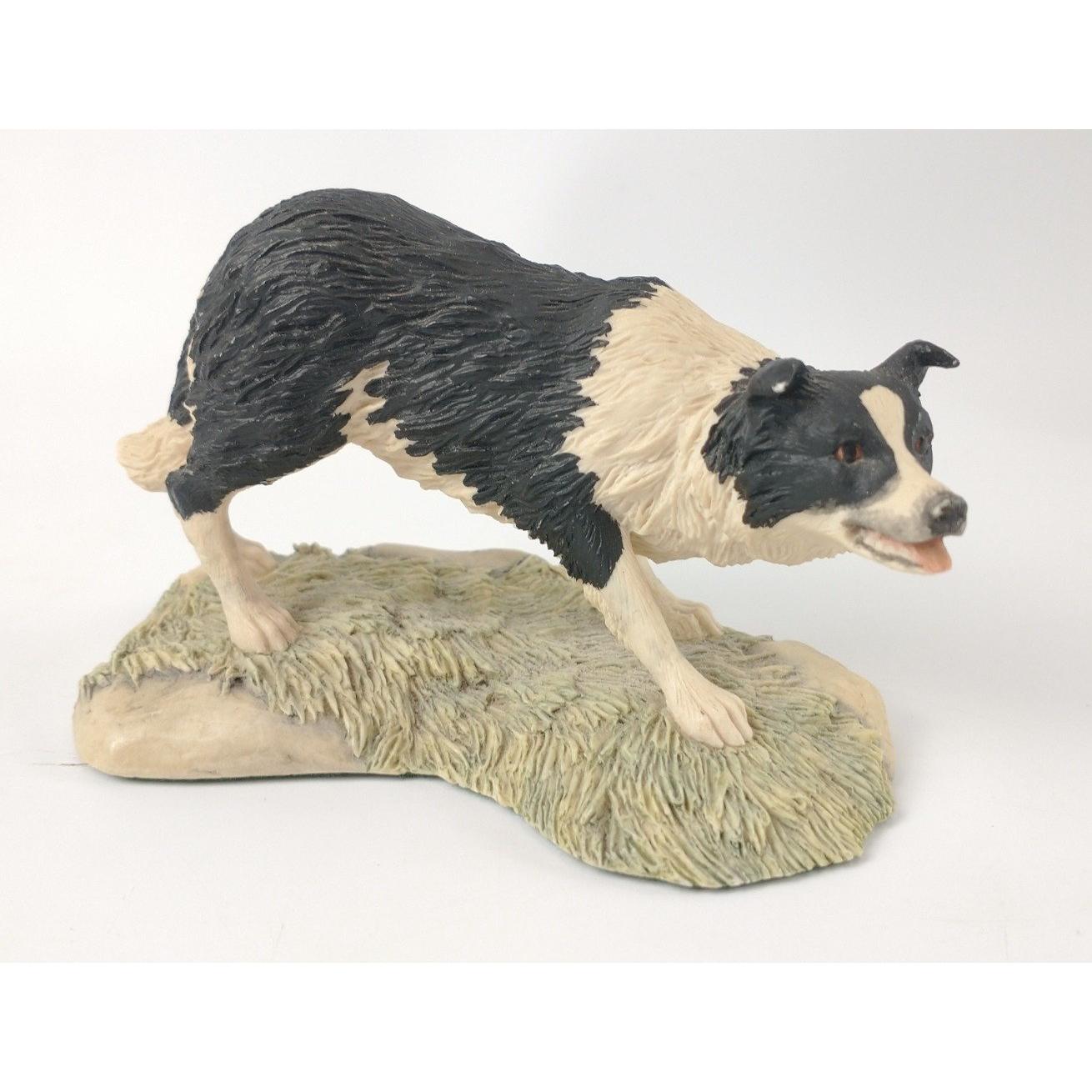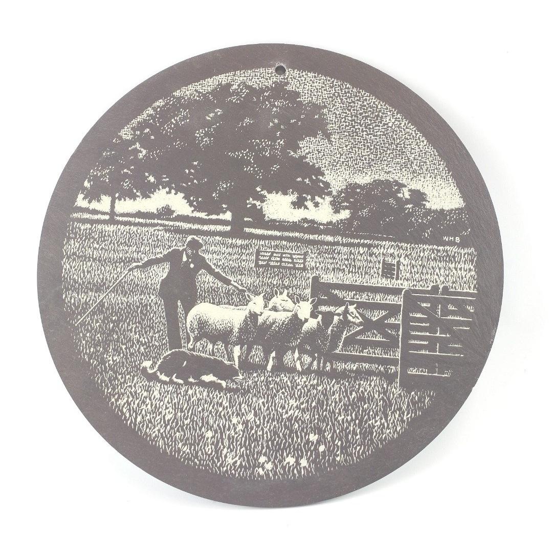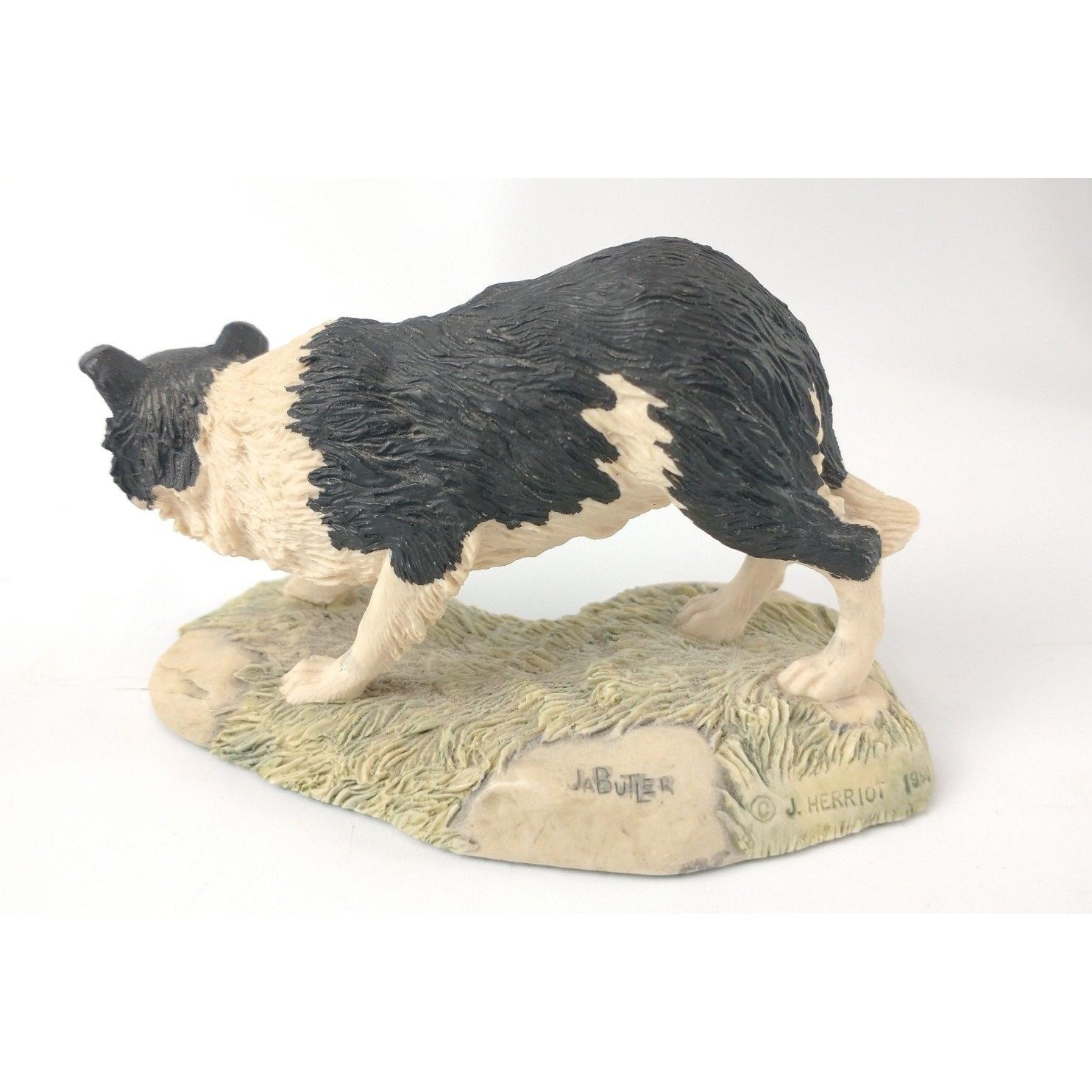 A Border Fine arts collie dog figurine by JA BUTLER from the James Herriot Collection copyright 1990, 'All things wise and wonderful' JH59 "Bob" one figure standing approx 15cm high, the other standing 7cm plus a slate wall plaque of a farmer in the field with sheep and collie 23cm dia