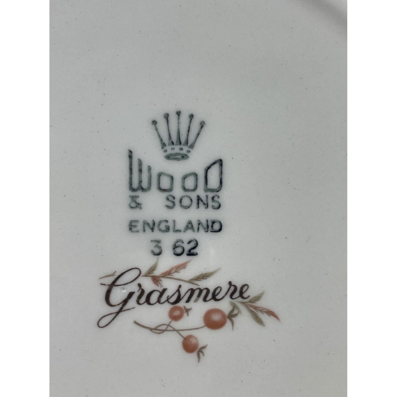 A part WOOD and SON GRASMERE dinner service to include 6 x 25cm plates, 6 x 23xm plates (2 with a small chip to rim), 1 x 20cm plate, 3 double-handled soup bowls, 1 sauceboat with underplate, 1 ashet (31cm), 6 saucers, 2 lidded serving dishes (26cm wide)