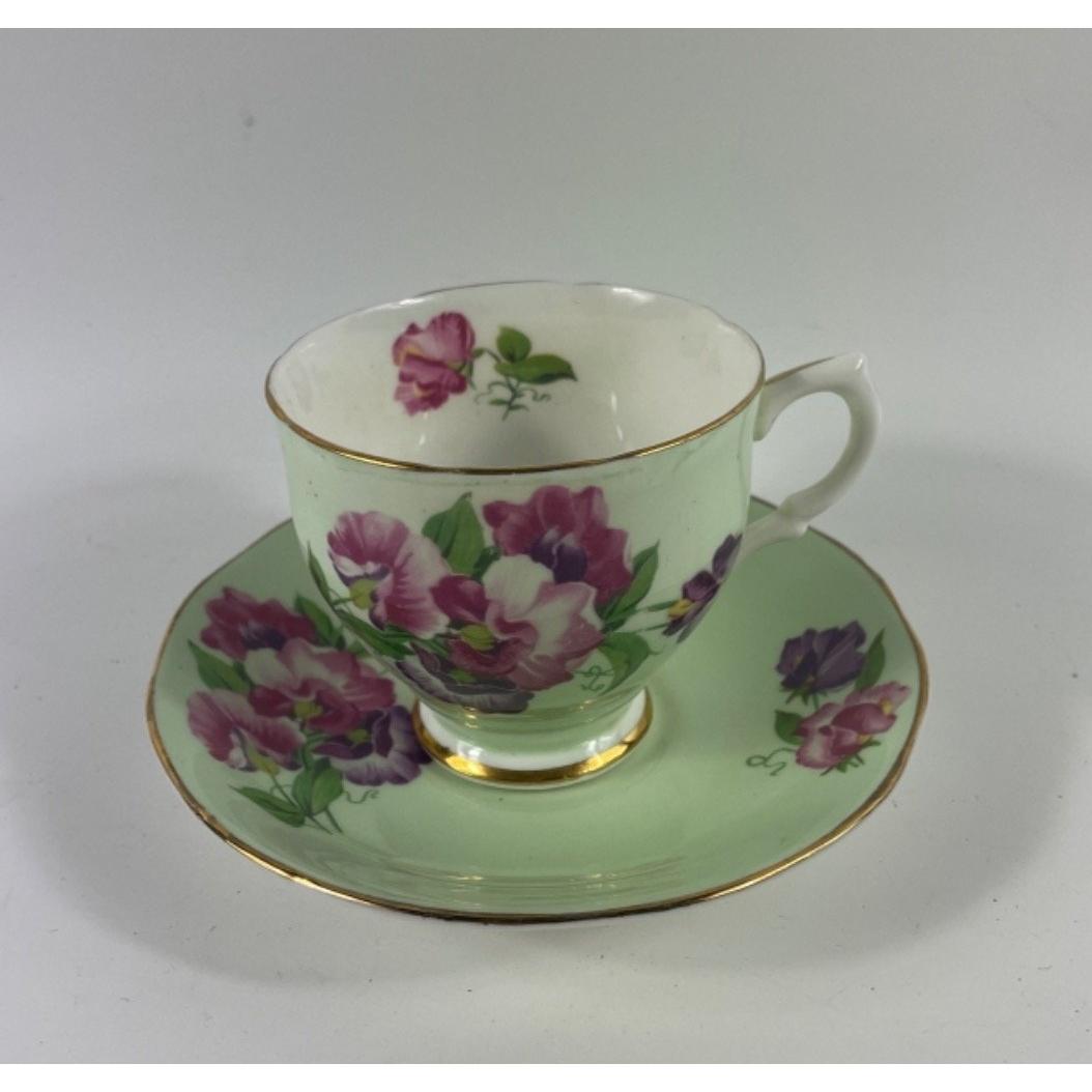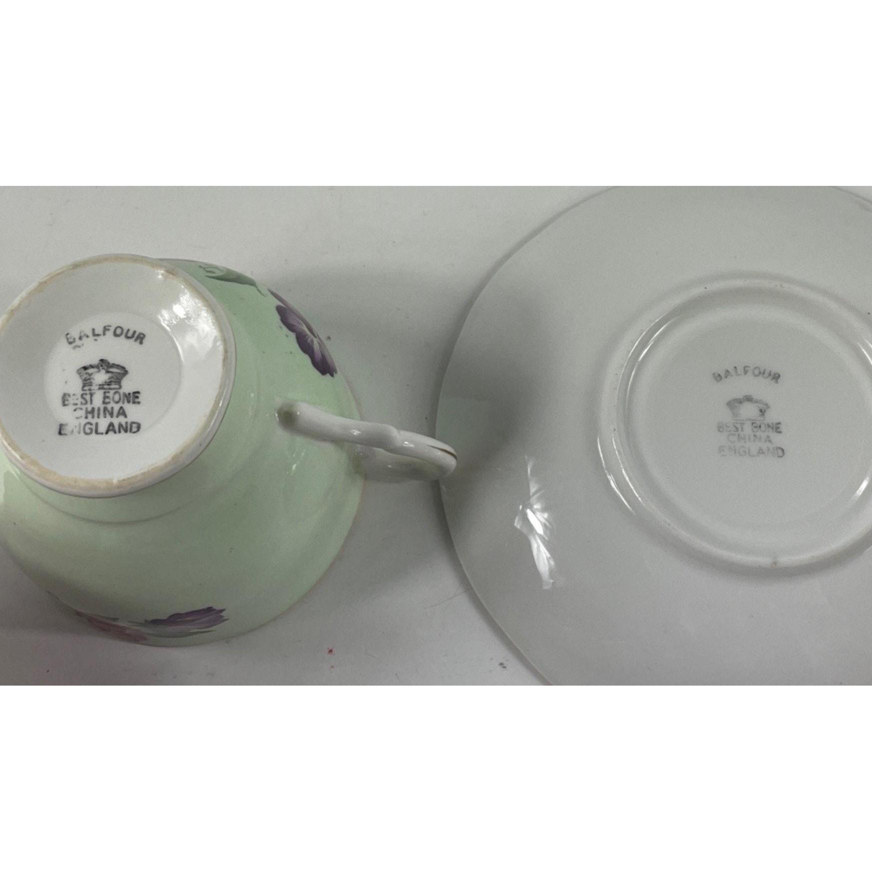 A nice c1950's BALFOUR fine bone 6 cup, 6 saucer, 6 side-plate cream and sugar with sandwich plate (25cm diameter) china tea service in pale green with pink and purple floral design 23 pieces in total