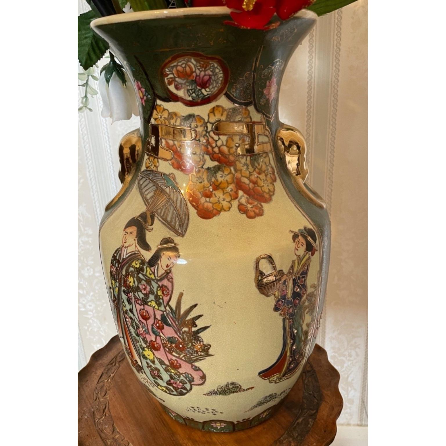 An ORIENTAL large themed vase 38cm high and complete with expensive silk colourful faux flowers height with flowers 80cm tall approx