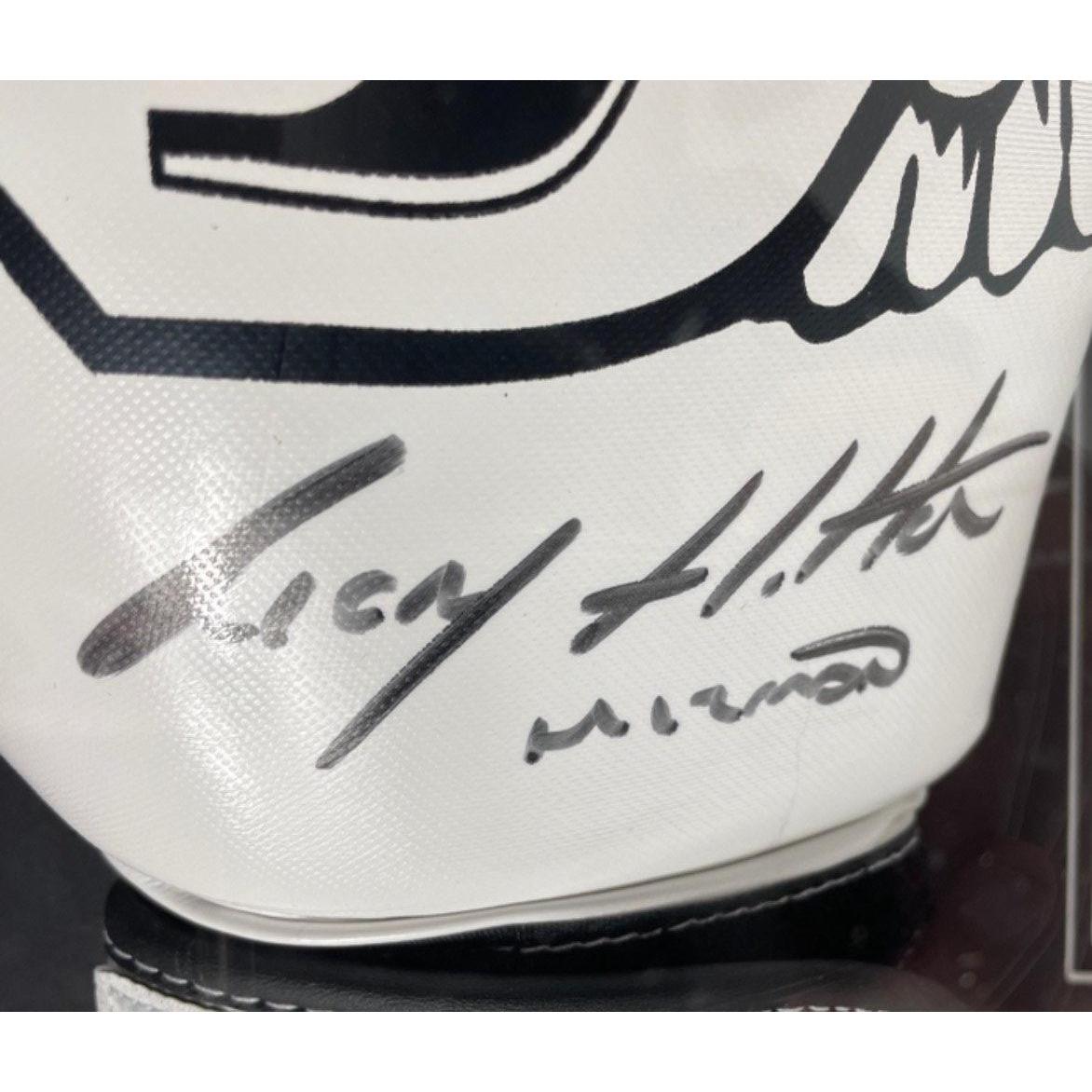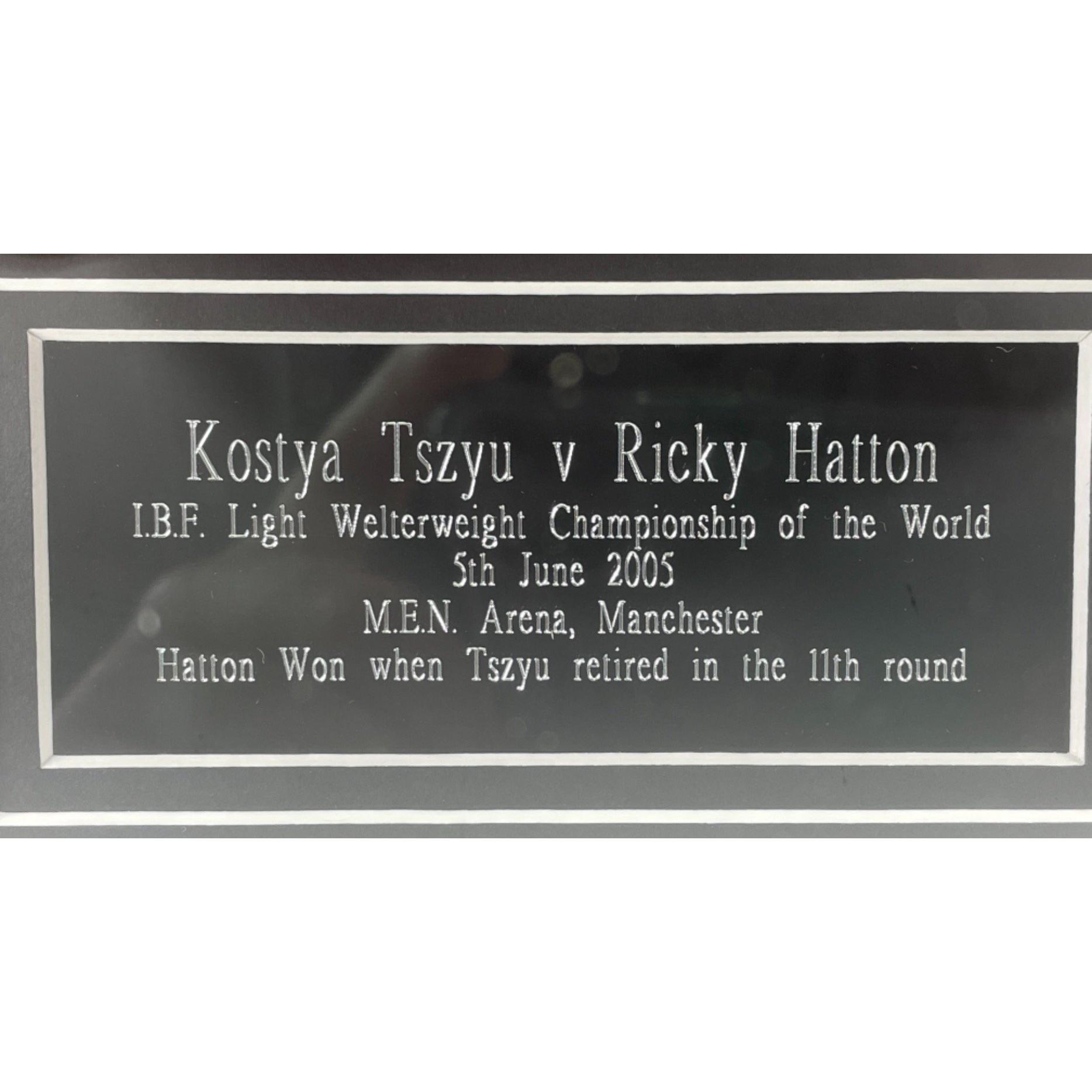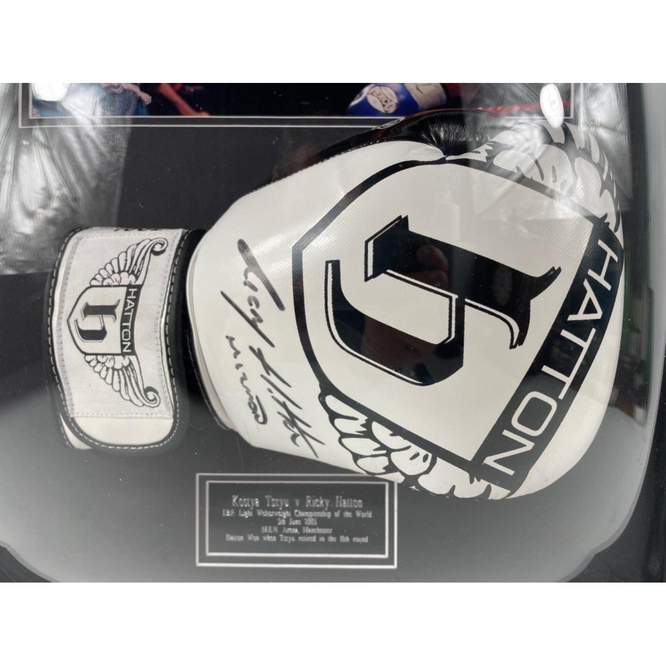 OOUCH!! A boxing glove signed by RICKY HATTON in a frame with a photo of his victory over Kostya Tszyu in 2005, comes with a certificate of authenticity from Punch Promotions, Manchester, frame size 60 x 50cm