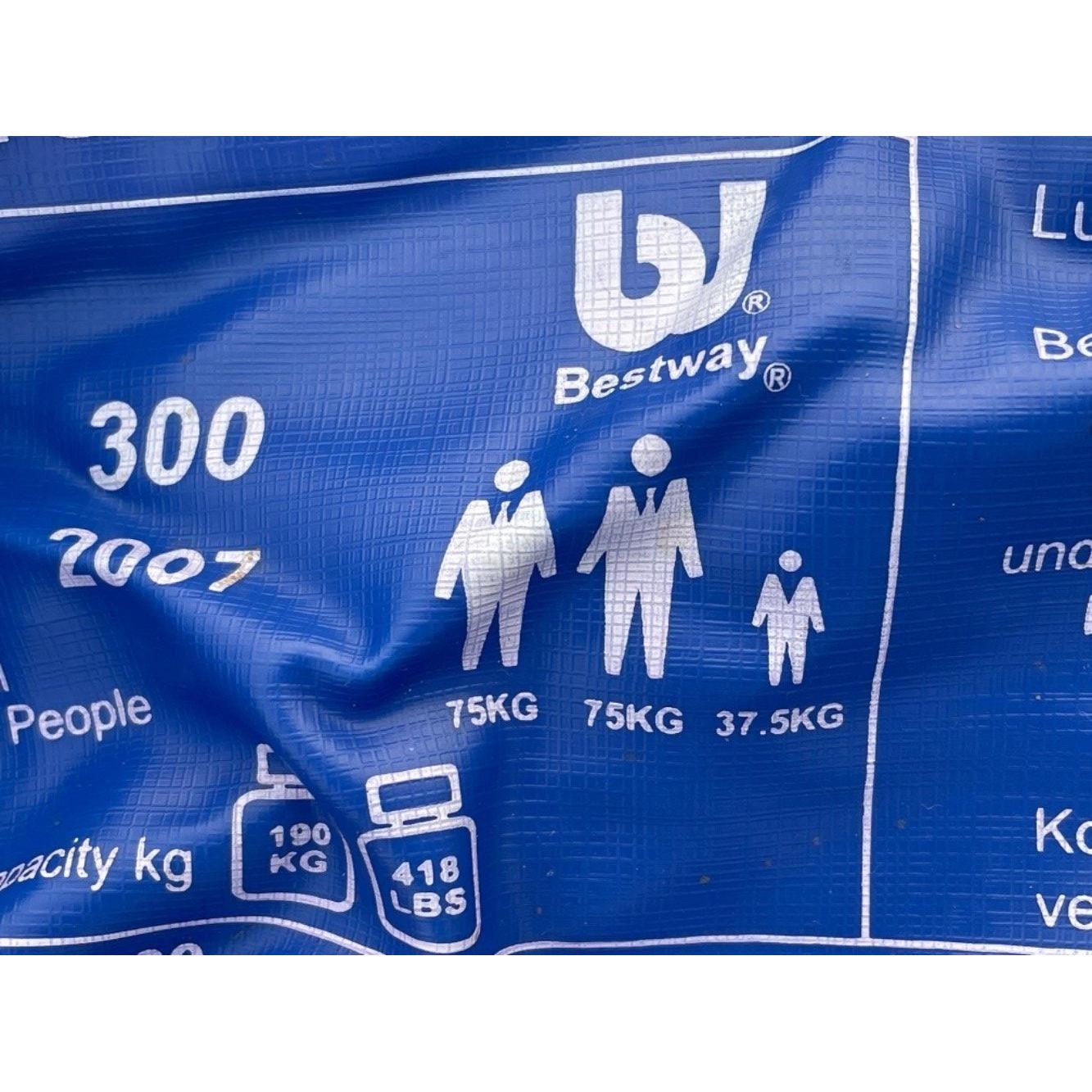 An inflatable dinghy by BESTWAY possibly two adults and a child etc or an adult and two children with foot pumps and a paddle