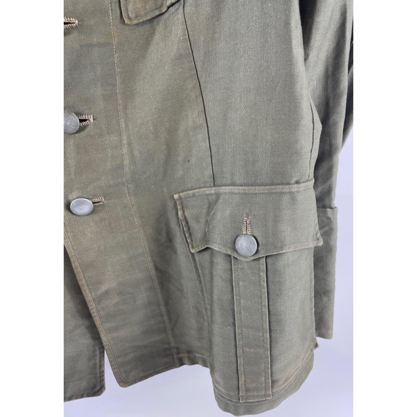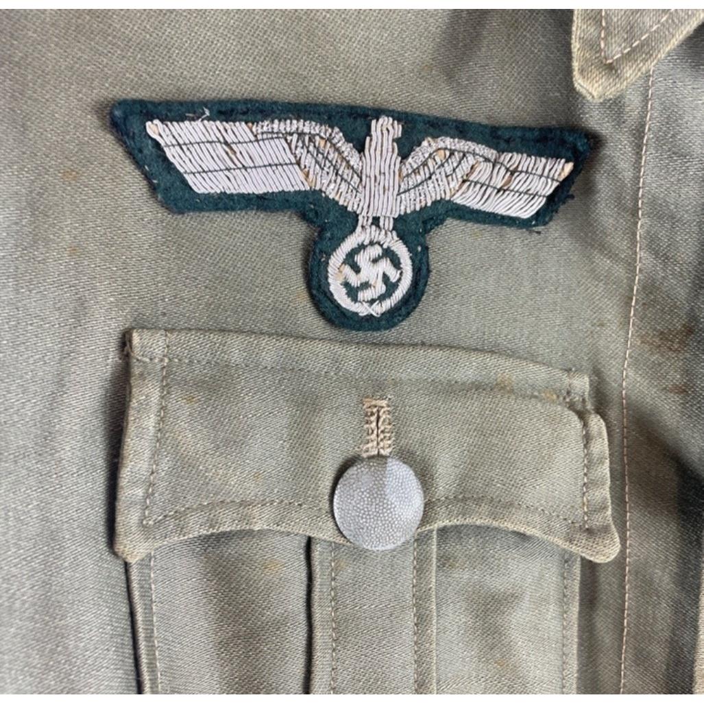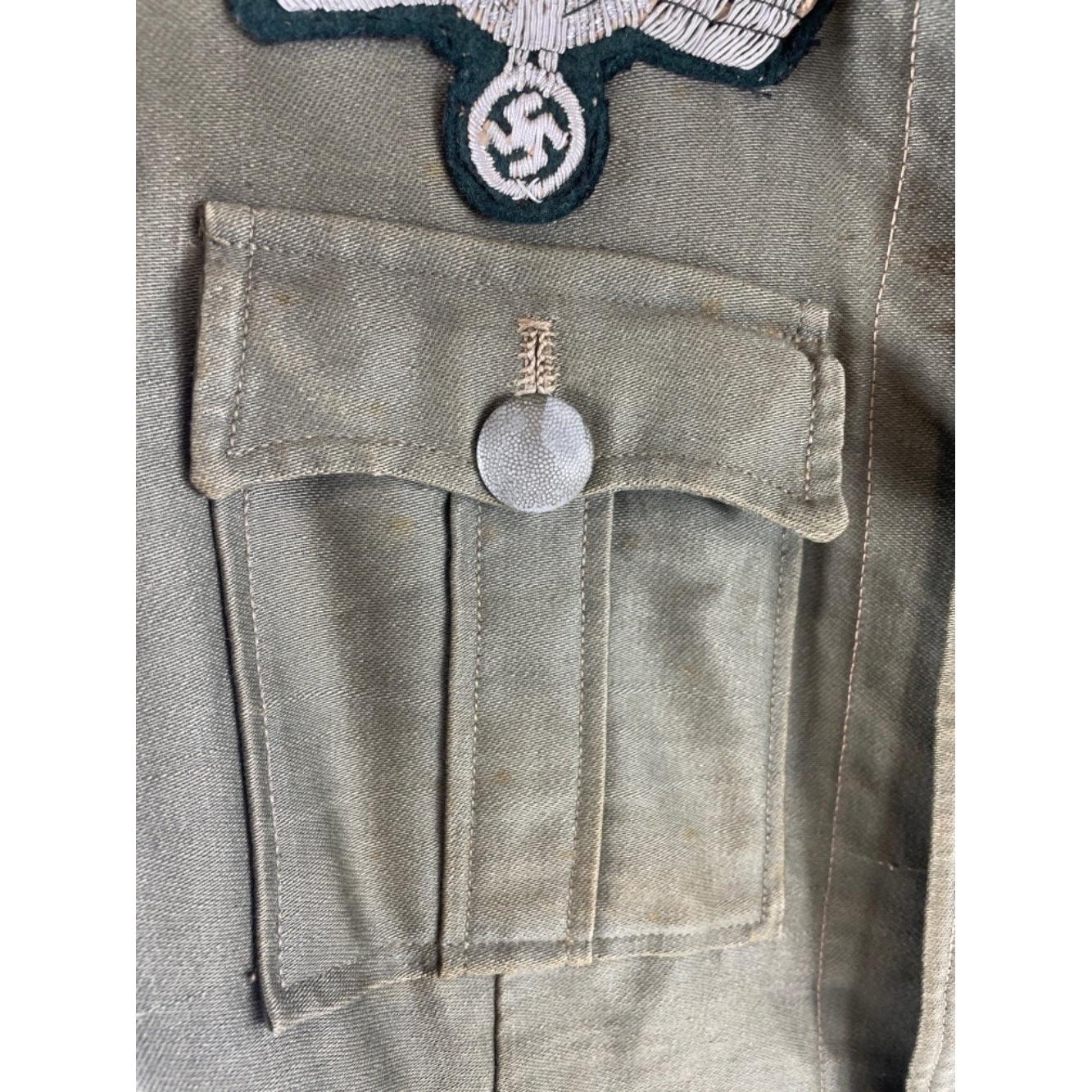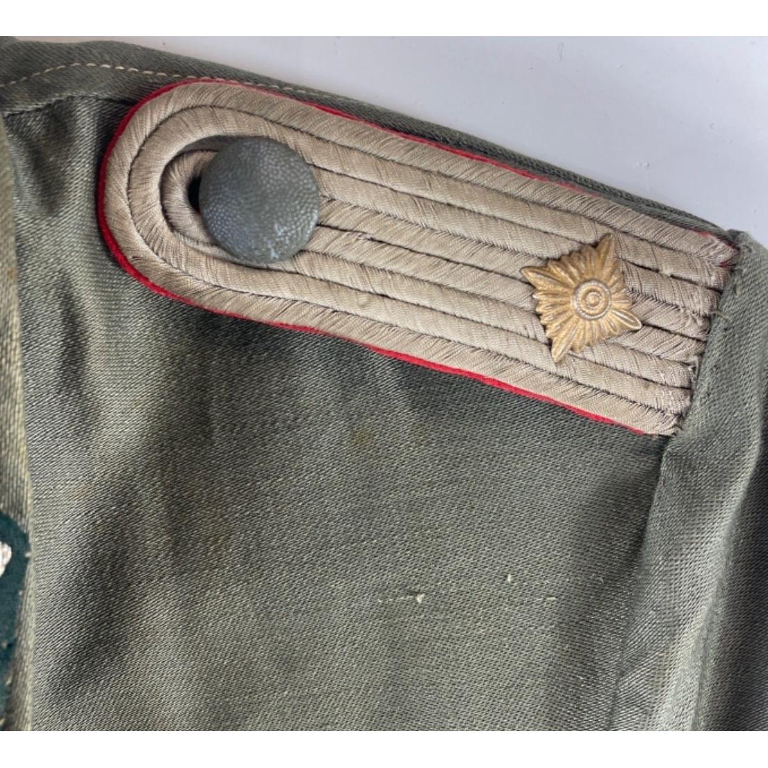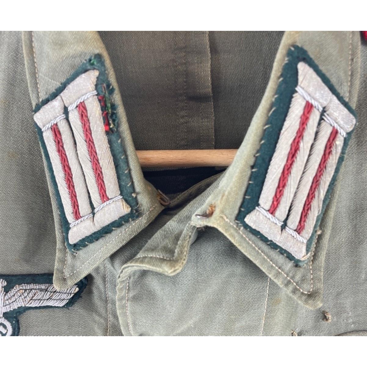 RARE - A WWII GERMAN army artillery officer's summer tunic constructed of a lightweight grey cloth with Oberleutnant (1st lieutenant) shoulder boards, colour tabs, piped in red, embroidered breast eagle, two medal ribbon loops. Great condition - no moth damage