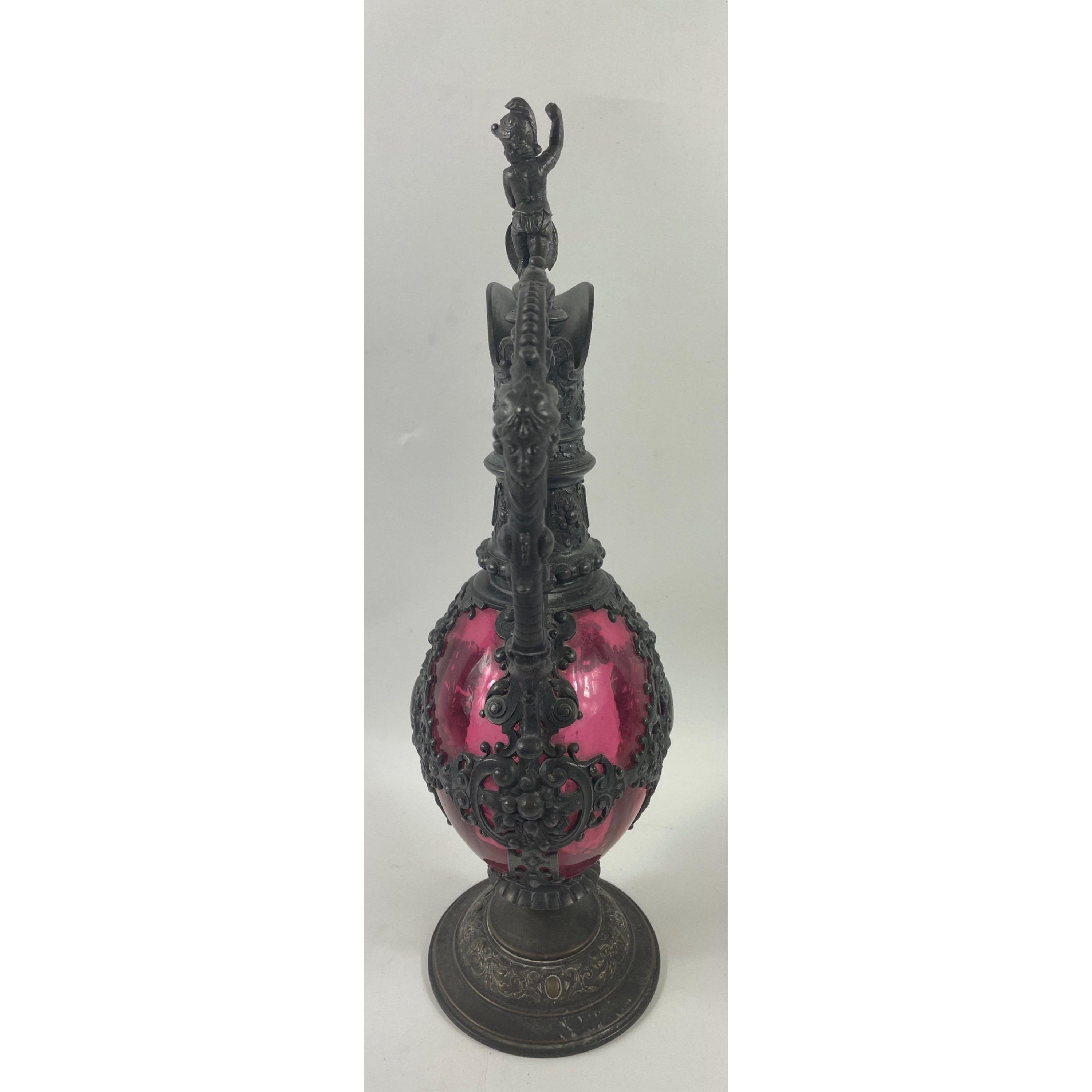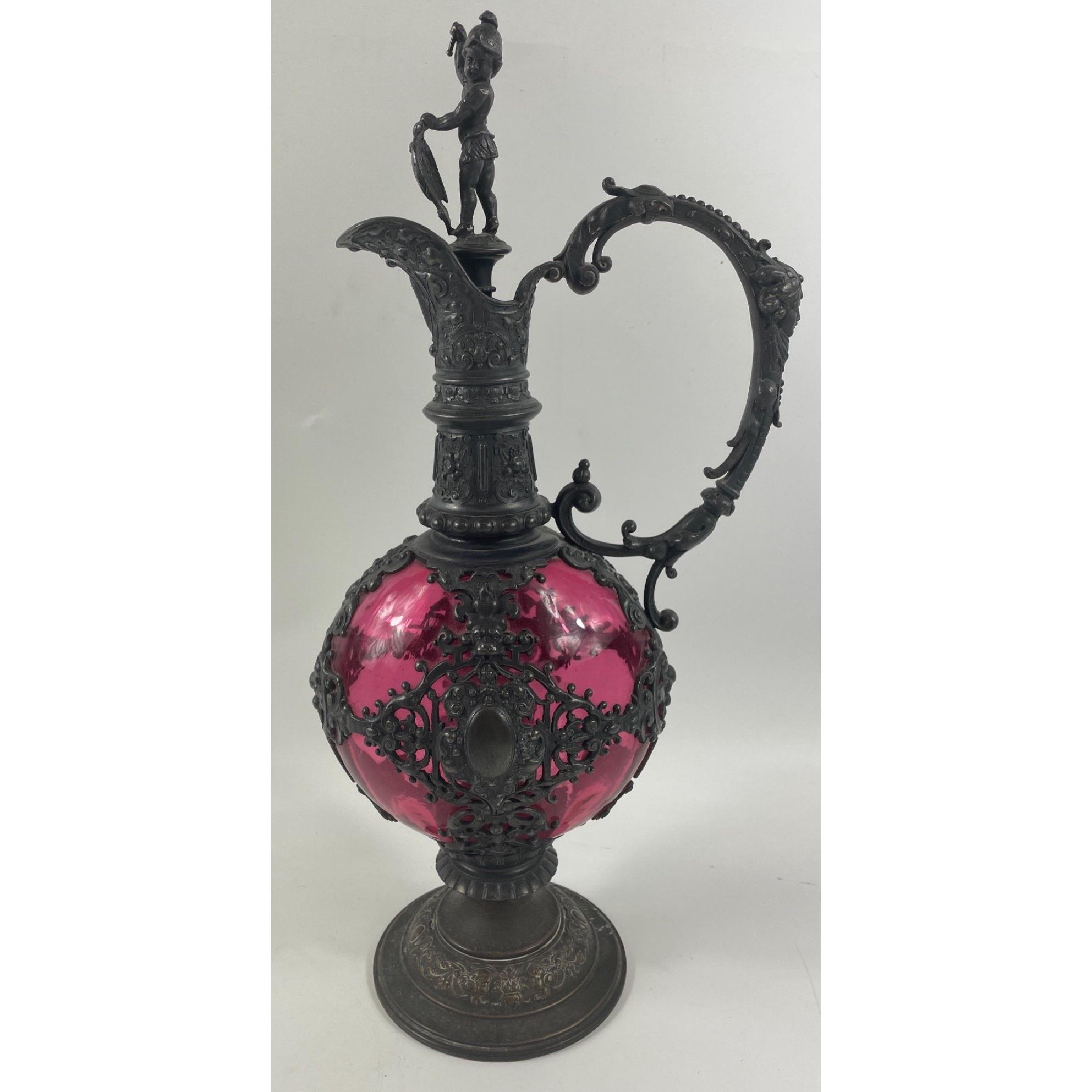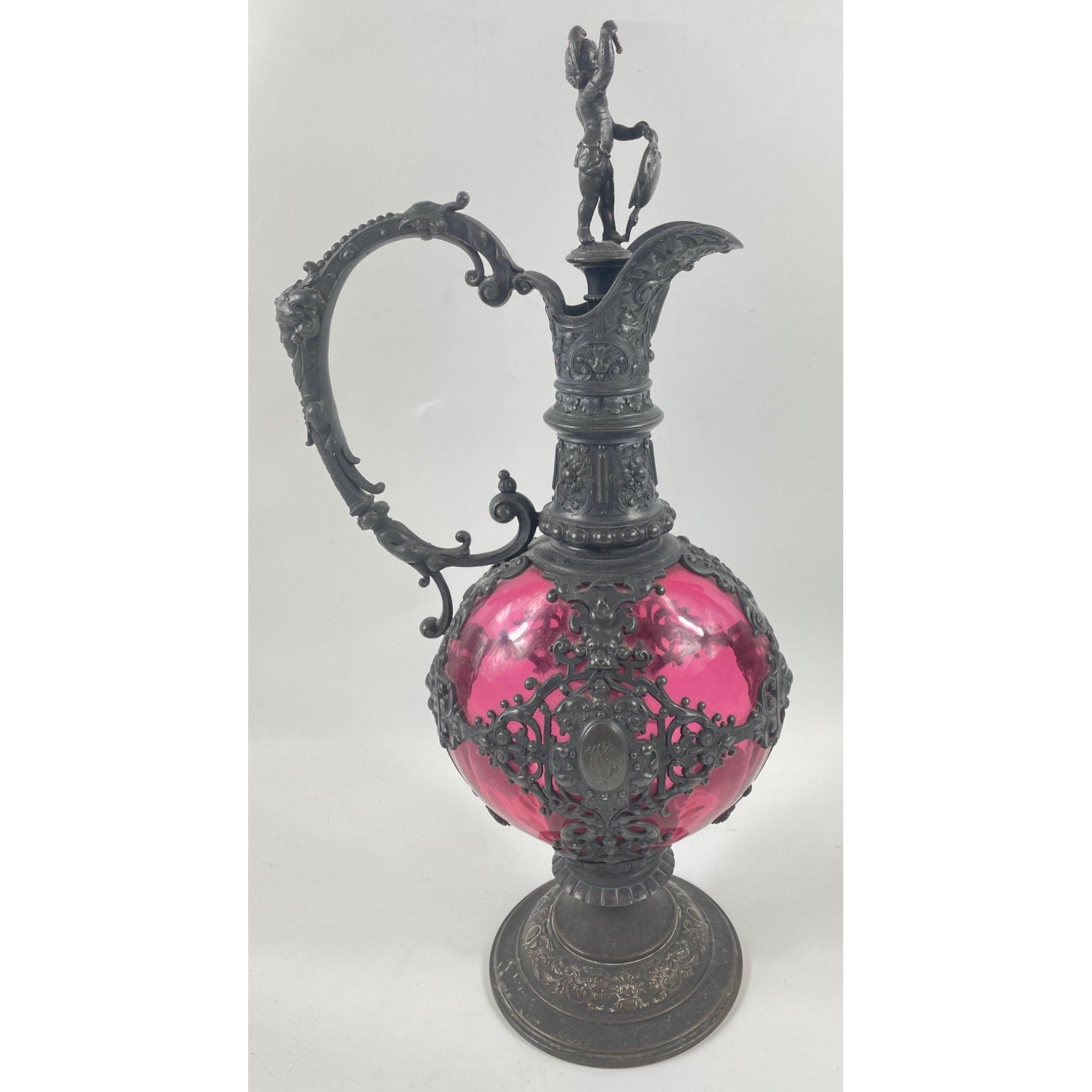 A BEAUTIFUL Cranberry glass CLARET JUG with ornate metal-work and an interesting Nymph 'stopper-lid' - dimension 40cm tall x 16cm wide approx with a small cranberry glass 'quaiche' with metal pierced twin handles