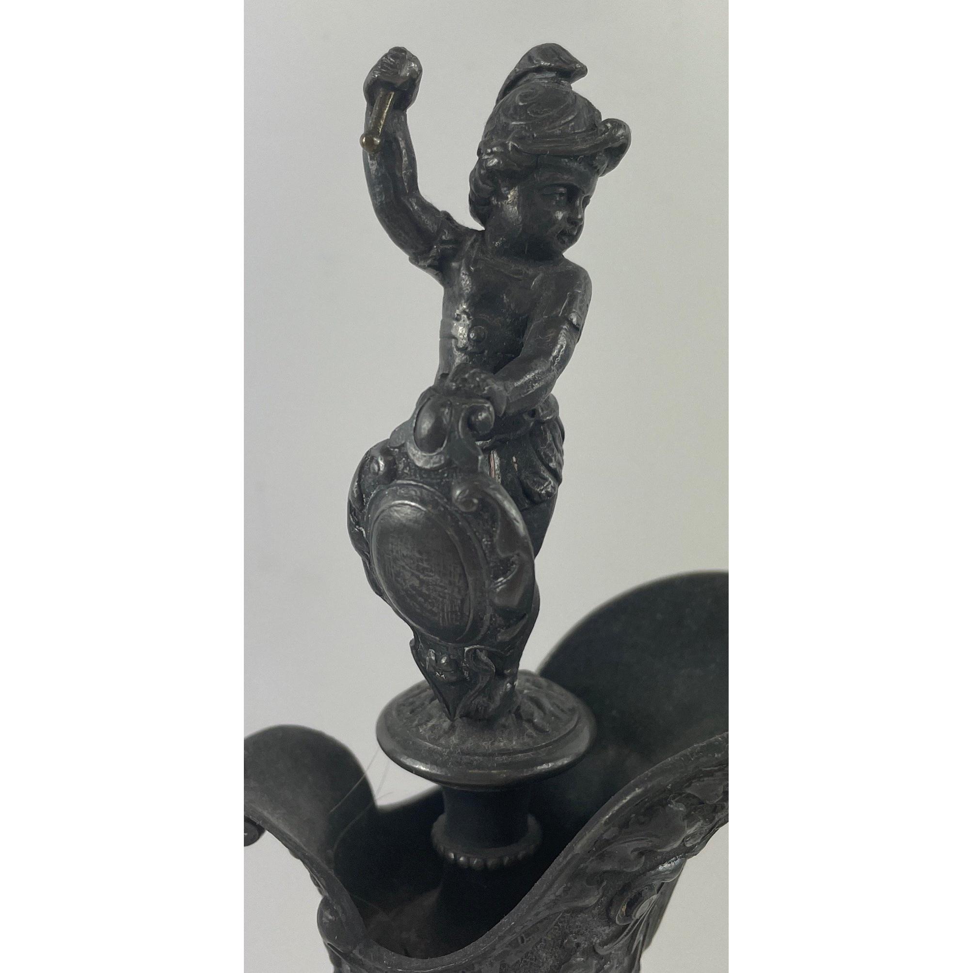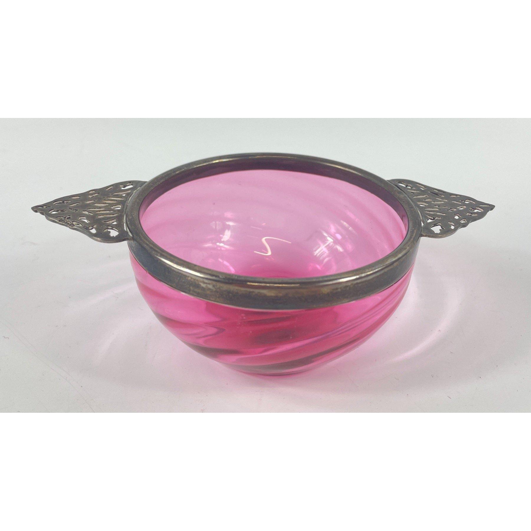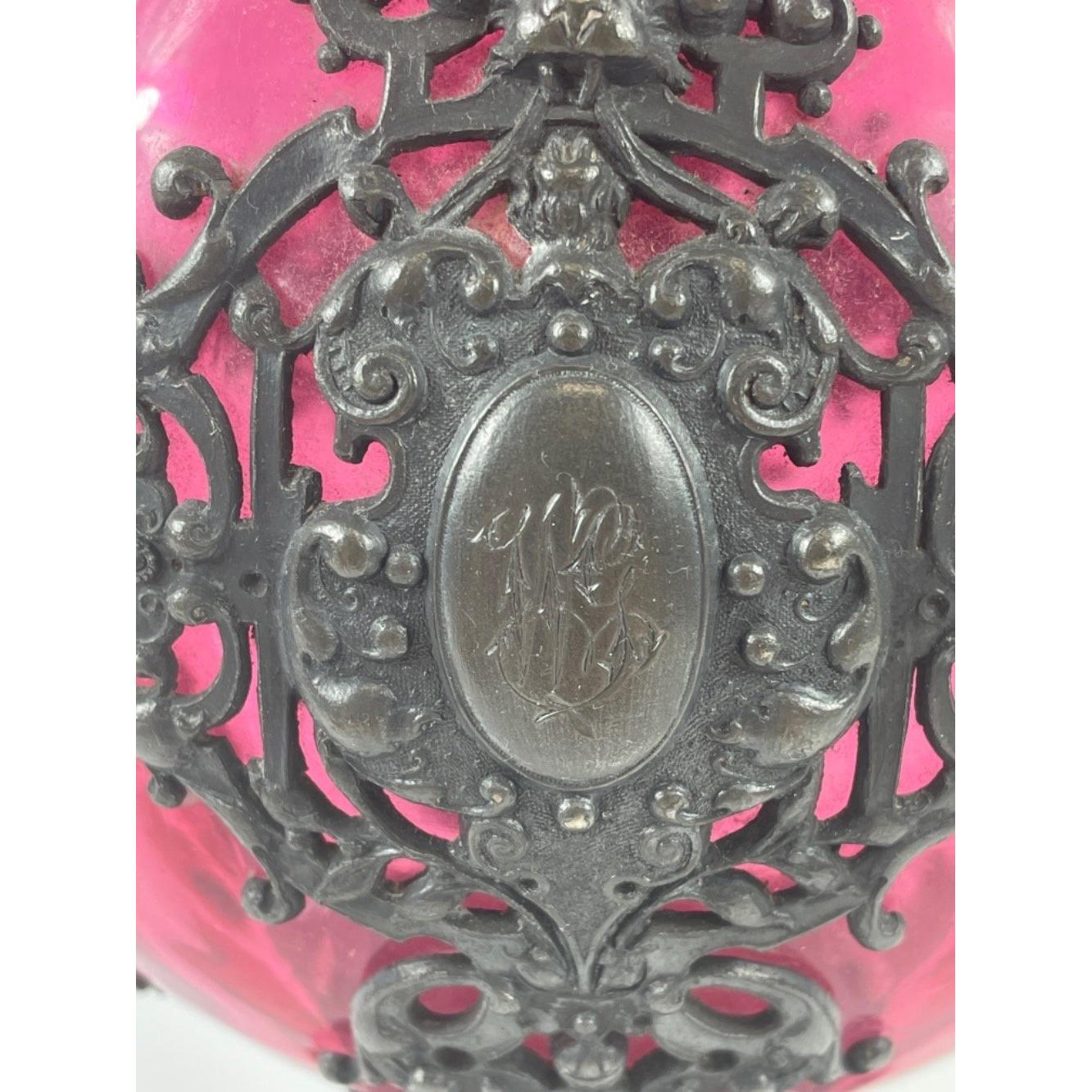 A BEAUTIFUL Cranberry glass CLARET JUG with ornate metal-work and an interesting Nymph 'stopper-lid' - dimension 40cm tall x 16cm wide approx with a small cranberry glass 'quaiche' with metal pierced twin handles