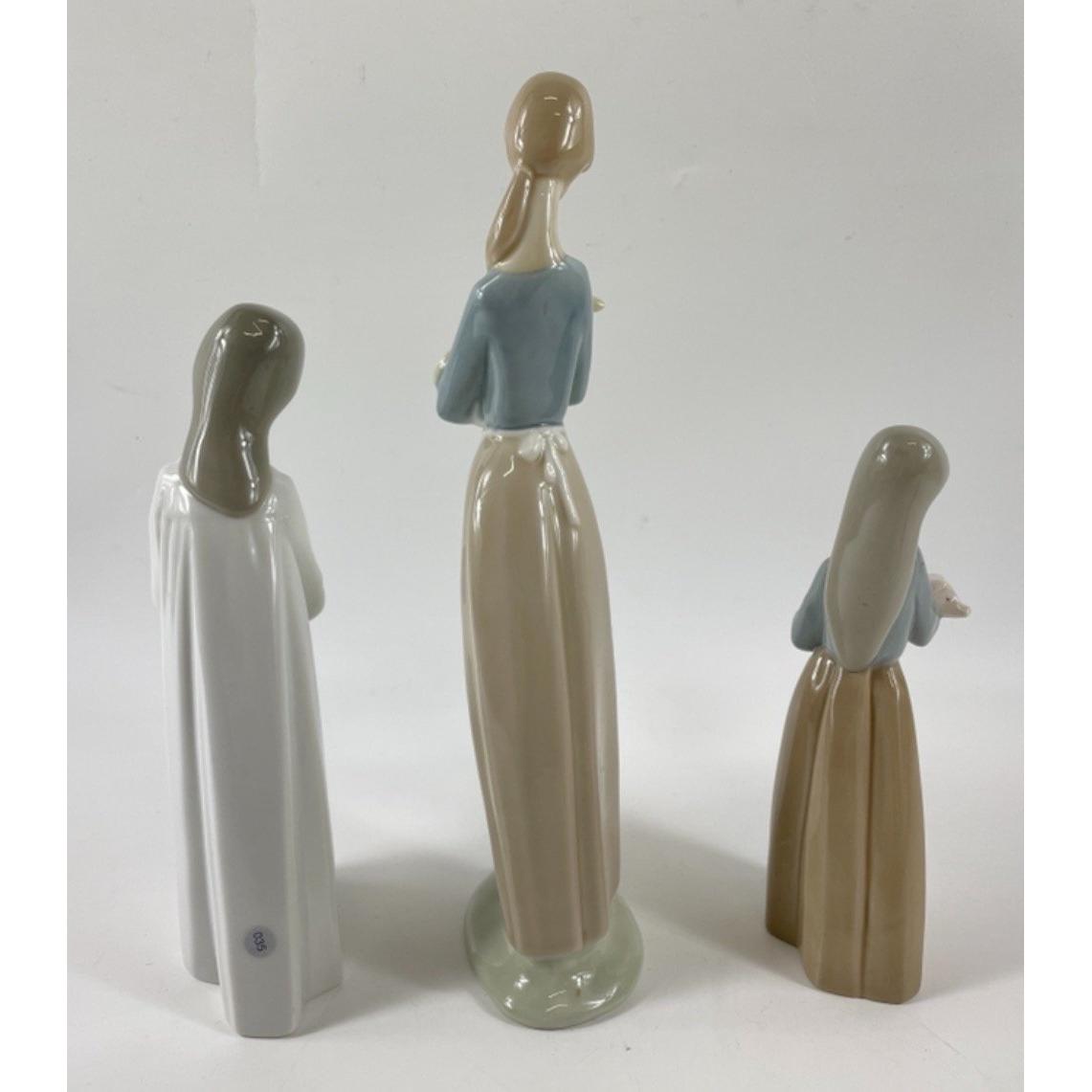 Three pieces of LLADRO comprising a signed girl with pig (17.5cm), girl with candle(model 4868) 22cm high, damage to candle and one hand, girl with lamb (28cm high)Approx 3 pieces