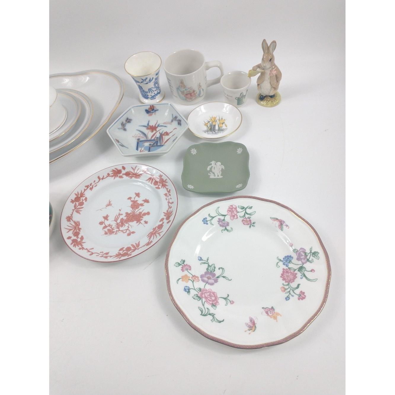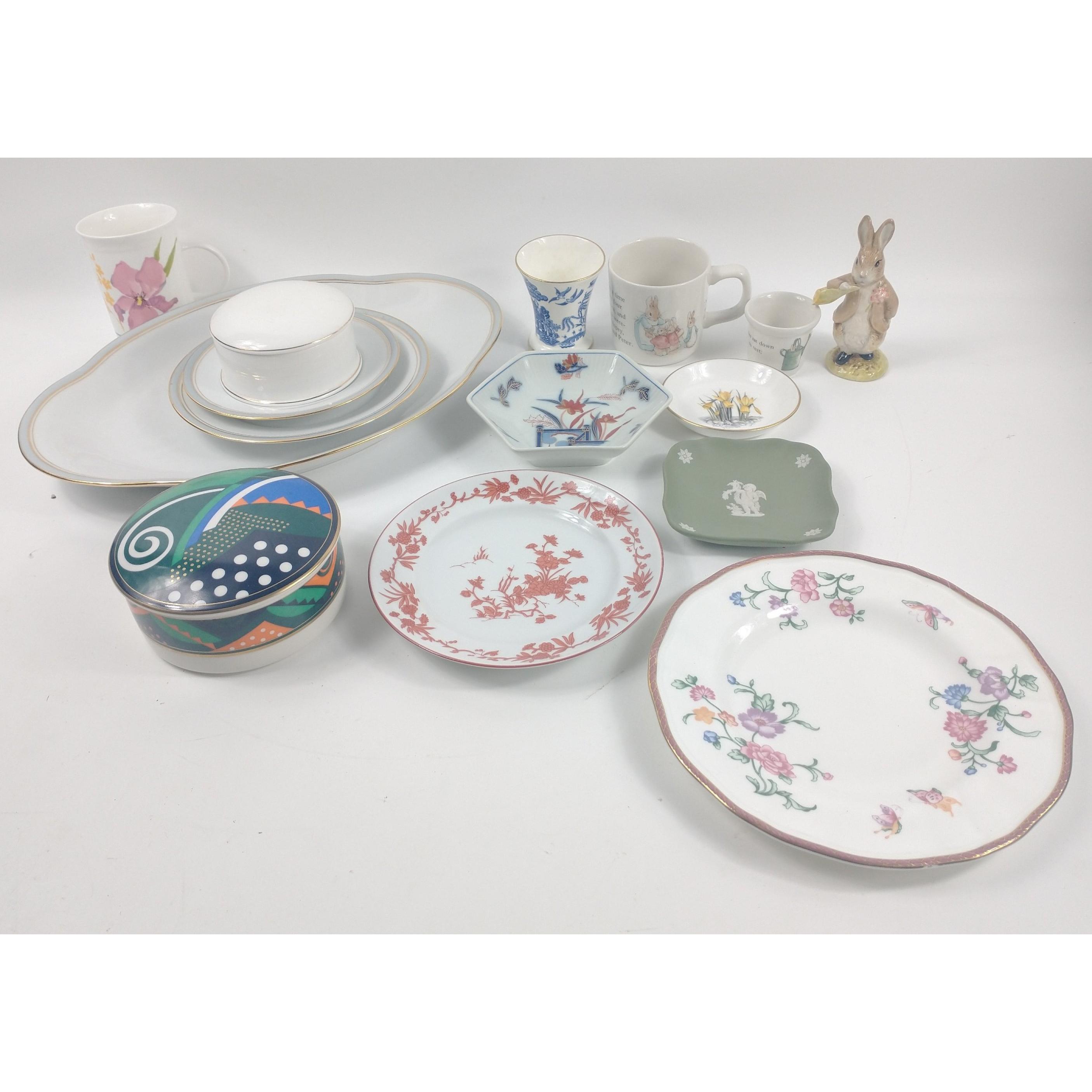 A mixed china lot to include a ROYAL WORCESTER trinket dish (10cm), a COALPORT blue & white vase (8cm), 2 LIMOGES plates in white with a dove grey and gilt rim 16 and 19cm dia and and ashet (38cm approx), a WEDGWOOD Jasperware dish (10x10cm), a WEDGWOOD Christabel plate (20m), a WEDGWOOD child's Peter Rabbit mug, egg-cup and a ROYAL ALBERT Peter Rabbit figure (12cm high), a MIKASA Galaxy Green lidded trinket dish (12cm dia), a hexagonal dish by VISTA ALEGRE (13cm) etc