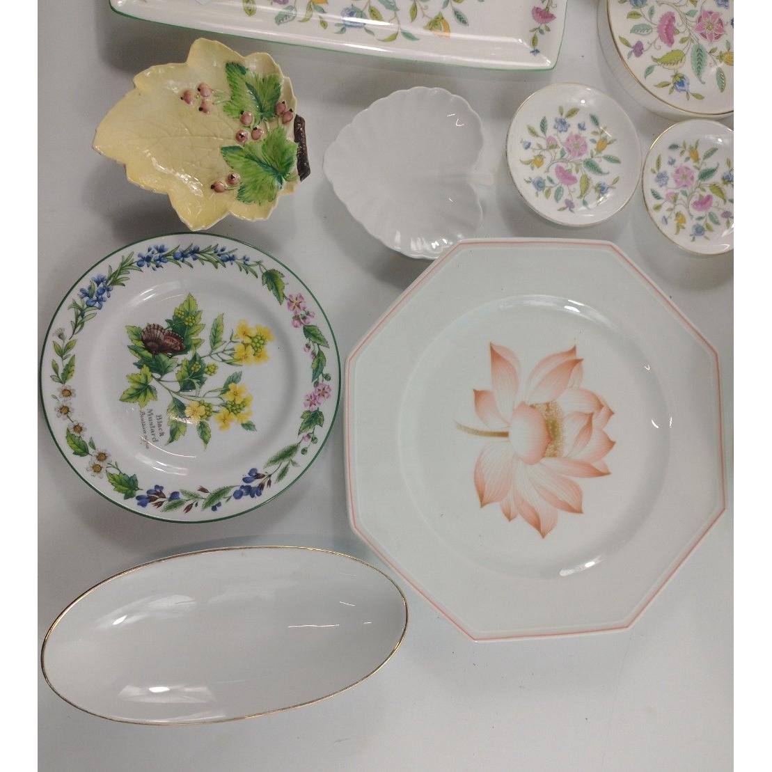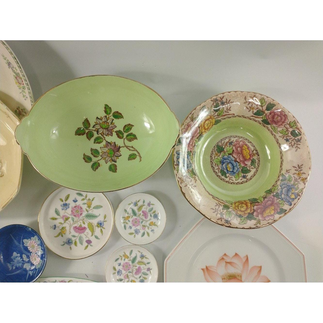 An attractive vintage square CROWN DEVON dish 23x23cm, a vintage MALING Peony Rose lustre bowl no 6561 (23cm), a vintage MALING Brocade oval shaped dish no 4586 (16cm), a WORCESTER black mustard Herbs plate (17cm), a SPODE COPELAND 'Spode's Glory' square plate 23x23cm, a vintage CARLTON WARE leaf dish 25cm long and another leaf plate 12cm long, a LIMOGES hexagonal plate with peony 25x25cm, from the MINTON Haddon Hall collection a sandwich plate 29cm long, flan dish 13.5cm dia, 2 trinket dishes 9.5cm, etc