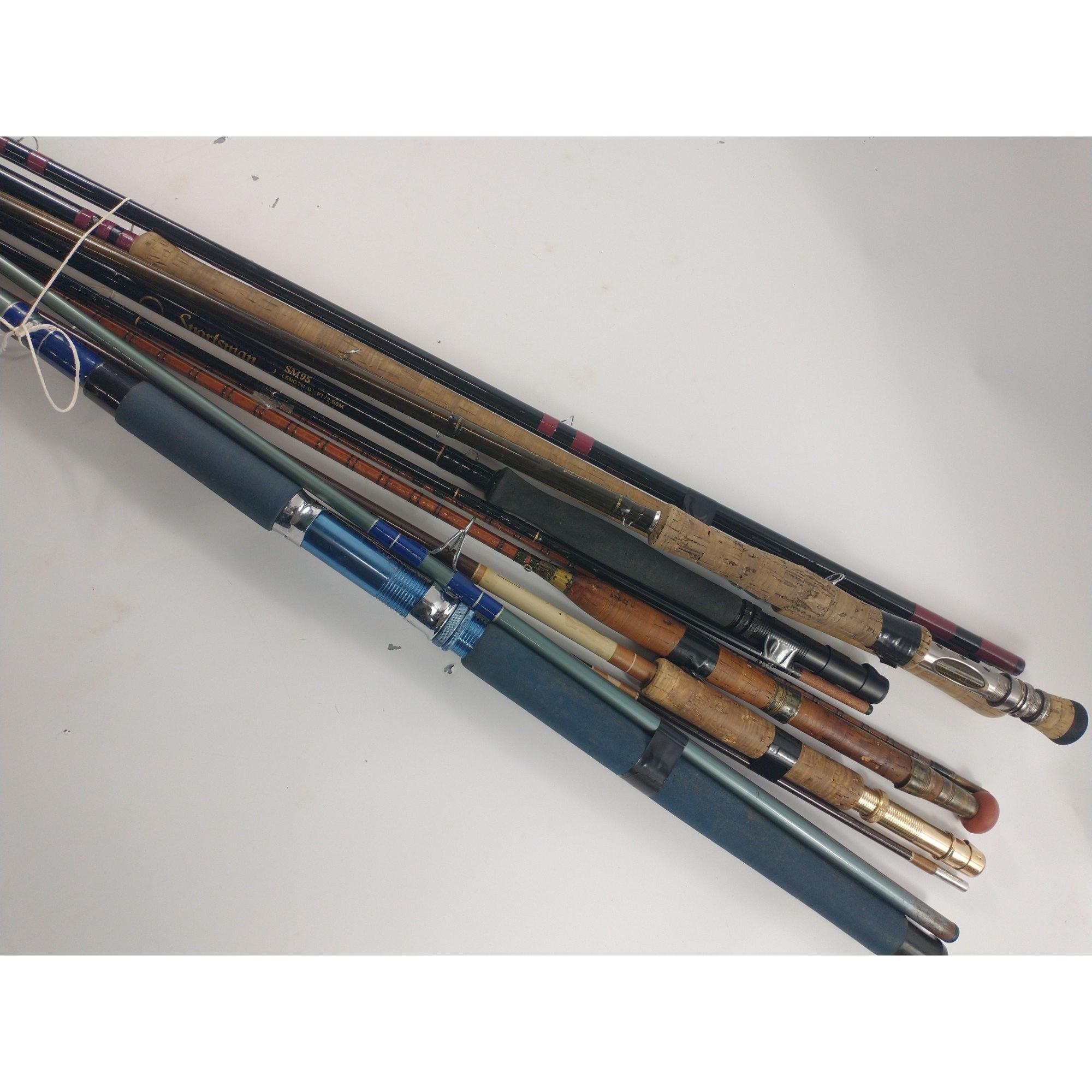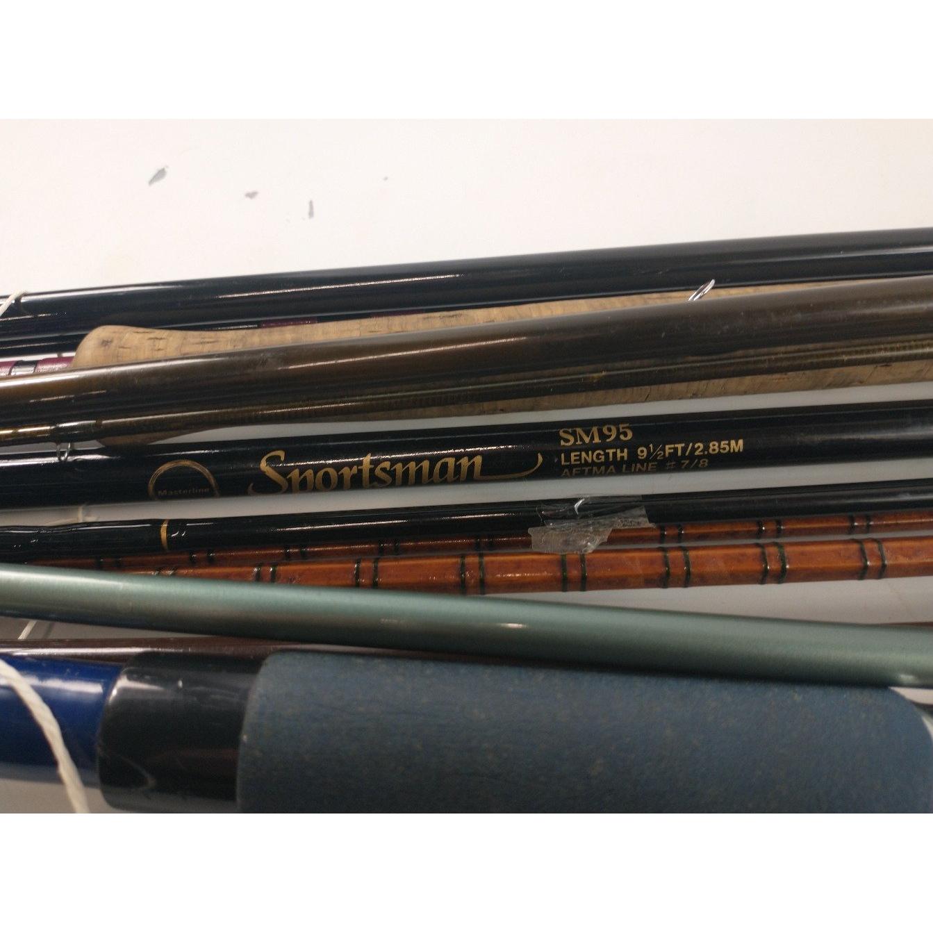 A bundle of five FISHING RODS including a MASTERLINE SPORTSMAN SM 95, a BRUCE WALKER hand-built 14ft salmon rod, an AIRFLO Delta Classic 11ft rod. repairs needed to 2 rodsApprox 5 pieces