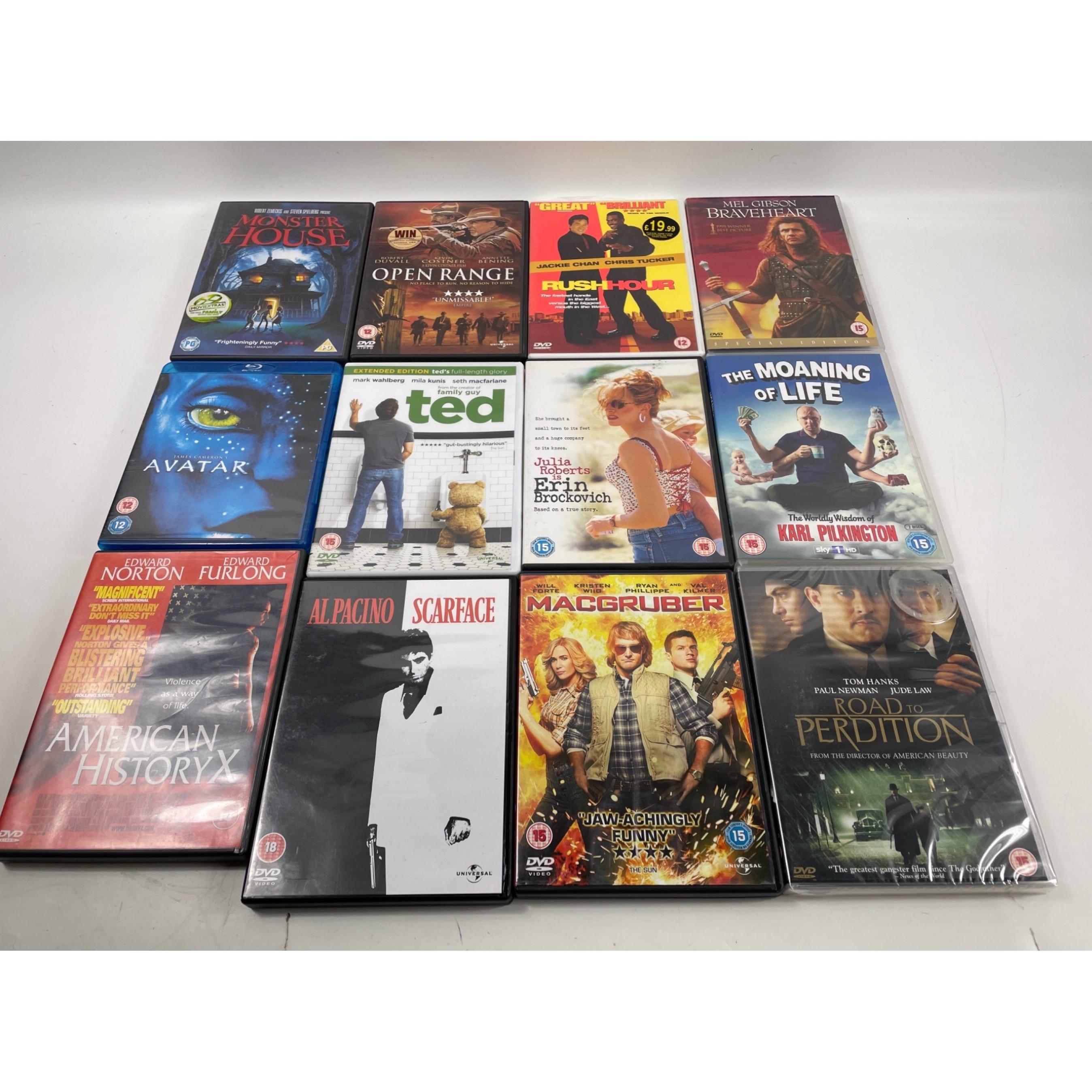 A box FULL of CD's to include a wide range of movies to include RUSH HOUR 2 AND OPEN RANGE BRAVE HEART MONSTER HOUSE etc