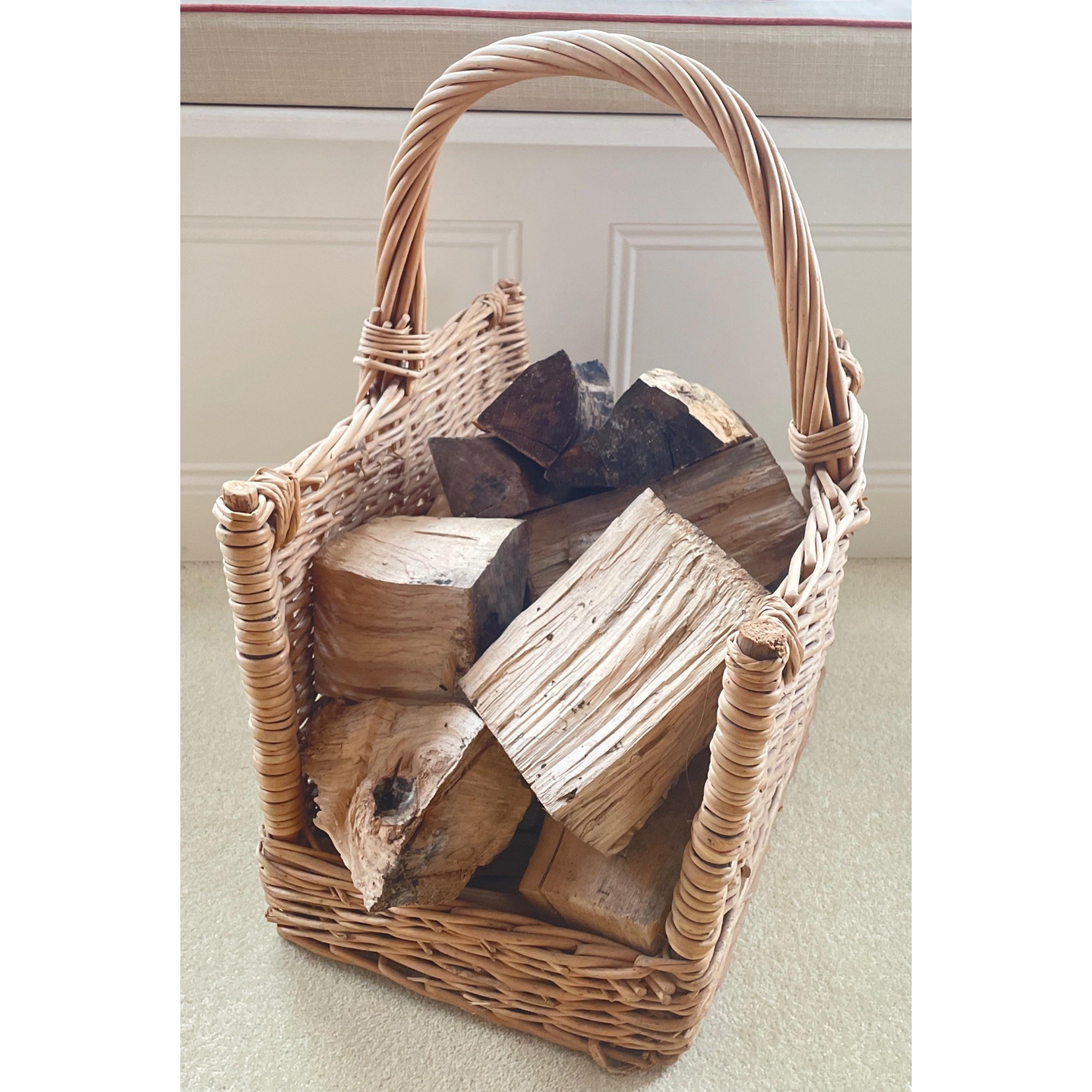 A BEAUTIFUL POSH open ended wicker log basket with handle - complete with hardwood logs! Dimensions 55cm height x 47cm length and girth 35cm