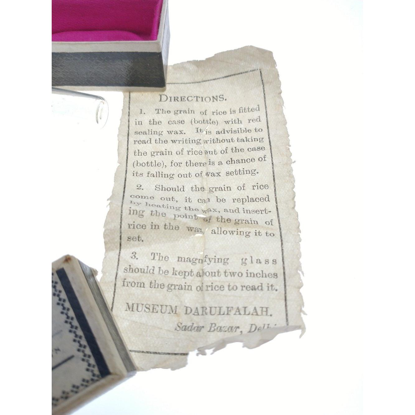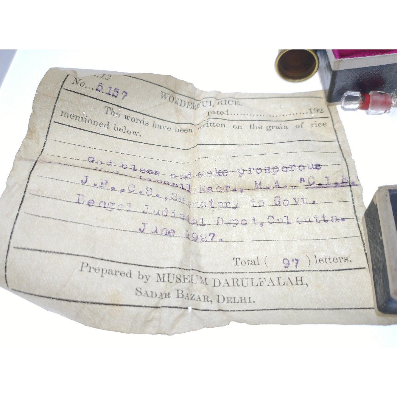 An ANTIQUE 'Wonderful Rice' minute scroll letters, 97 in total according to the writings on the front, from The Museum Darulfalah, Deli, India - all within a screwtop small brass canister