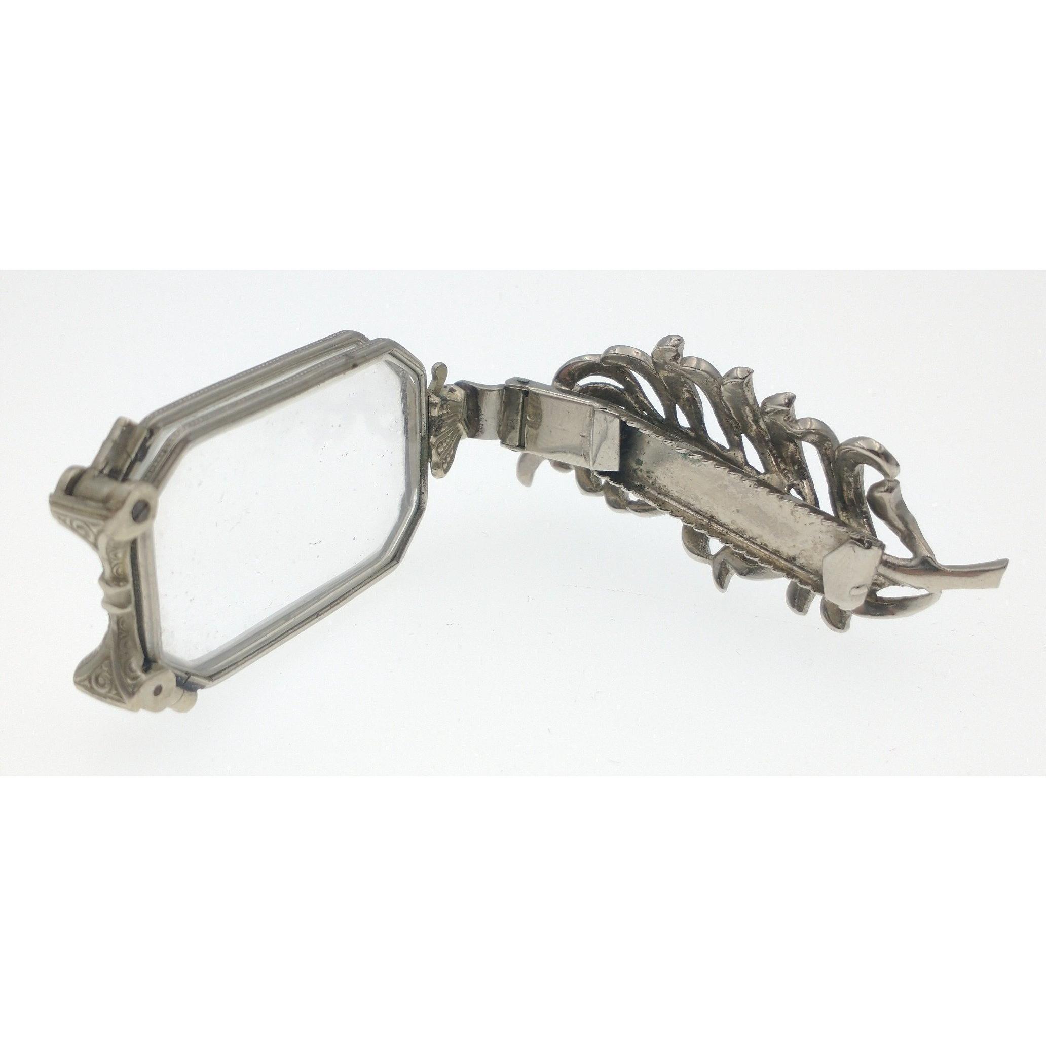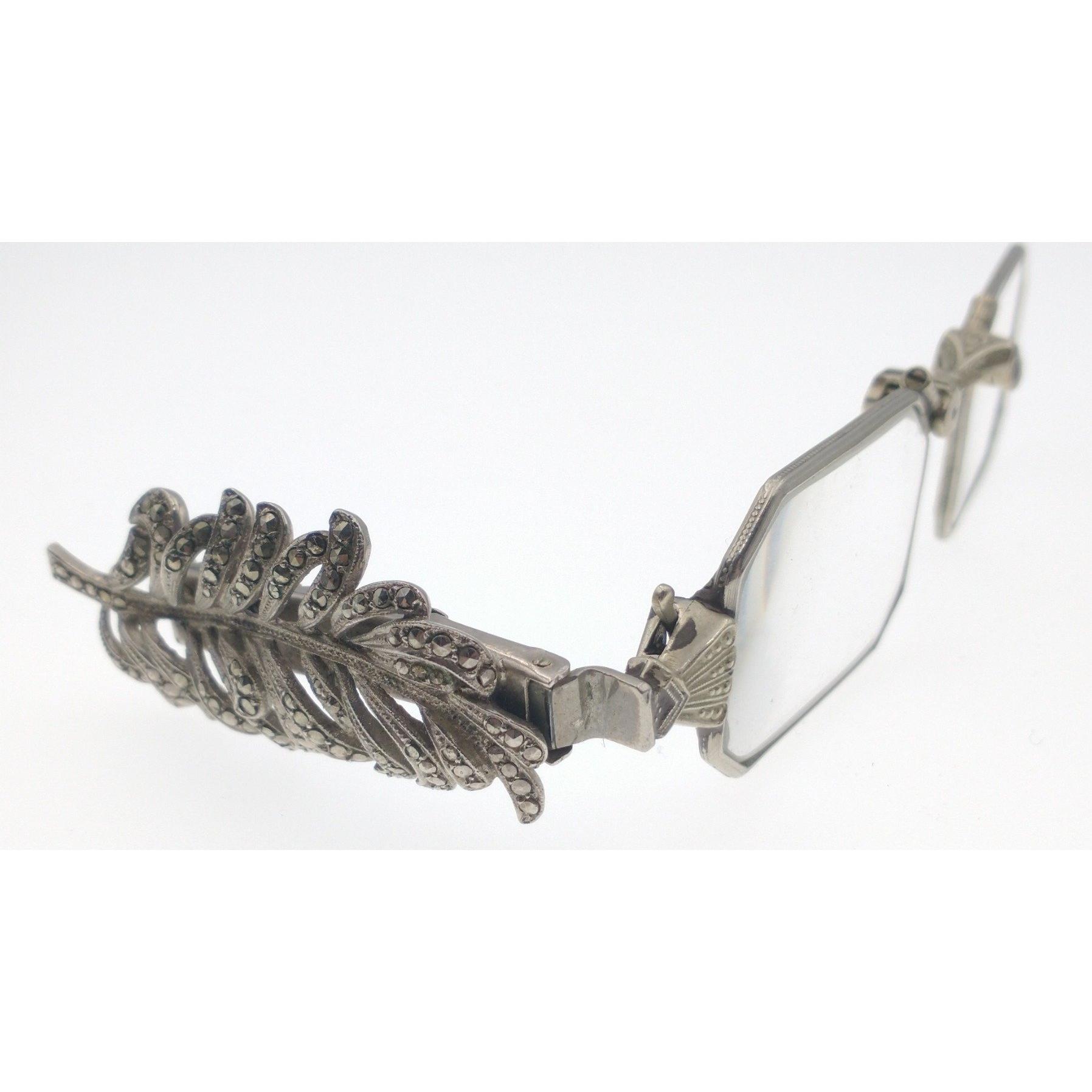 A pair of vintage ART DECO fold-away reading glasses which flick open at the touch of a lever, when folded the marcasite fern leaf can be used as a clip for attaching the glasses to a pocket etc 6cm long