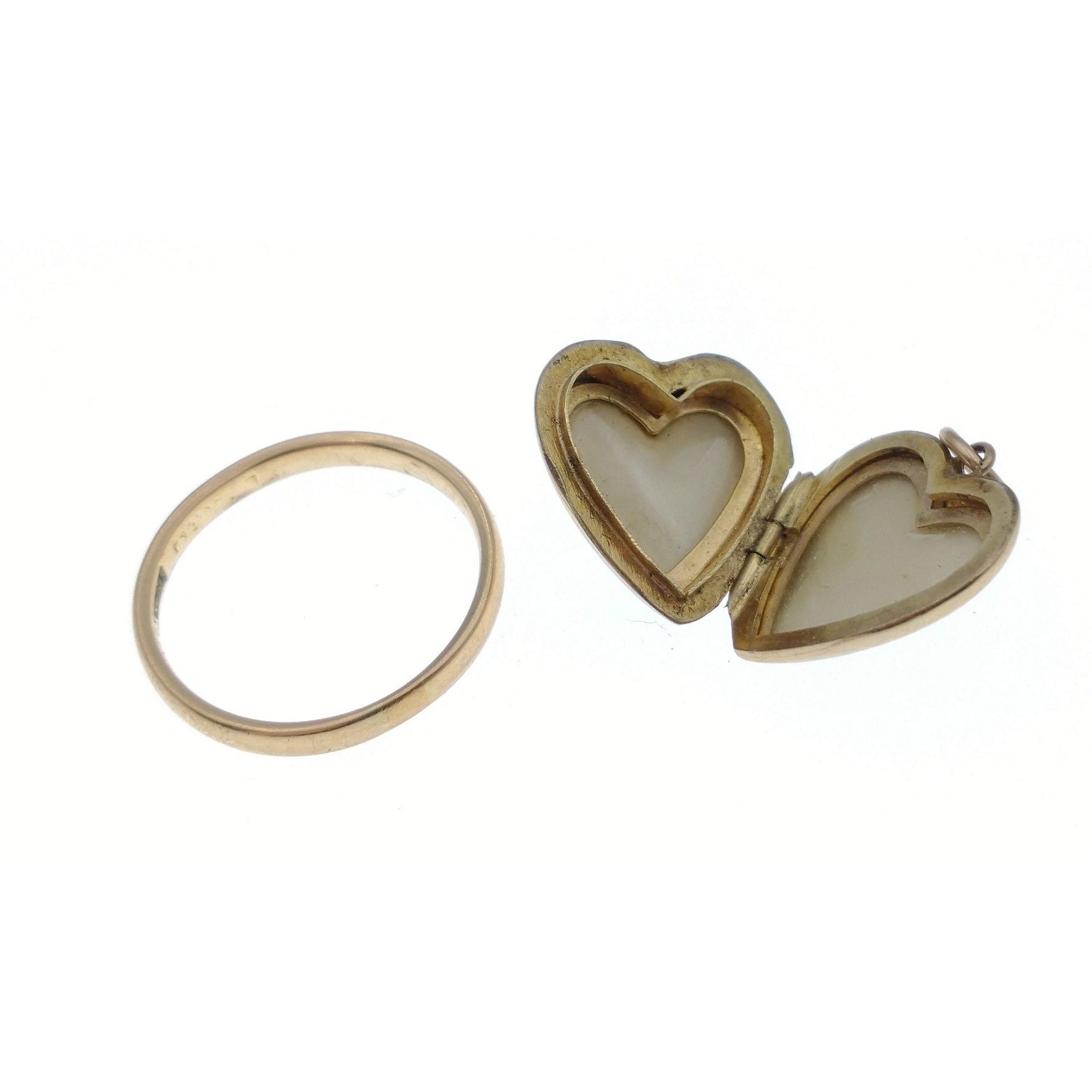 Hallmark partially rubbed/worn/ yellow gold wedding band weight 1.67g approx - ring size N - with also a 'yellow metal' love-heart pendant 1.45g approx Approx 2 pieces