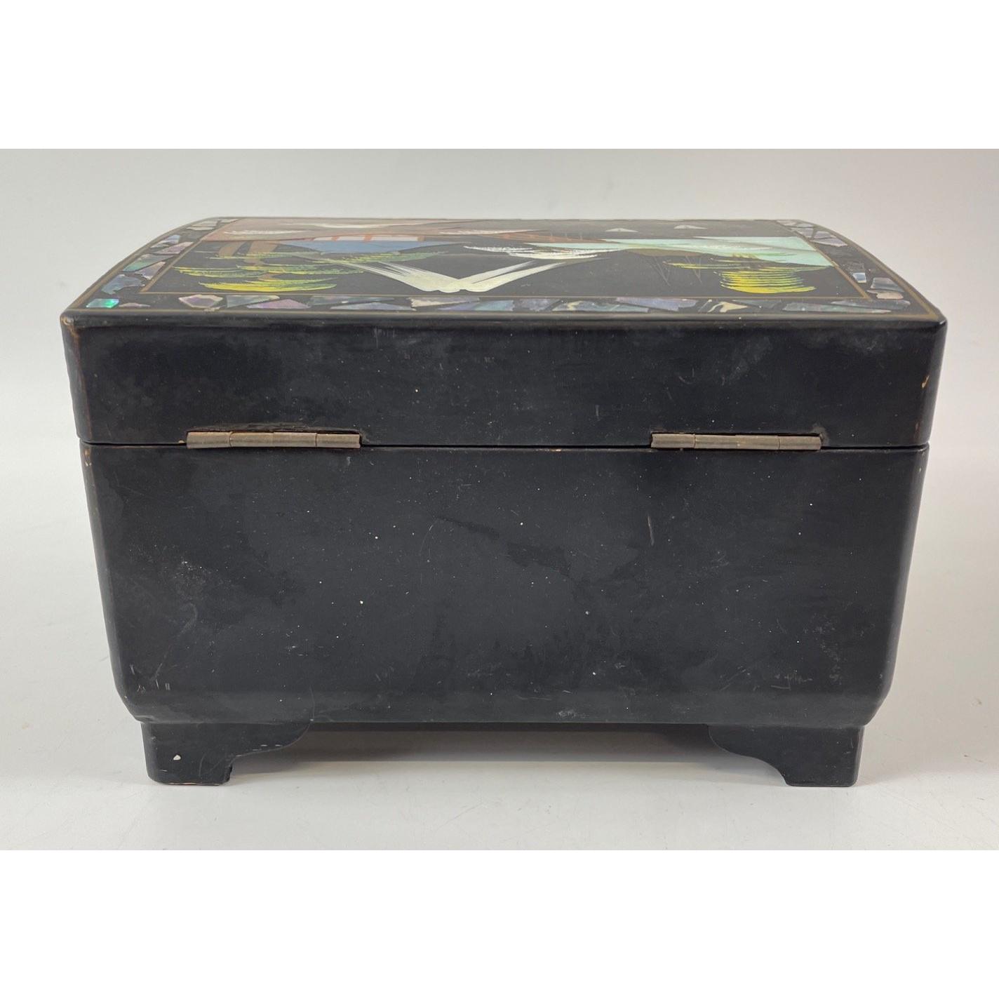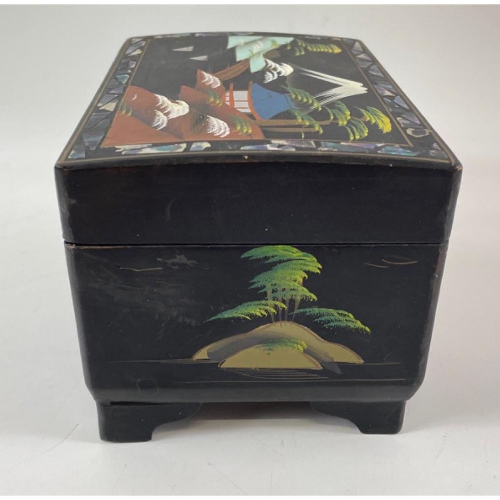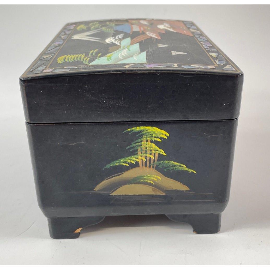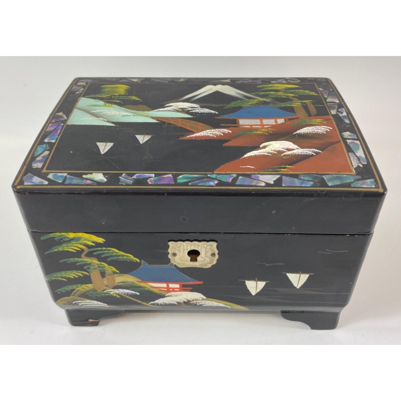 A vintage wooden musical hand painted JAPANESE jewellery box, with traditional scenes and the lid inlaid with abalone shell - a beautiful quality item! - dimensions 9cm height x 15cm wide x 11cm depth approx