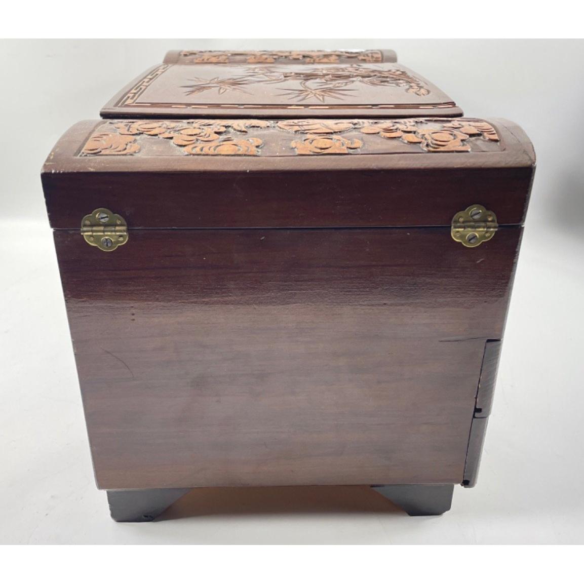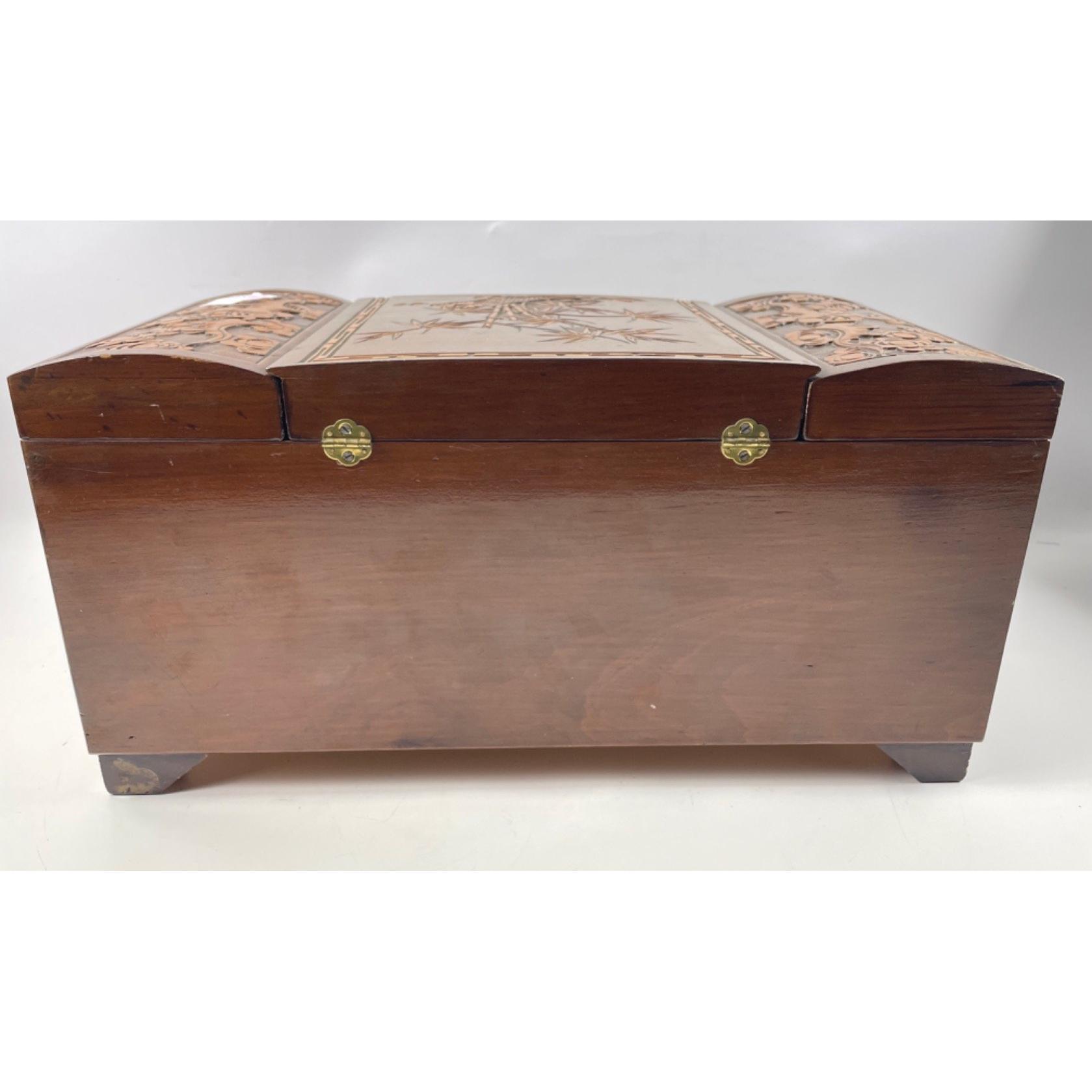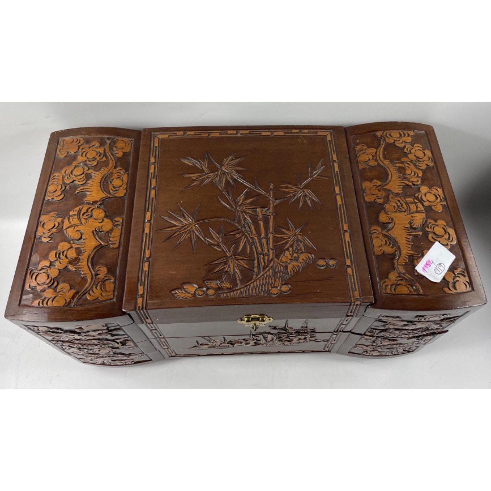 SUBSTANTIAL carved wooden jewellery box with traditional ORIENTAL scenes, with two drawers, and a butterfly style opening lid - dimensions height 21cm x width 42cm x depth 22cm approx - to include also a quantity of costume jewellery
