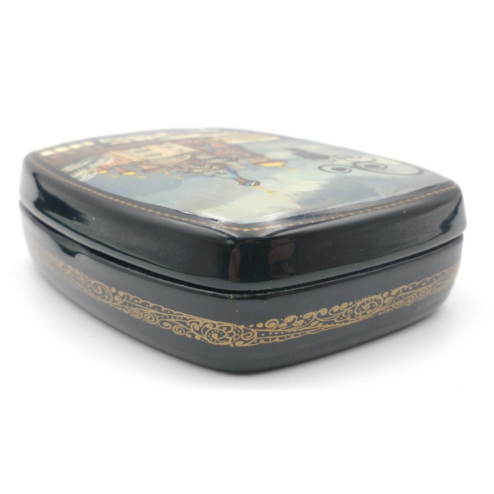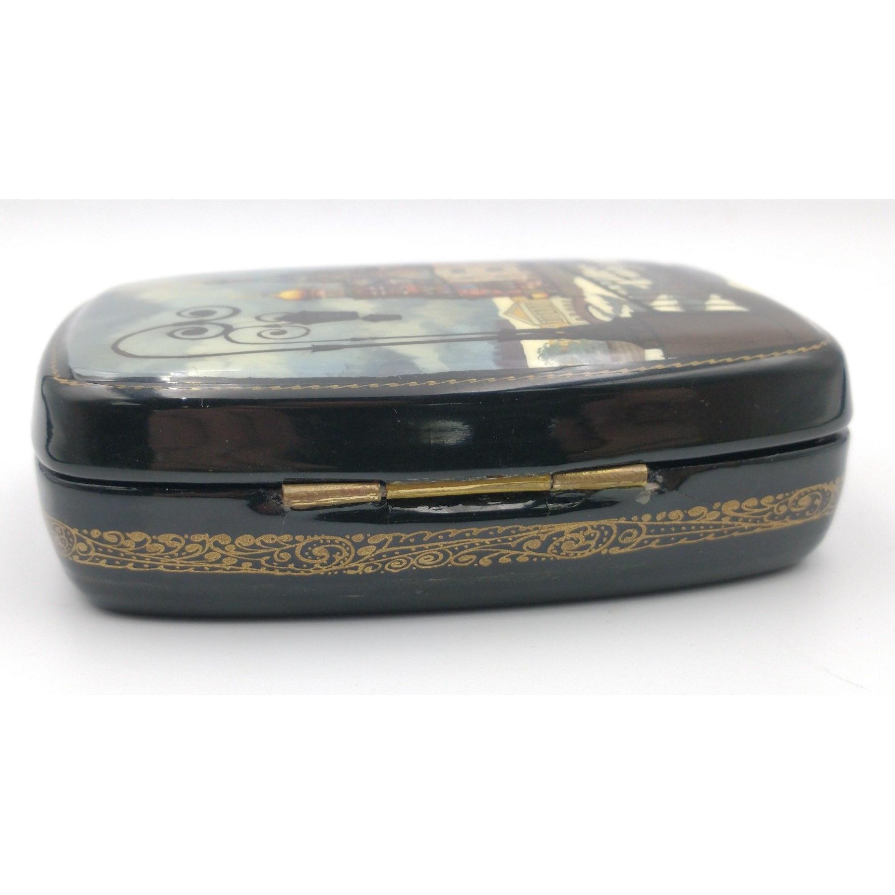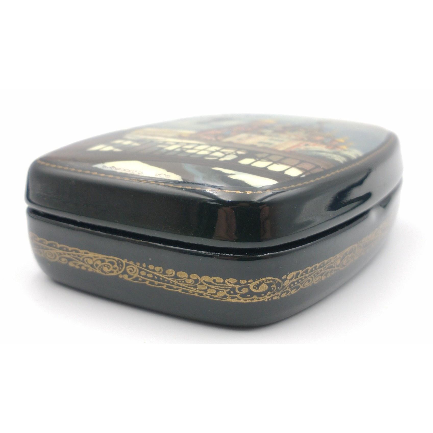 A Russian laquered snuff box with a design of St Basil's cathedral 10cm longApprox 1 pieces