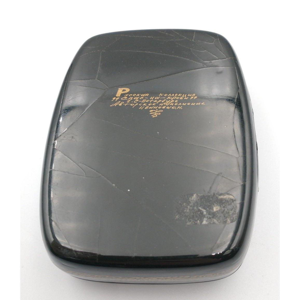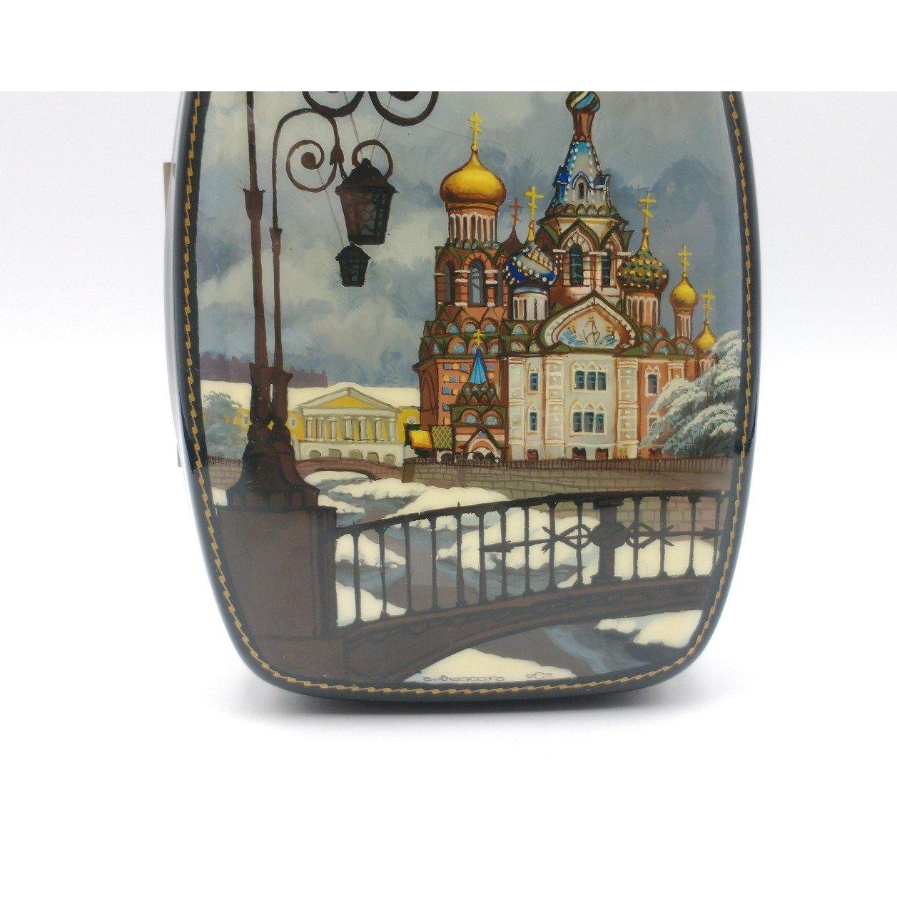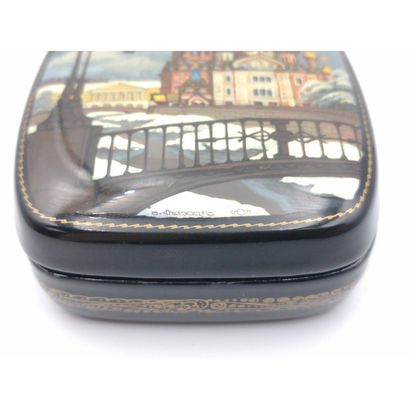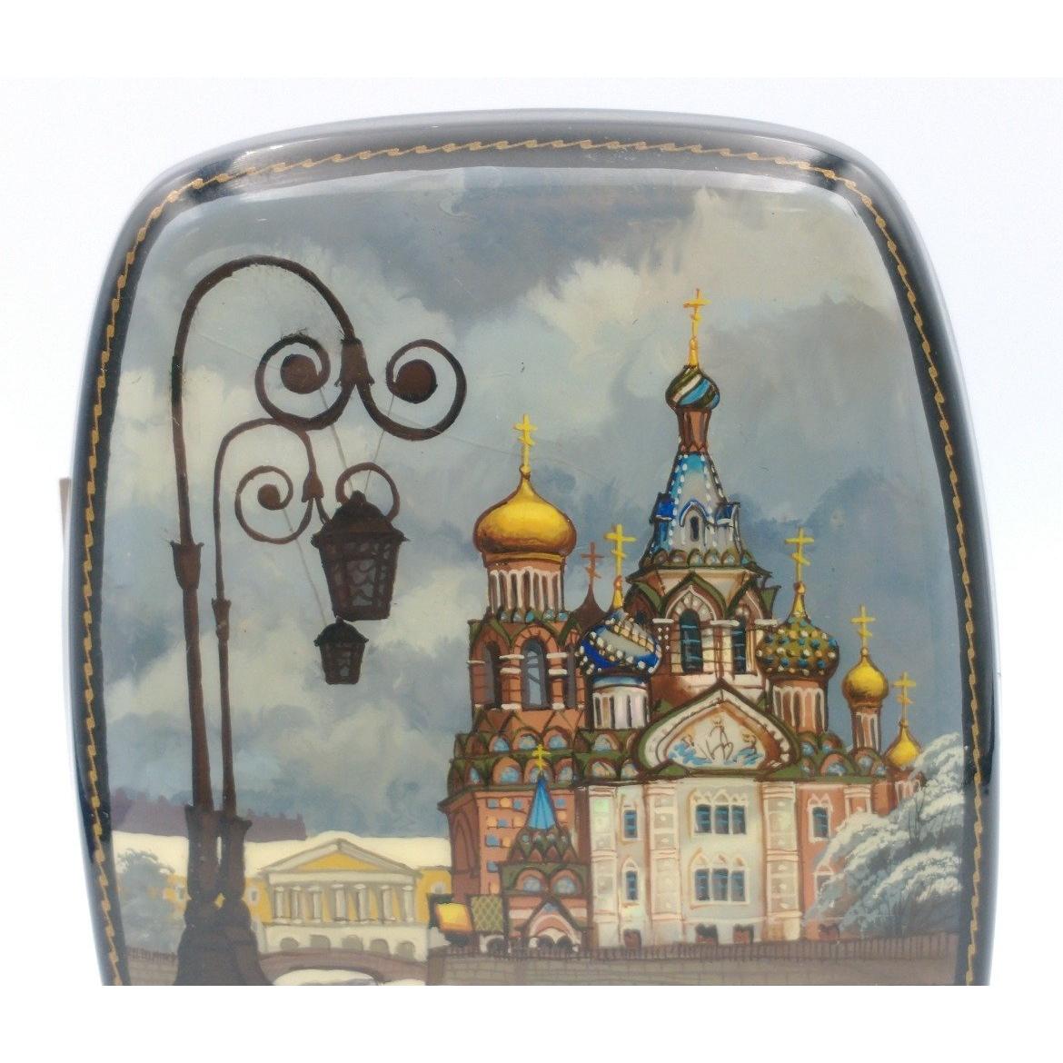 A Russian laquered snuff box with a design of St Basil's cathedral 10cm longApprox 1 pieces