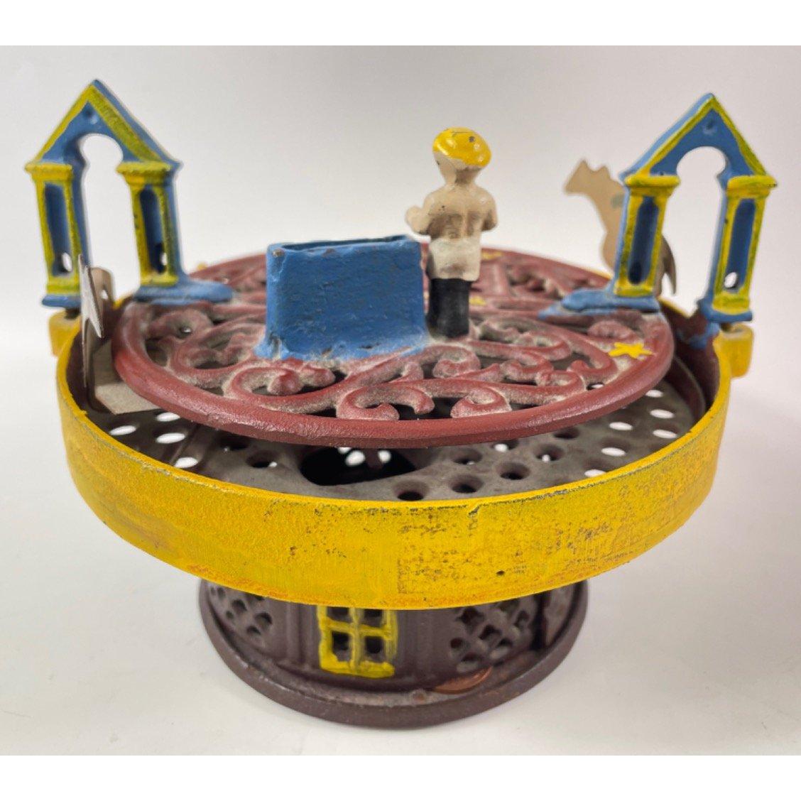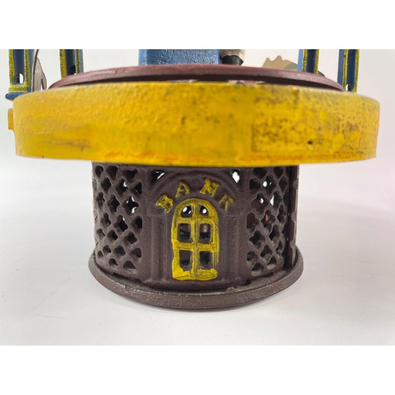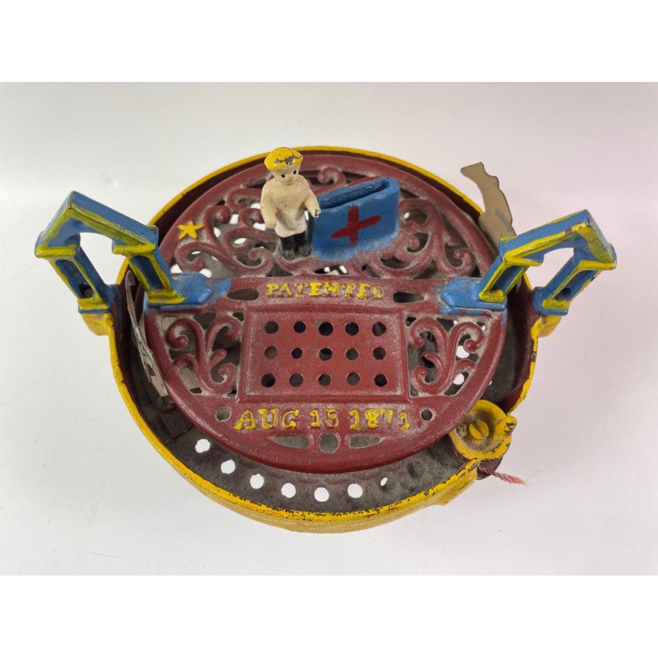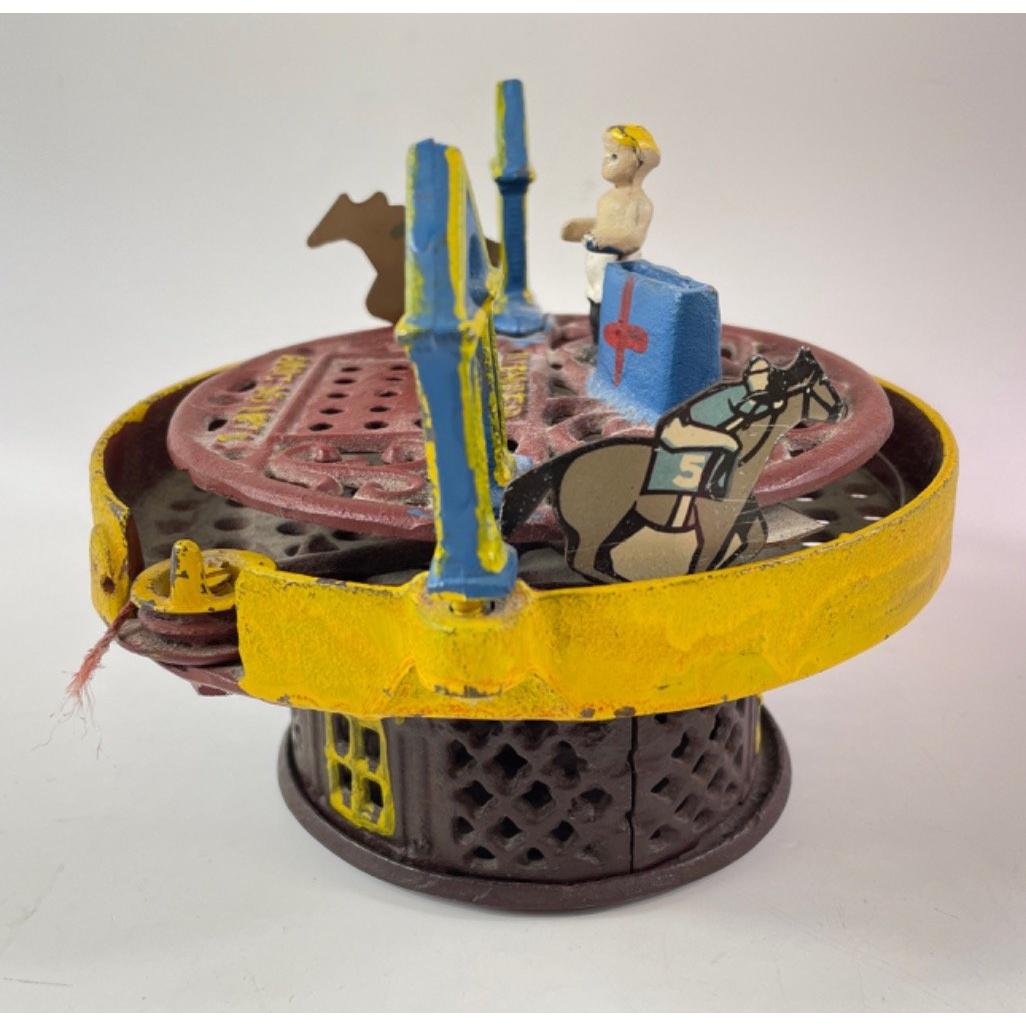 A vintage cast iron MECHANICAL MONEY BANK with horse racing to top, marked 'Patented Aug 15 1871'Approx 1 pieces