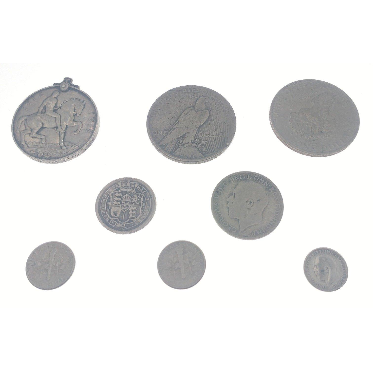 Two AMERICAN ONE DOLLAR coins 1972 and 1926, two dime coins 1937 and 1979, a GEORGE V 1914-1918 service medal belonging to Private A Stewart Camerons regiment, a 1921 George V Florin coin and a George lll 1816 silver shilling coin and a George V three pence