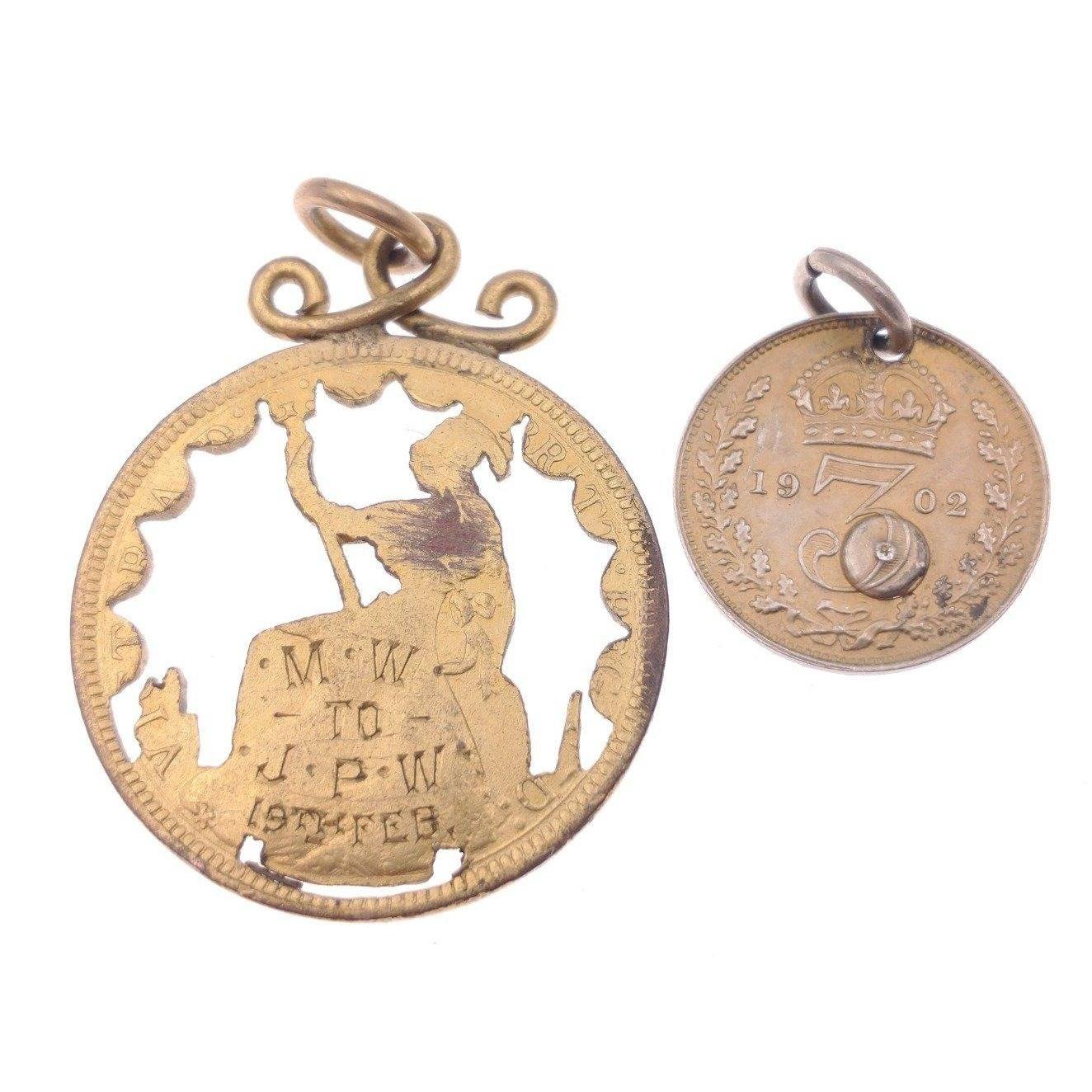 A 1909 EDWARDIAN stamped/cut-out pendant from a coin in 'yellow metal' with a charming small sapphire blue stone inset - dimension 2.5cm diameter, weight 4.32g approx with also a small gilded 1902 Edwardian three pence coin made into a pendant with a small purple amethyst style stone inset - gross weight 1.51g approx