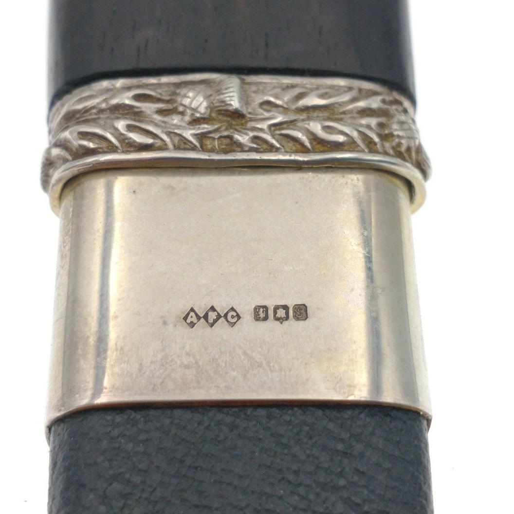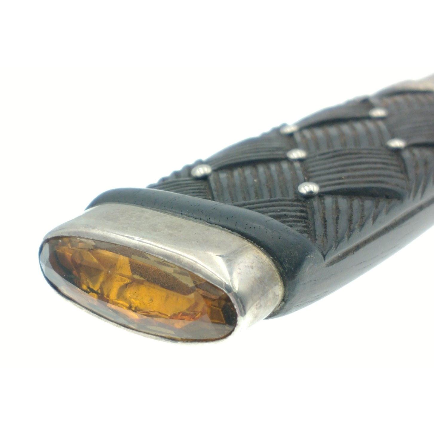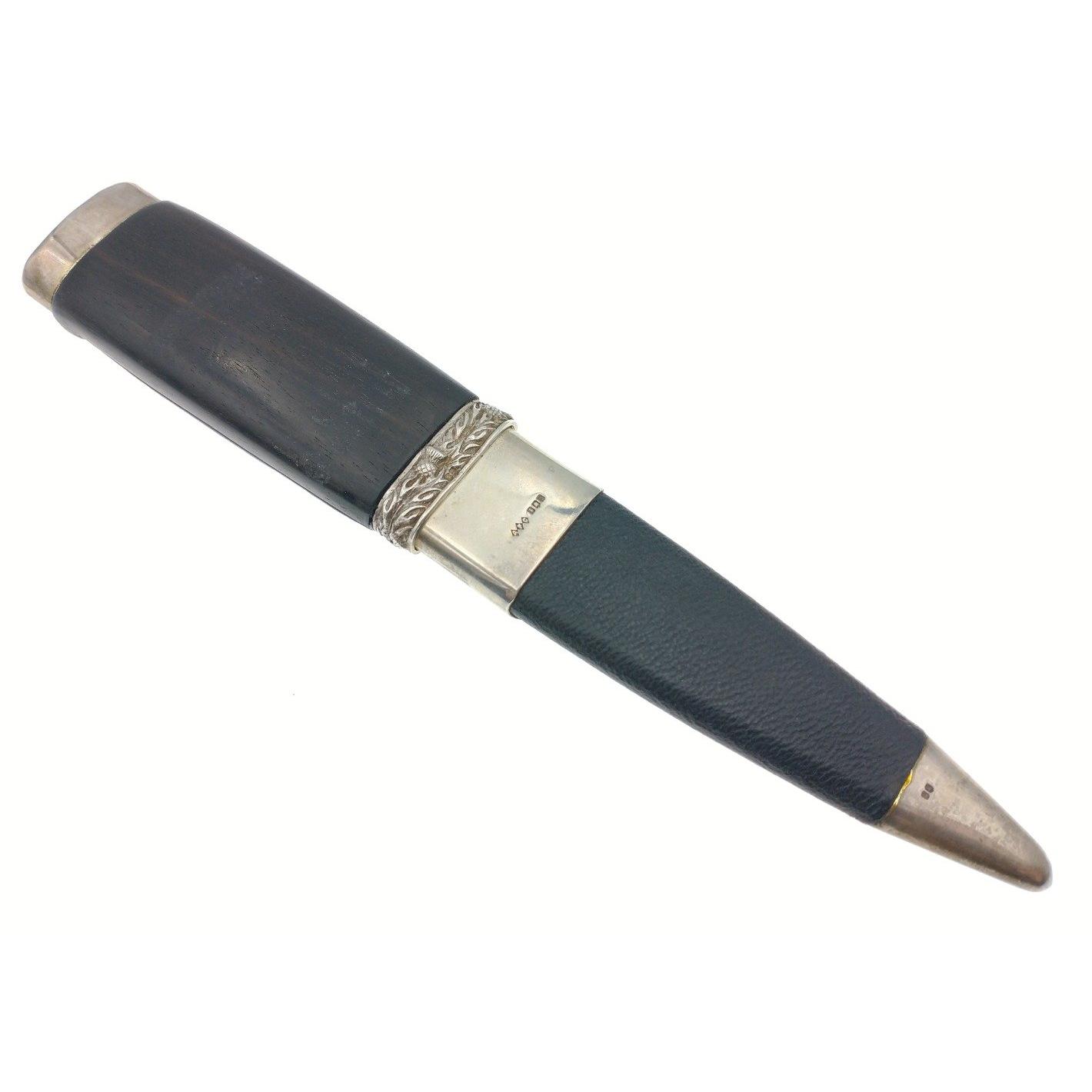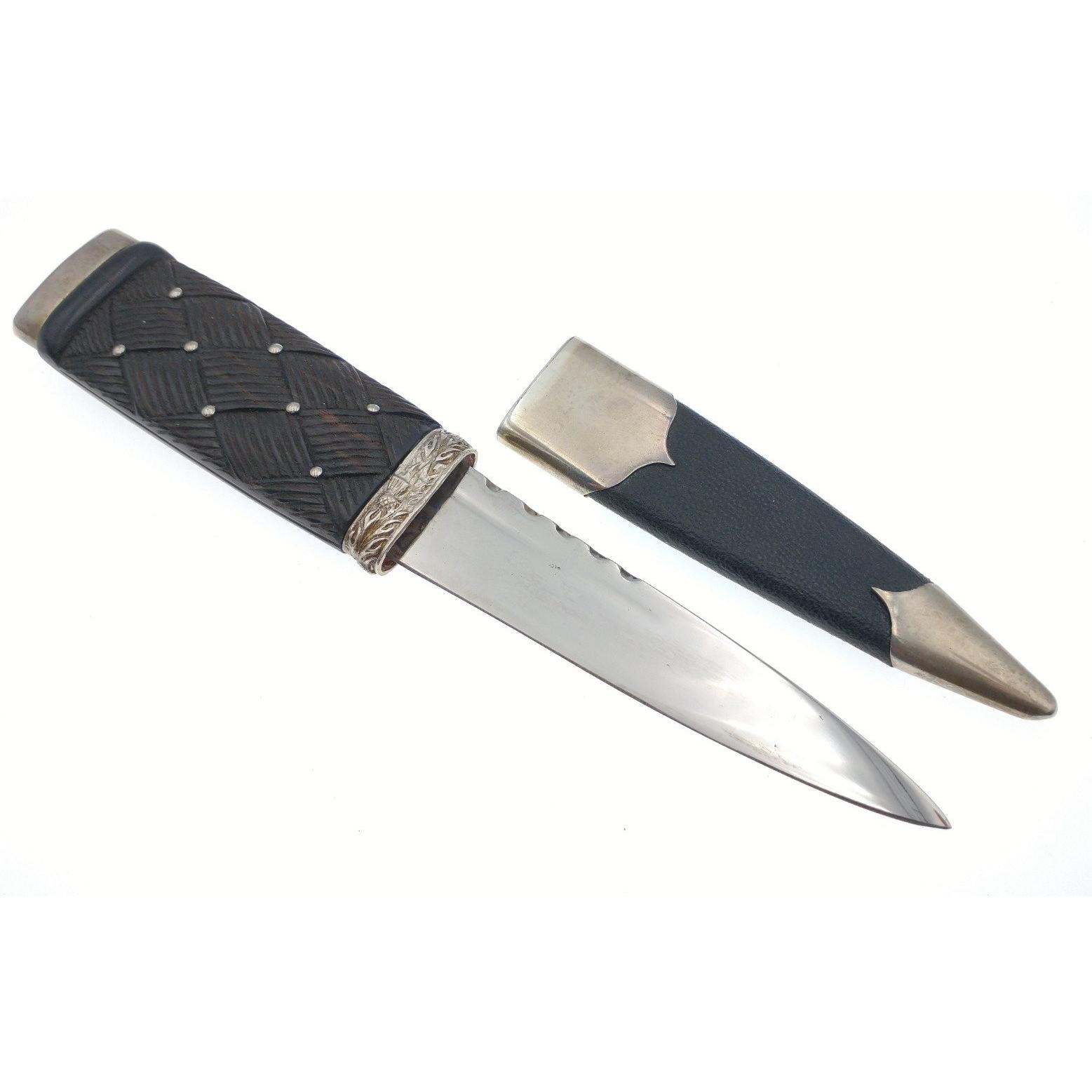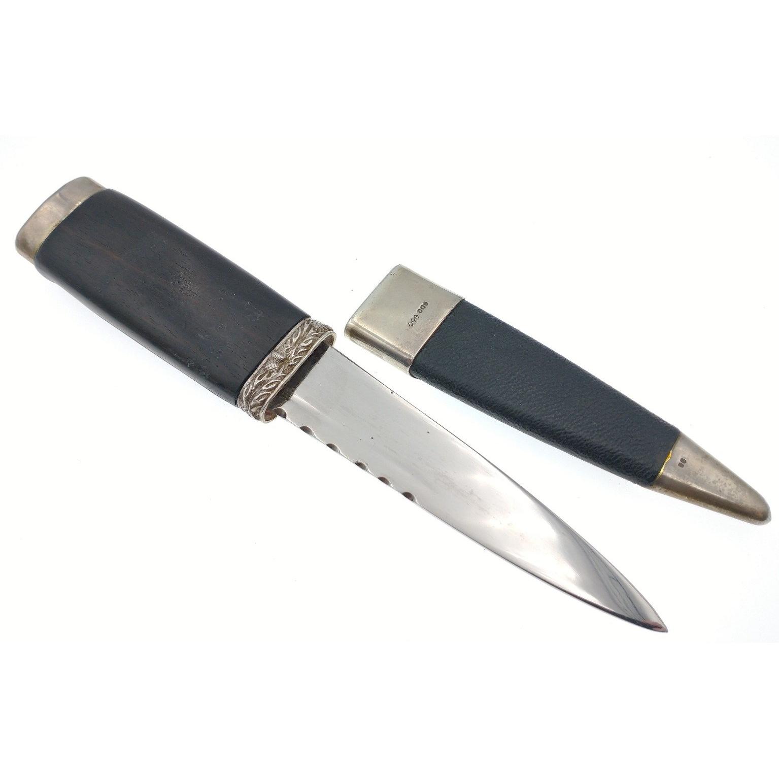 Silver Mounted Skean Dhu with inset Cairngorm stone. Hallmarks for Edinburgh 1992. Maker A.F.C. In excellent order with plain silver mounts to sheath and a rope weave effect on wood handle with studs.- 19.5cm length approx