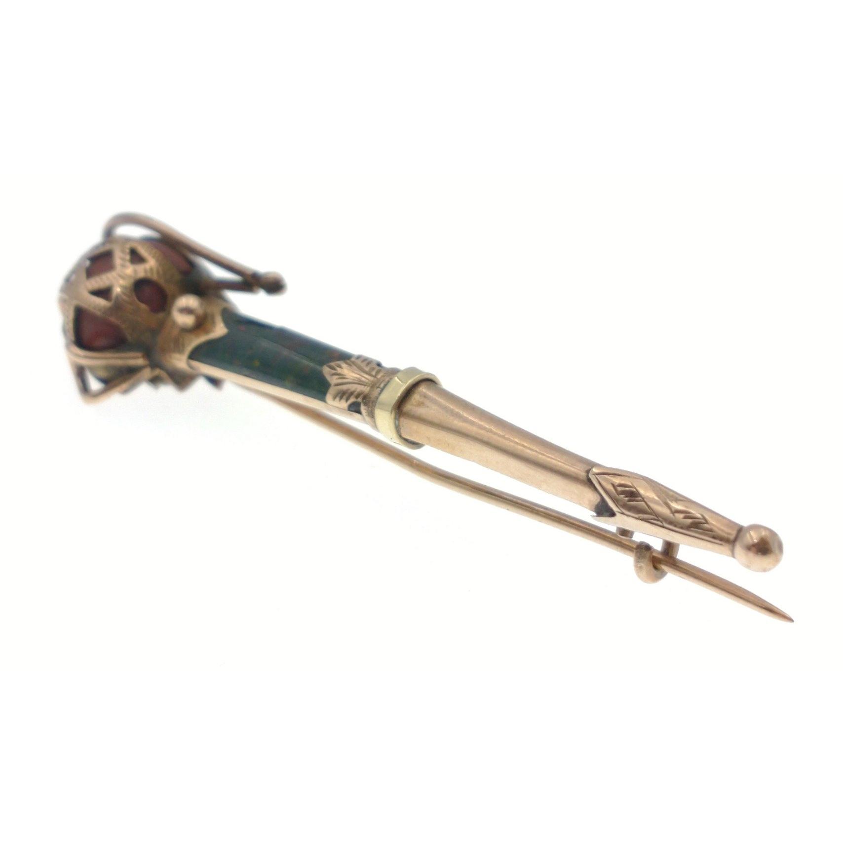 Cased Victorian Scottish Gold kilt pin. Just over 6cm with working pin. 4.6g in weight. Lovely bloodstone agate shaft No hall mark but previously tested to 15ct.