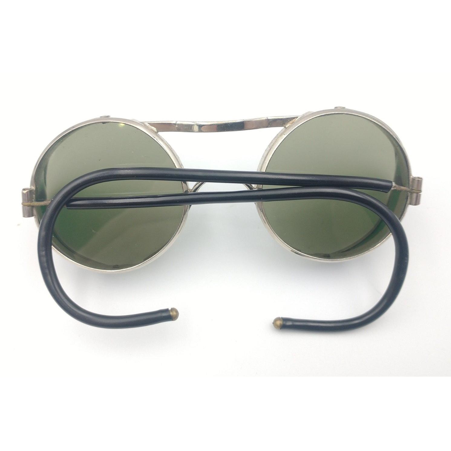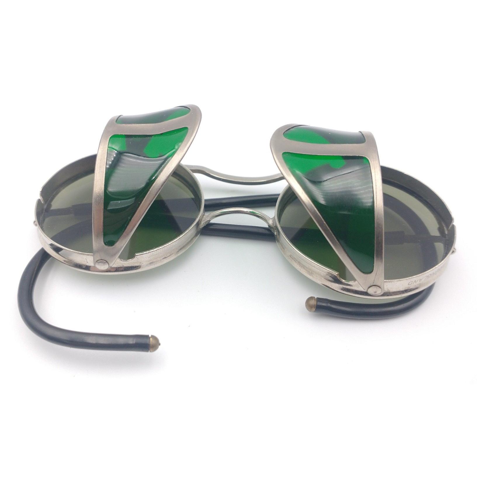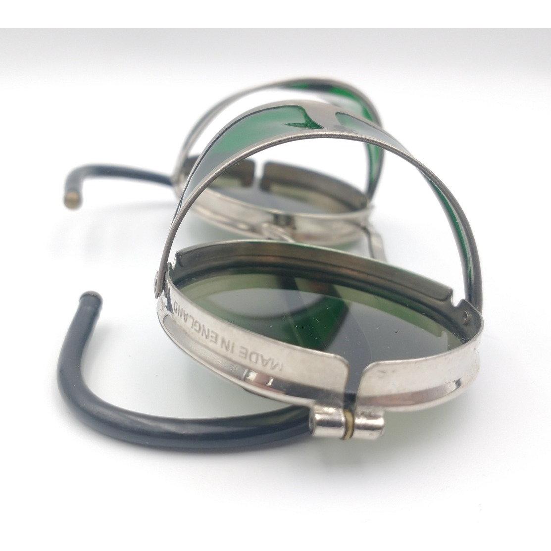 INTERESTING VINTAGE pair of INDUSTRIAL INSPIRED sunglasses with green side panels. The green side panels swivel out and the frames are stamped ''Made in England''. - dimension each lens 4.5cm diameter approx