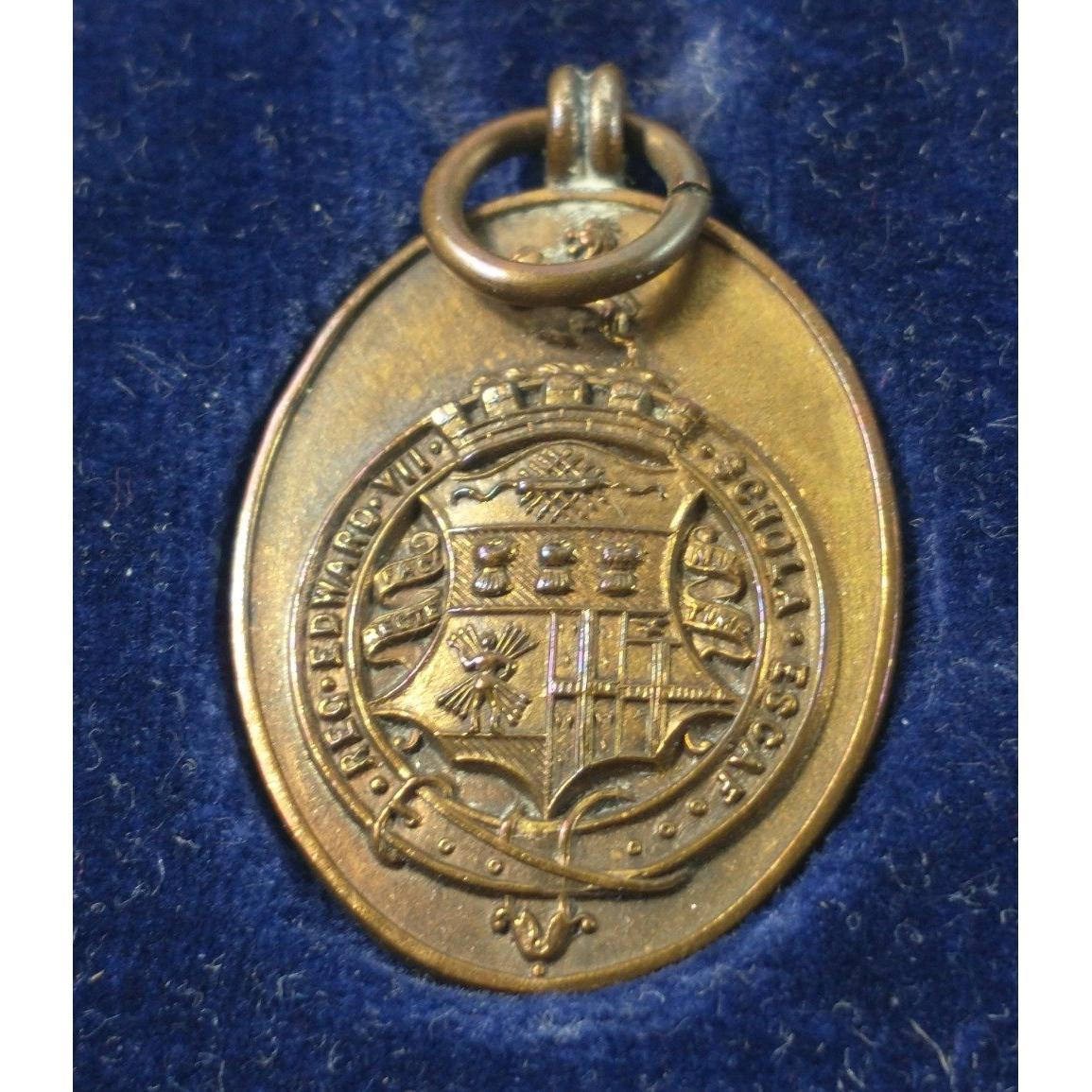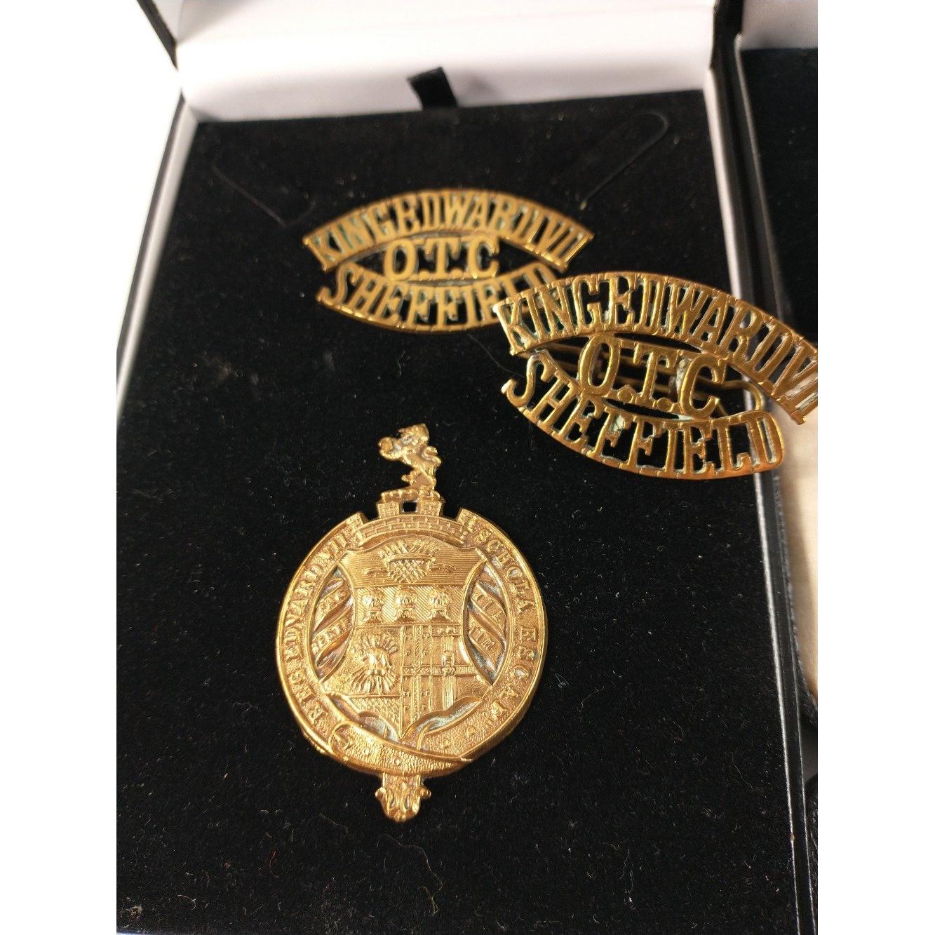 King Edward VII School Sheffield. Officers Training Corps Interest, comprising rare cap badge and shoulder tabs, Bronze School Button Hole Badge and cased running medallion. Approx 1 pieces