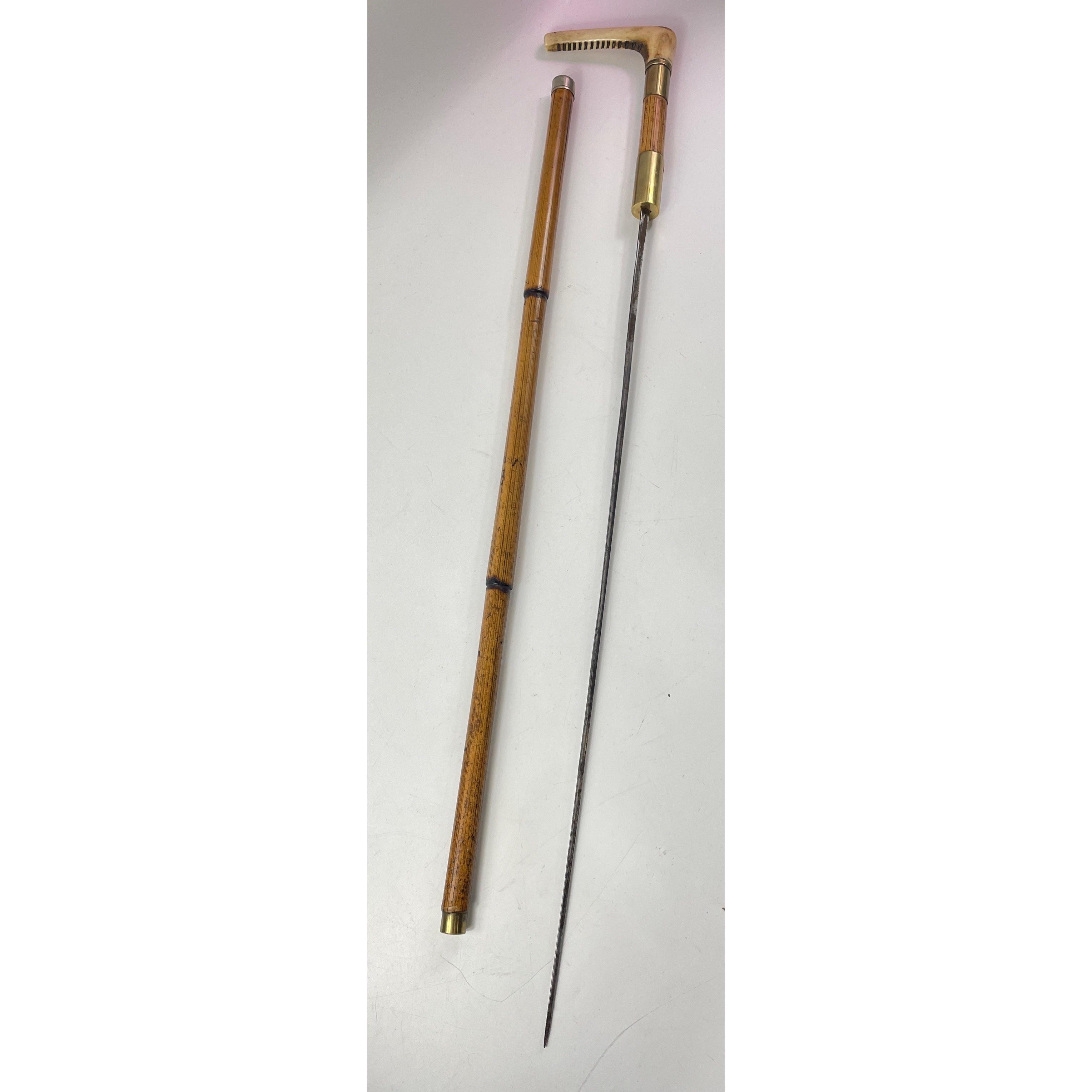 Late VICTORIAN Horn Handled bamboo shaft Sword Stick. Possible replacement ferrule. Slight issue with the fitting but the blade is original triangular style - blade length 65cm approx - 89cm total lenth - complete and rather menacing looking. Overall a very interesting and collectable piece.