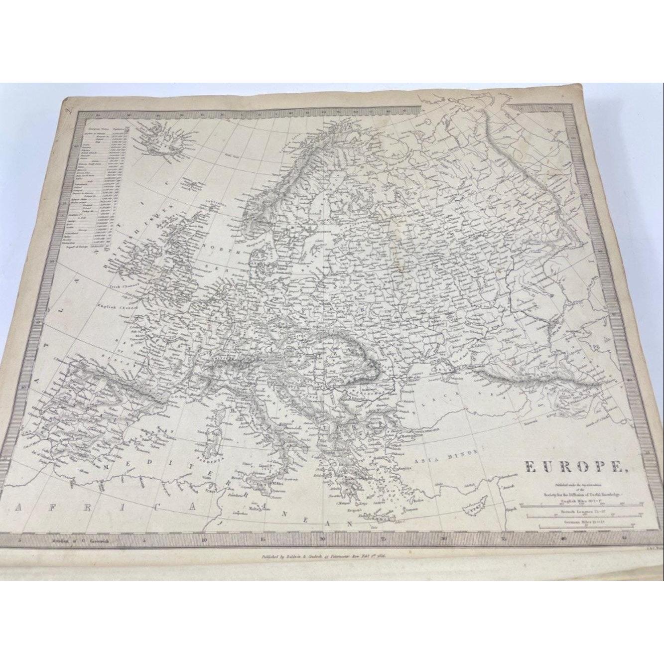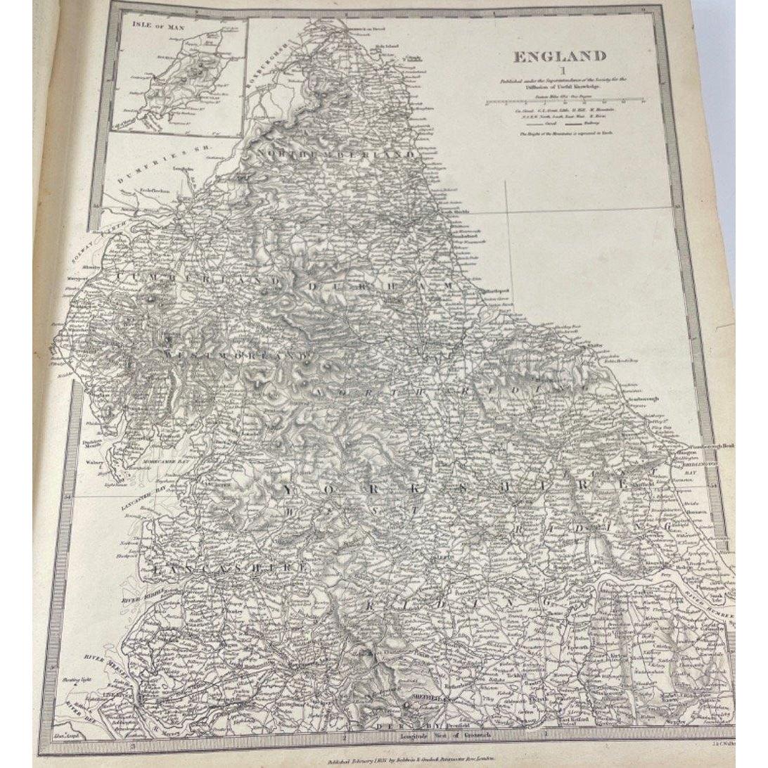1834 Atlas containing over 120 single page uncoloured engraved maps. Produced under the Superintendence of the Society For The Diffusion of Useful Knowledge (S.D.U.K.)and published by Baldwin & Cradock, 47 Paternoster Row, London. Disbound volume without boards, handwritten list of 125 maps to front stating that the volume is complete except for no. 124 Athens. Condition of maps is very good with only minor age related wear, no front or rear covers present Map 122 St Petersburg has been updated with hand written annotation ''Petrograd'' and most maps have pencilled page numbers. A very scarce volume indeed, most of these have been split with single plates, particularly of America and the World cities fetching premium prices.
