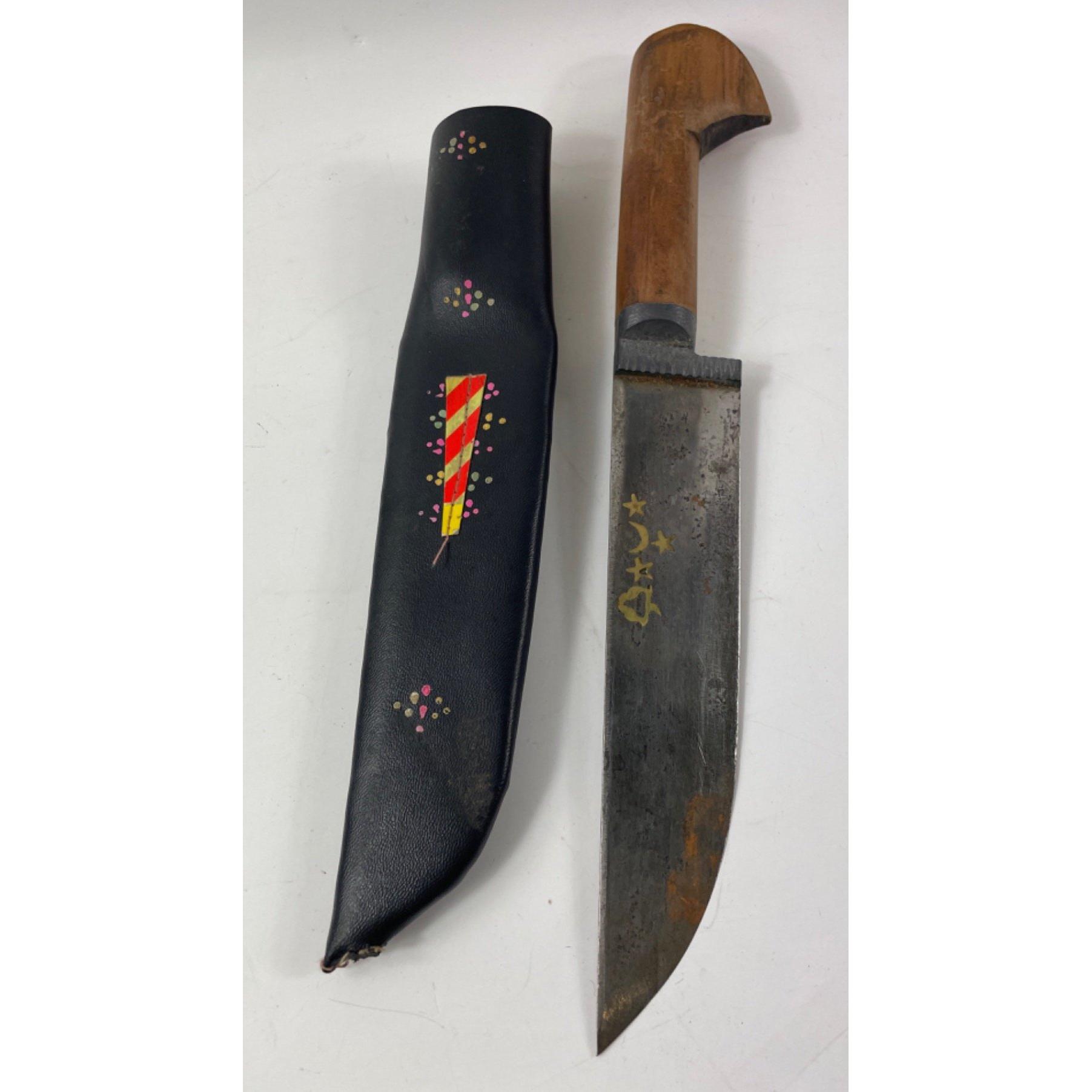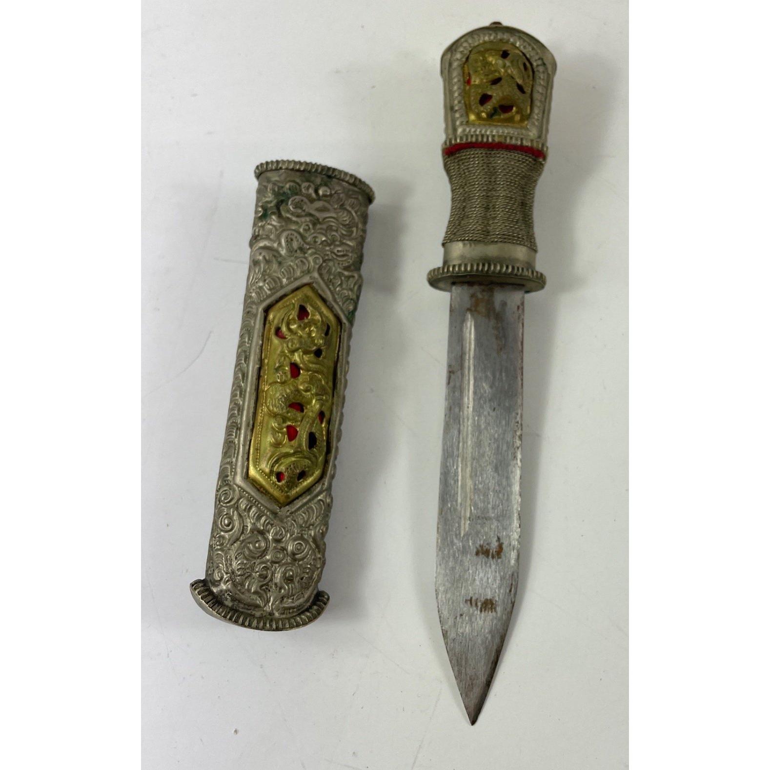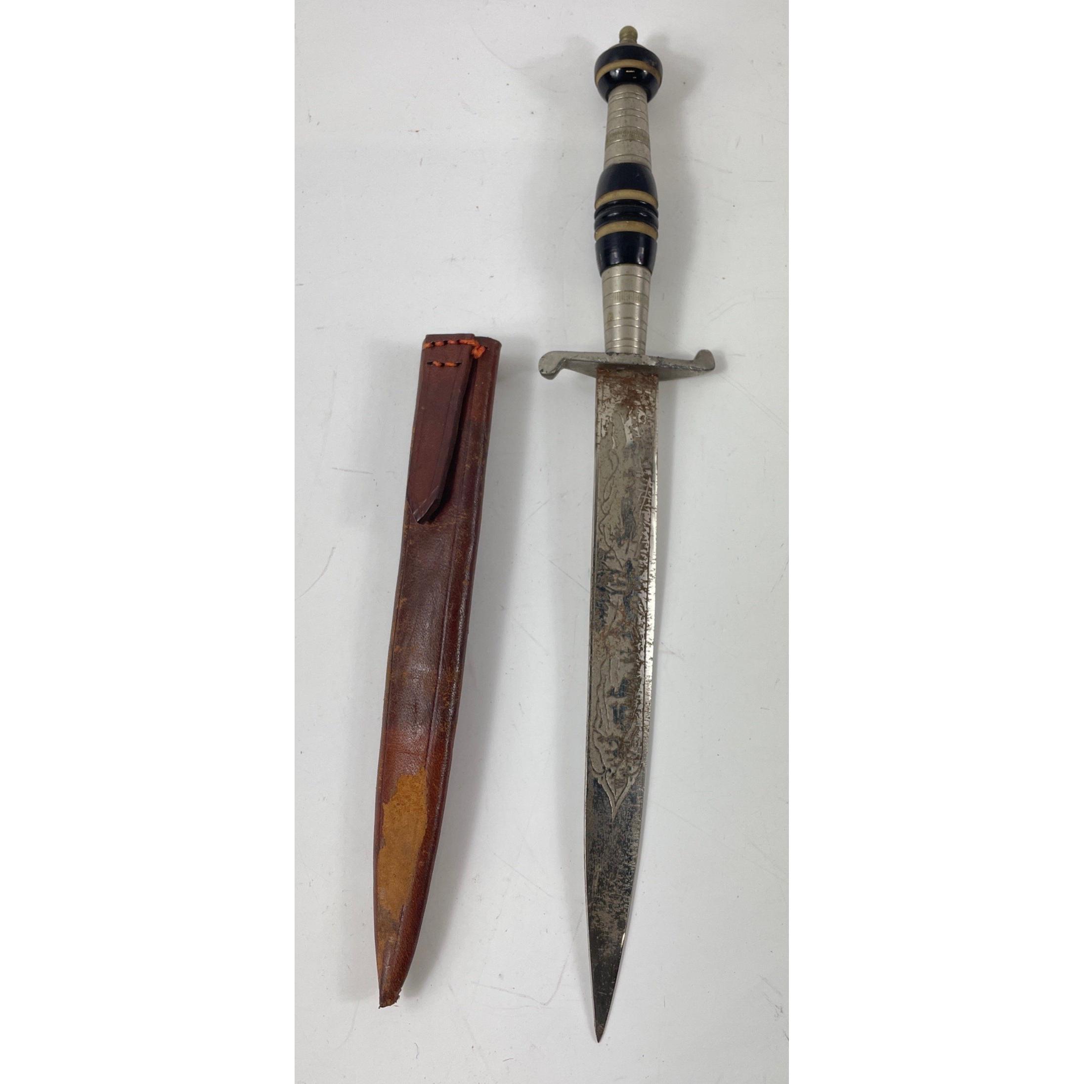 A collection of three knives, one handmade with interesting brass inlay length 32cm approx with sheath, a Far Eastern intricately carved dagger in it's scabbard length 19cm length including its scabbard , also a slimline dagger with hunting scene engraved on one side - length from handle tip to end of blade 27cm, comes with leather sheath...