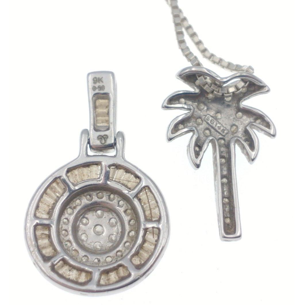 A 9k stamped white gold pendant with central small diamond(tested) gross weight 1.65g approx with also a 14k stamped white gold palm tree form pendant on a 925 stamped neck chain gross weight 2.76g gross approx