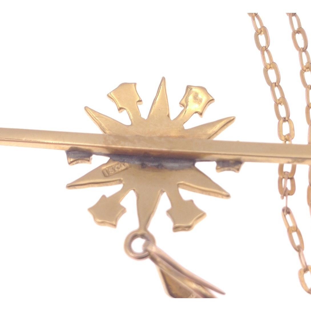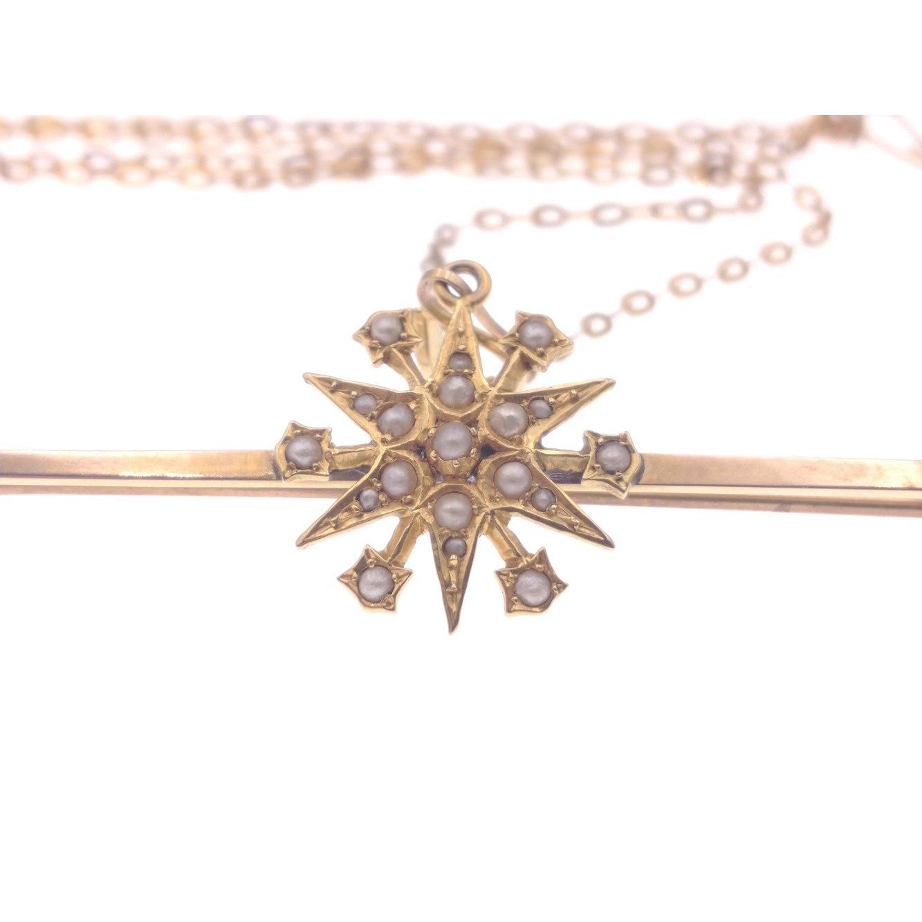 An 15c stamped bar brooch (8cm long) with seed pearls and a long yellow metal safety chain (38cm) gross weight 6.6gApprox 1 pieces