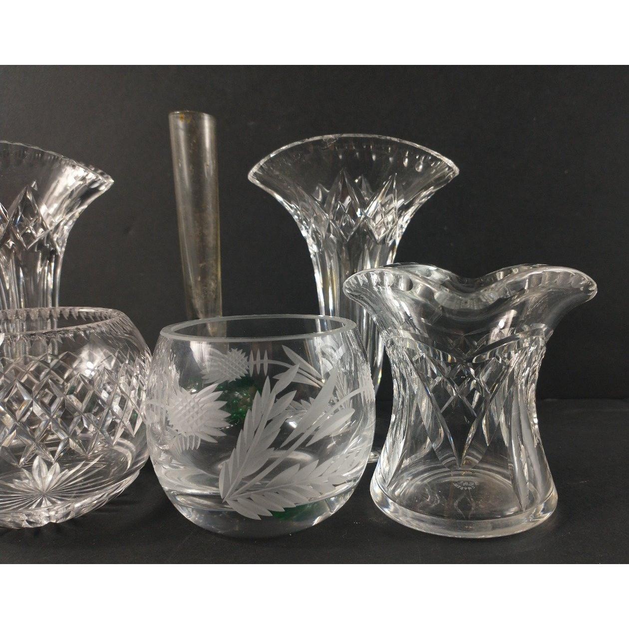 Two pairs of crystal posy vases EDINBURGH CRYSTAL pair stand 8cm high, the other 12cm (one has 2 small chips from rim), plus 2 small bowls each 6cm tall, one with etched thistle design and a green based bud vase