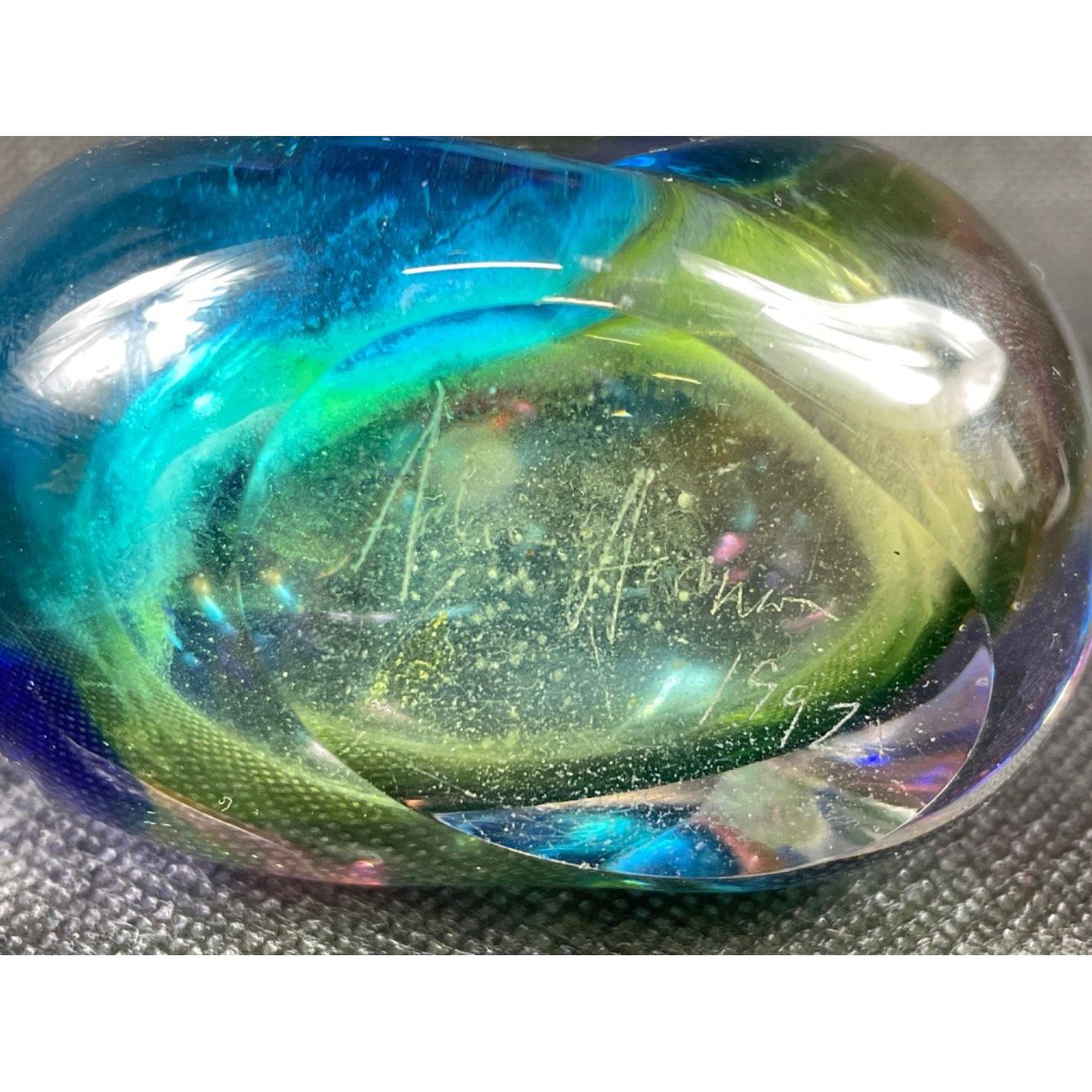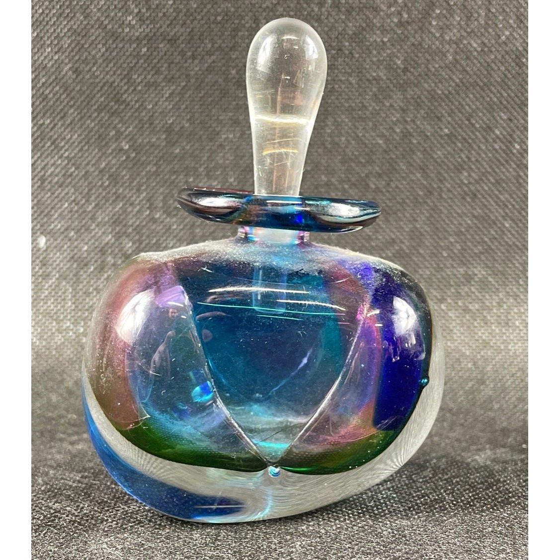 Two perfume bottles with stoppers - the first in clear glass from Czechoslovakia (16cm high), the other (10cm) in shades from blue through to red is signed to the base and dated 1992, plus 2 green glass ornaments (8cm and 7cm tall), and a heavyweight glass owl paperweight (12.5cm tall)